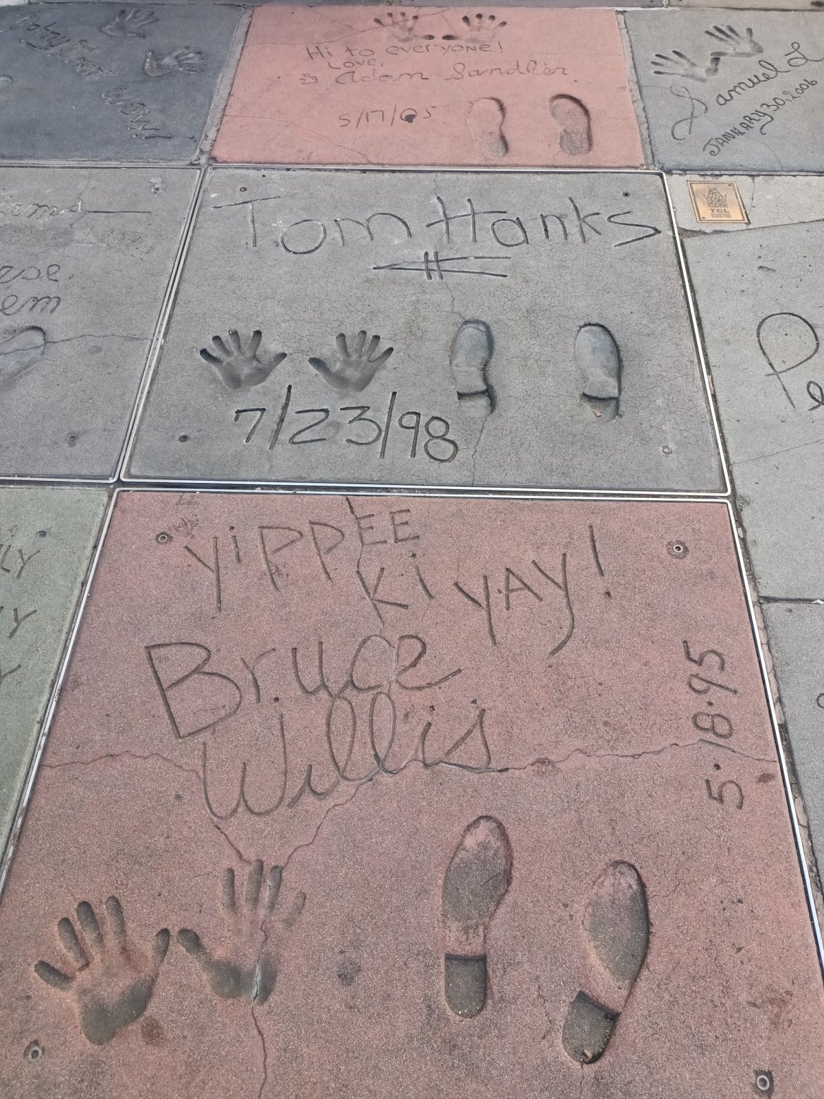 Další zastávka – Hollywoodský chodník slávy.. prošli jsme ho celý, po obou stranách.. celkem cca 6 km, kdy jdete s hlavou sklopenou a neustále čučíte pod nohy a čtete si jedno jméno za druhým ⭐ Už po pár metrech se to omrzí, ale my byli důkladní 😉 Nejzajímavější kus chodníku (a také nejvíce natřískaný lidmi) je před Čínským divadlem (TCL Chinese Theatre), kde jsou na zemi kromě hvězd i otisky rukou a vlastnoručně psané vzkazy oblíbených herců.. to se mi moc líbilo! 🐾