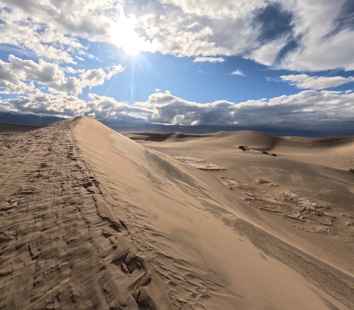 Kochali jsme se už od první zastávky na vyhlídce Father Crowley Vista Point a pokračovali celou cestu po silnici 190 až k písečným dunám Mesquite Flat Sand Dunes 🏜️ U nich jsme zaparkovali a pěkně po svých vyrazili zdolávat písečné peřeje.. jakmile jsme nechali za zády turisty v žabkách, kteří se motali jen 30 m od parkoviště, otevřela se před námi třpytivá měsíční krajina 💫