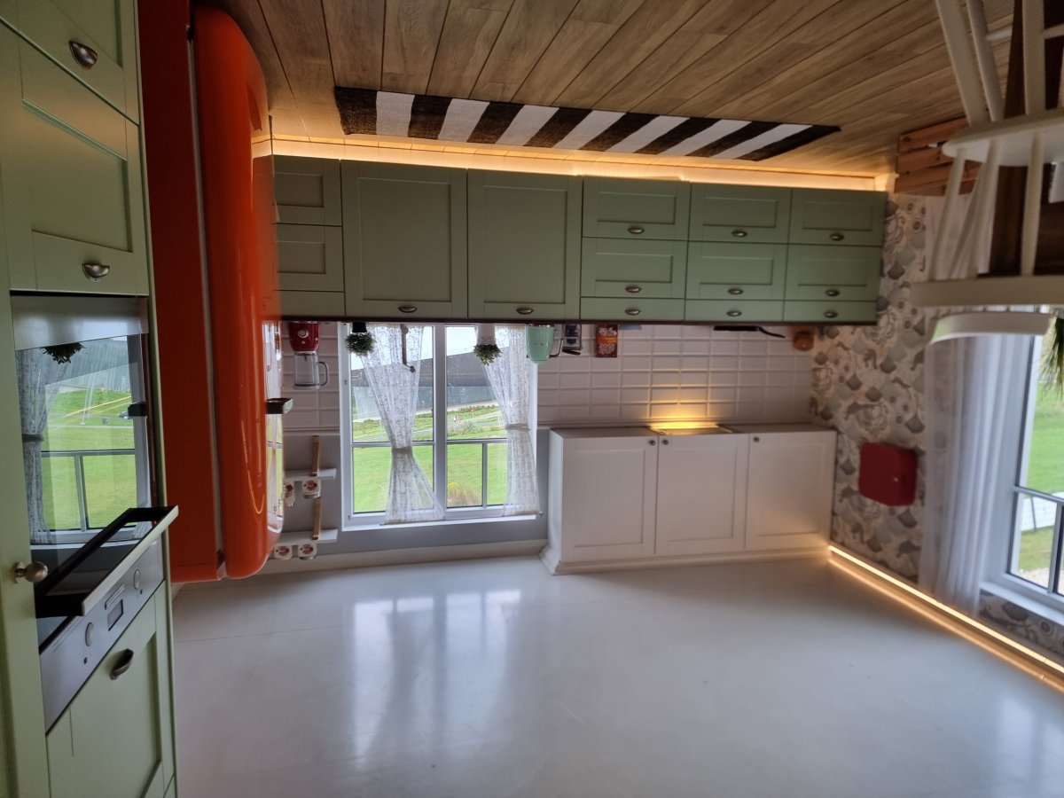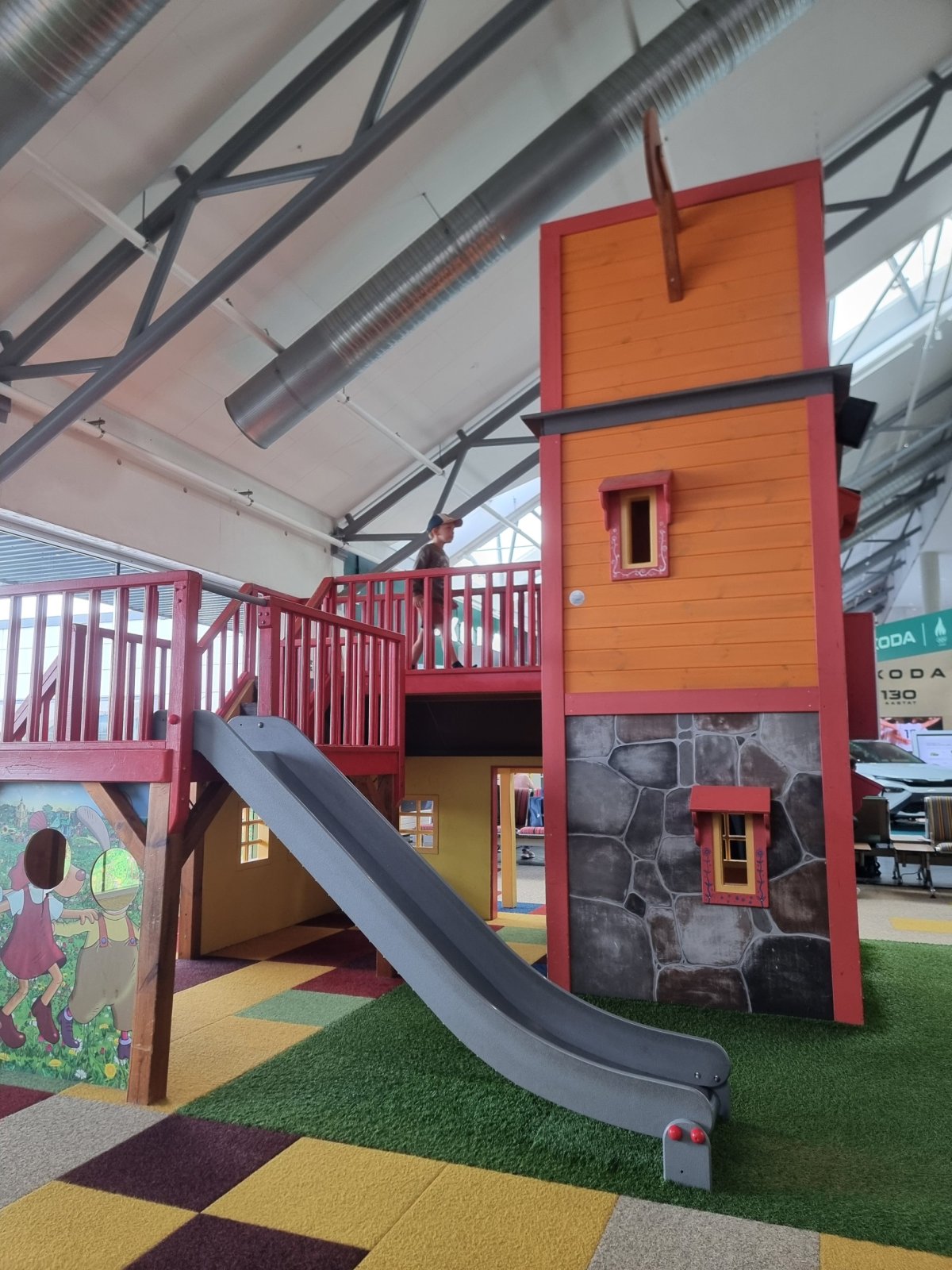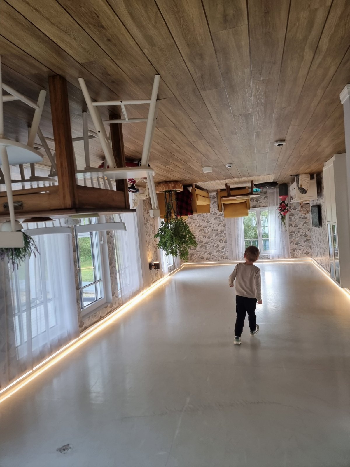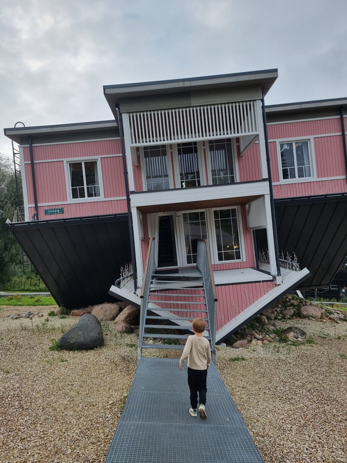 Další více než hodinu dlouhá cesta nás vedla do Tartu, univerzitního města na jihu Estonska, a do domu Tagurpidi Maja - (reklamní) dům postavený developerskou společností, který je hlavou dolů. Že bych nutně musel platit oněch 16 € za vstup pro oba, to asi ne, ale J. se na tohle opravdu těšil. Uznávám, že uvnitř to bavilo i mě, byť tedy asi o 20 minut kratší dobu než J., který si s hlavou dolů obrácených krovů udělal klouzačku.