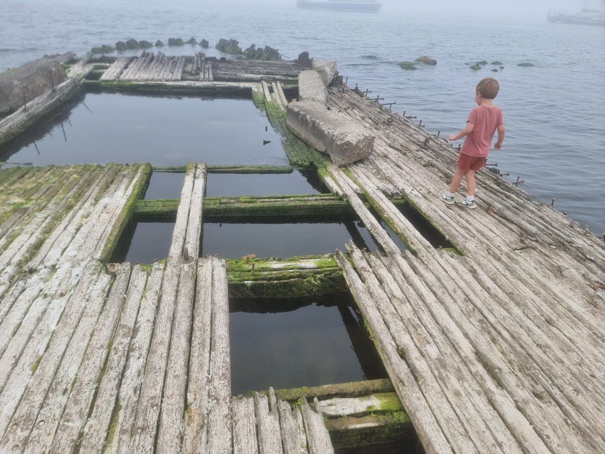 Přes nově postavené čtvrti u moře s kavárnami na každém rohu a cyklostezkami jsme se prošli až k Tallinna Linnahall, brutalistní stavbě vybudované při příležitosti olympijských her v Moskvě 1980, protože právě tady se uskutečnily soutěže v jachtingu. Opotřebovanost a vcelku pochopitelná neochota do záchrany téhle obludy investovat je evidentní, ale jako připomínka ne až tak dávných časů a hlavně tedy jako místo, odkud je moc hezký výhled na moře na jednu stranu a na město na stranu druhou také stojí za návštěvu. J. se chtěl vykoupat v moři, takže jsme se vrátili do hotelu pro ručníky a zase na pláž, jen se mezitím přivalily pořádné chuchvalce mlhy a znatelně se ochladilo. Když už, tak už, řekli jsme si, a aspoň to jedno ponoření do Baltu jsme si přece jen neodpustili. Hned vedle pláže bylo torzo vraku lodi. Tramvají jsme potom dojeli do vyhlášené burgerové restaurace Burger Brothers, tu můžu jen doporučit (hranolky s masem a čedarem, burger s hranolky, pití celkem za 17 €).