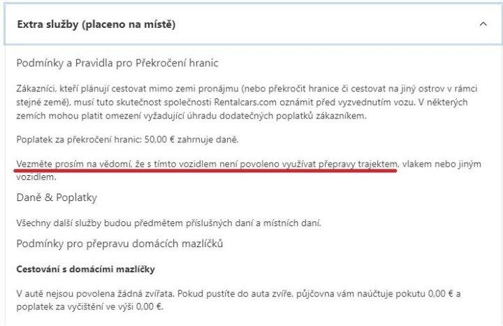 Už si přesně nevzpomínám, které půjčovny to byly. Auto jsem nakonec vzal od Greenmotion v době, kdy jsem věděl, že na ostrov Saaremaa stejně nebudu mít v programu prostor. Ale porovnával jsem toho víc. Je fakt, že u nich to v podmínkách taky nevidím, zmiňují jen extra poplatek za využití trajektu. Níže například Car4rent má využití trajektu výslovně zakázáno, podobných případů jsem viděl více. Ale asi je správné říct, že některé půjčovny to zřejmě umožňují, například Hertz, který zmiňuješ. Ještě upřesním, že auto jsem si půjčoval v Lotyšsku, do Estonska jsem pak následně přejel.