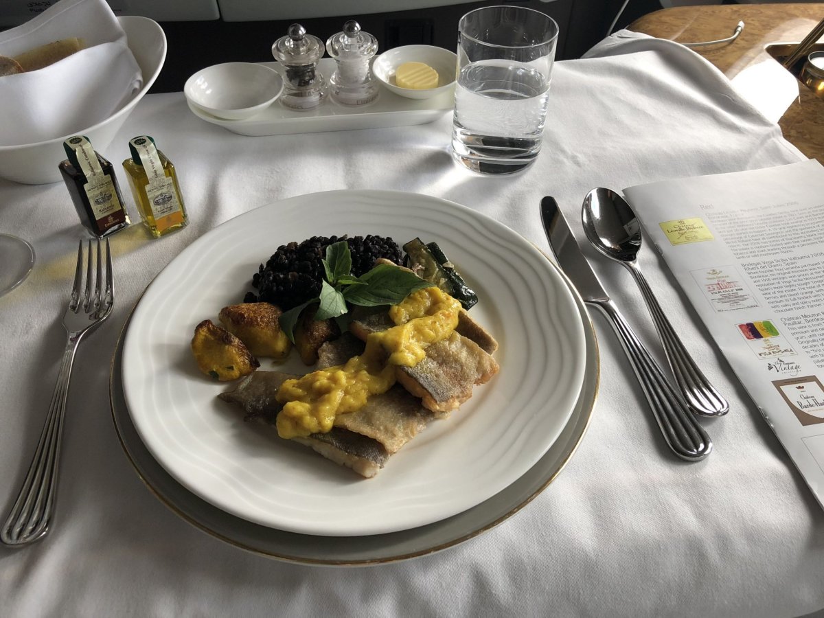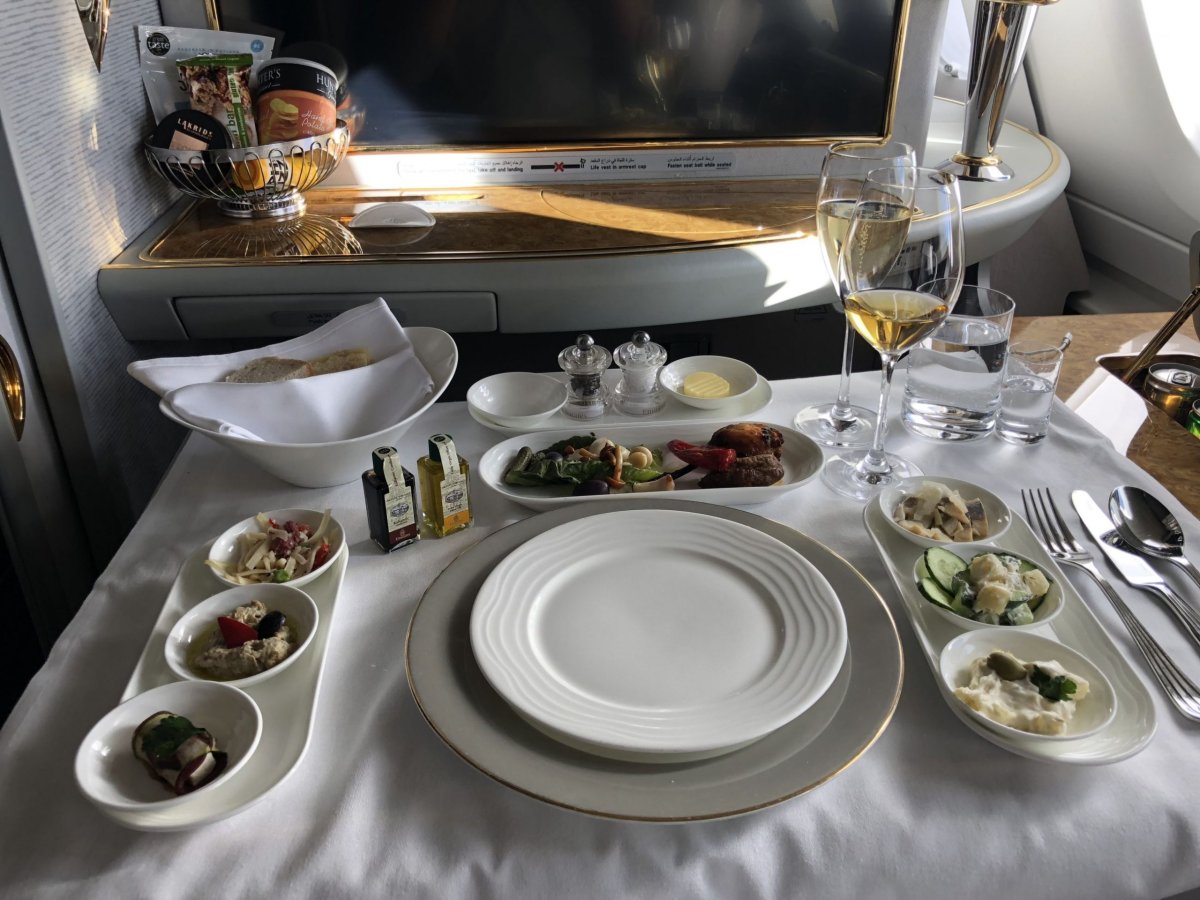 Posádka mne vítá a oslovuje jménem. Zanedlouho přichází Spa manažerka, která mi nabízí možnost rezervace sprchových lázní přímo za letu. Na chvíli za sebou zavírám dveře mé suity a užívám si soukromí. Další letuška Nicole z Francie přichází s jídelním a nápojovým lístkem včetně neomezené konzumace prémiových nápojů během celého letu. Nabídka „à la carte“ je velmi široká 7 druhů předkrmů, 5 druhů hlavního jídla, 3 sladké dezerty a navíc degustace 5 druhů výborných sýrů ze Španělska, Nizozemska, Francie, Německa a Anglie. Na řadu přichází předkrmy íránský kaviár, kousky konfitované kachny a tygří krevety. Vše najednou je servírováno na porcelánu značky Royal Doulton s exkluzivními designovými příbory od britského návrháře Roberta Welche. Připojuji se na wifi, která je během letu samozřejmostí a sdílím své zážitky s domovem.