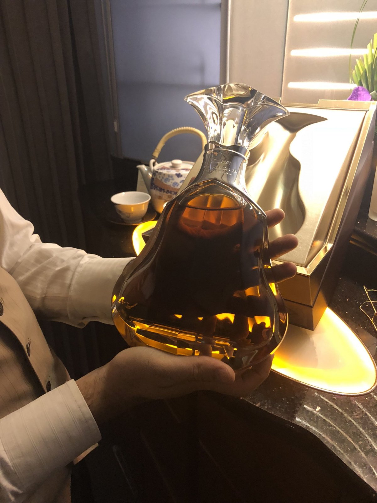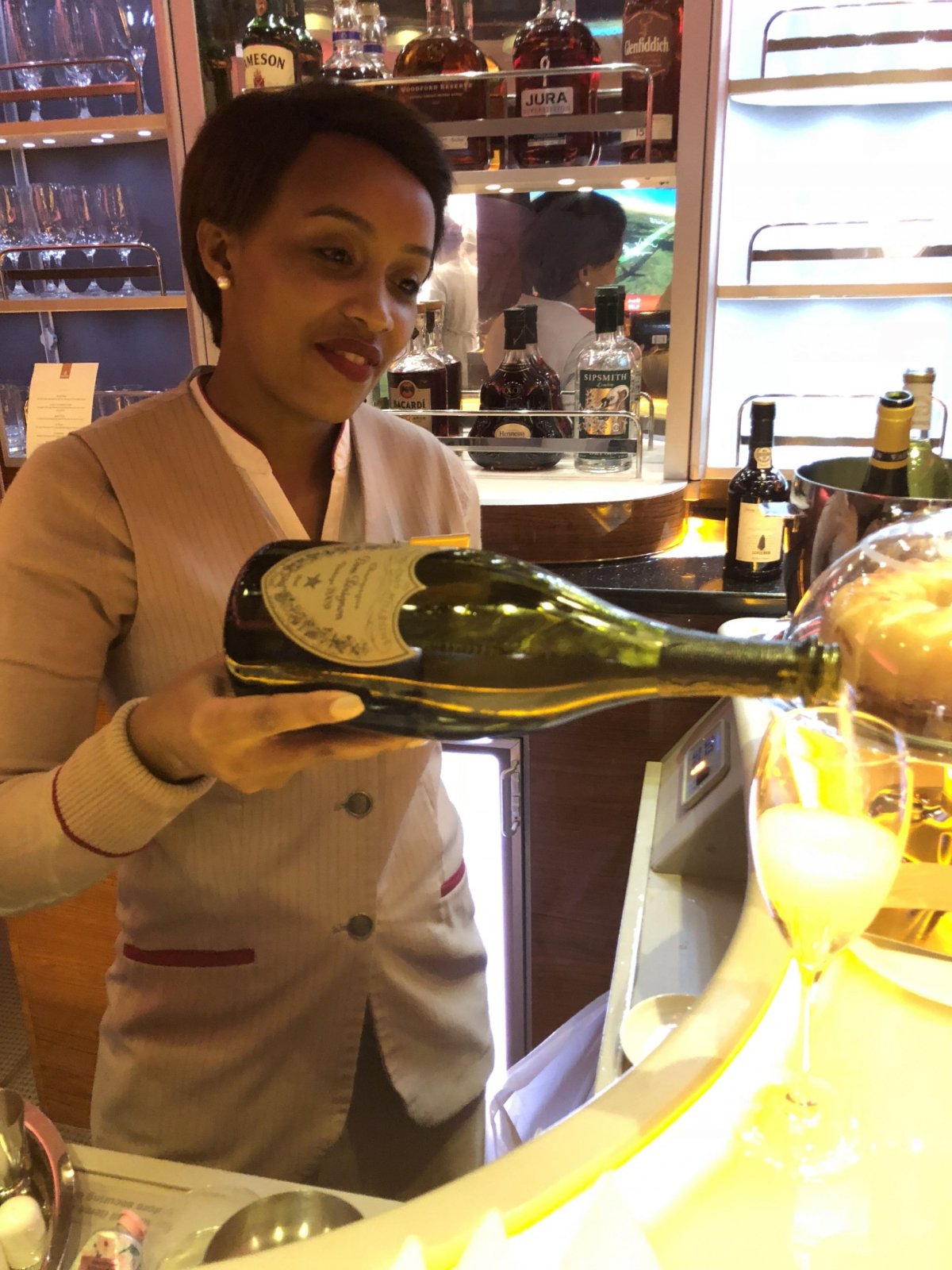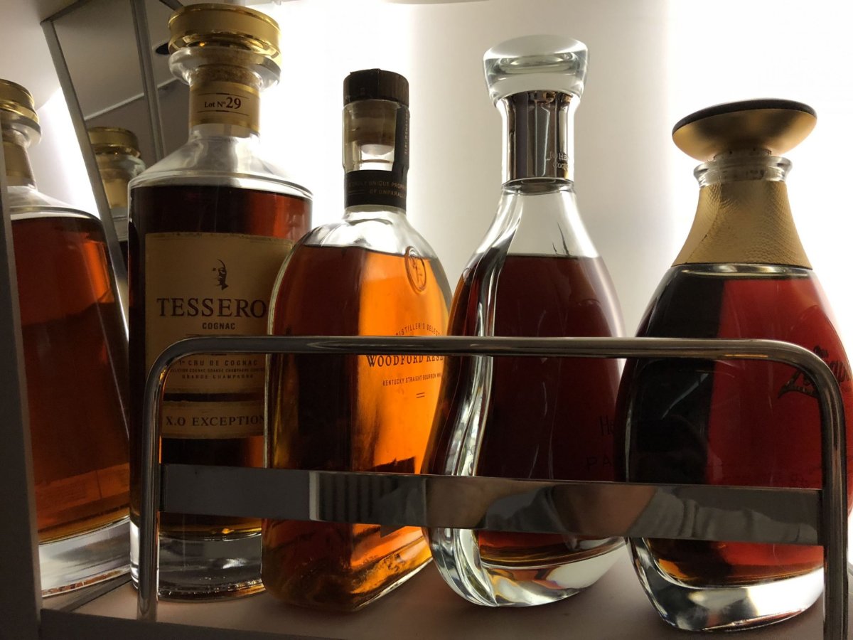 Posuvné dveře mi zajištují naprosté soukromí, abych se mohl uvolnit ve vlastním světě. Nabídka nealko i alkoholických nápojů je tou nejpestřejší na světě! Součástí je neomezené konzumace jednoho z nejdražších koňaků Hennessy Paradise a Hennessy Paradise Imperial, který ve vzduchu nabízí pouze Emirates. Degustovat mohu i exkluzivní vína. Na výběr mám neuvěřitelných 14 různých druhů vín. Bílých, červených i dezertních převážně z Francie, po jednom z Itálie a Španělska. Nejexkluzivnější kousek, který se cestujícím ve First Class nabízí, je francouzské červené z oblasti Bordeaux - Chateau Mouton Rothschild 2001, cena lahve se pohybuje těsně pod 13 000 Kč. Další ročníky přímo této značky převyšují mnohdy cenu i desítek tisíc za lahev.