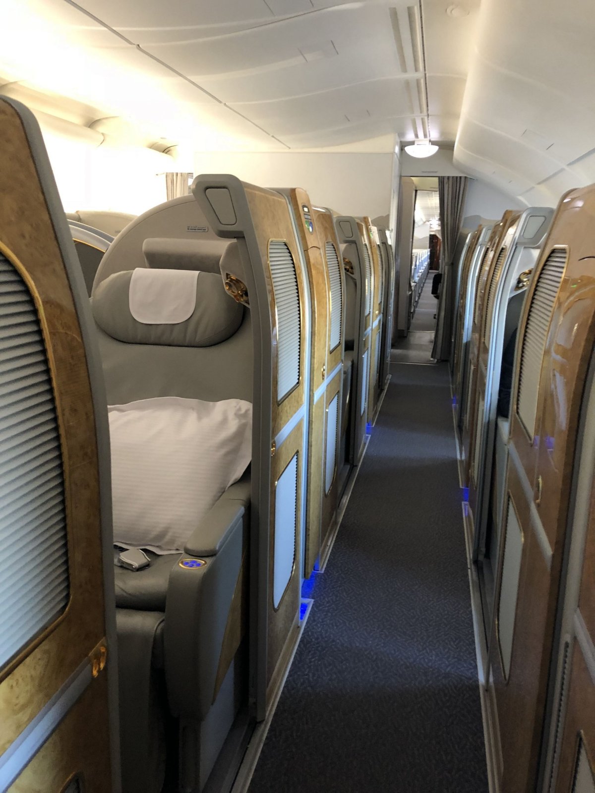 Jsem uvnitř, vstupuji do jedné z exkluzivních kabinek kterou jsem si rezervoval Private Suite 2K. Po usazení sympatickou letuškou Wilter z Keni si vychutnávám sklenku exkluzivního šampaňského Dom Pérignon 2009. Kapitán hlásí povolení ke startu, vzlétáme. Po vystoupání do optimální letové hladiny začíná „óda na radost“. Z Prahy do Dubaje v této třídě pro 14 cestujících, cestuji úplně sám. Další náhodou je, že do Prahy přiletělo pouze rok staré letadlo, které má v zadní části nově navržený bar ve stylu Mercedes design. Mám tady tolik prostoru, jako pode mnou 76 cestujících v ekonomické třídě. K dispozici jsou sedadla široká 78centimetrů a sklopitelná do vodorovné polohy. U každého místa je elektrická zásuvka, dva porty USB a extra velký stůl poskytující pracovní plochu.