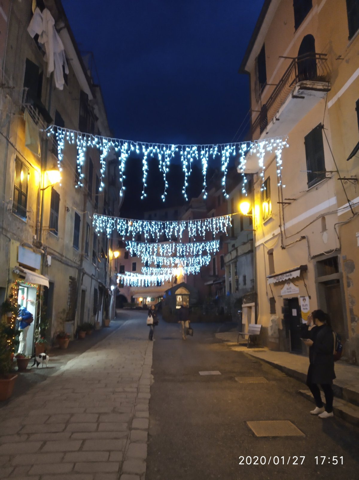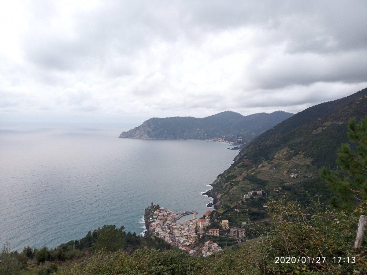 Odpoledne už mířím ze Spezie do oblasti Cinque Terre. Celodenní jízdenka do Cinque Terre stojí 13 Euro. Vystoupím v Monterosso al mare. Nejdřív se kochám chvíli u moře, protože svítí sluníčko a je celkem i teplo. Pak se vydám nahoru po červené, trochu do hor, ať vidím Cinque Terre seshora. Jenže už od začátku tuším, že jdu špatně:). Takže takhle bych do Vernazzy dorazila za týden. Počasí se kazí, fouká a zatahuje se. Přede mnou klikatá nekončící silnice, zkusím stopovat. Třeba se trochu posunu dál. Za chvíli mi zastaví mladý pár z Číny, který tu také cestuje. Jsem šťastná že mě kus svezou. Nechám se vyhodit nad Vernazzou u pěkného kostelíku s tím, že dolů to bude určitě v pohodě:). Pokochám se úchvatnými pohledy dolů na městečka zařezaná do skalisek a hledám stezku dolů. Samozřejmě to tak v pohodě nebylo. Nejdřív se ztrácím v olivovnících a když už konečně scházím dolů, stmívá se, stezka je mokrá a klouže to. Dole zjistím, že tato stezka je uzavřena, právě z důvodů uklouznutí. No naštěstí jsem to zvládla a ve Vernazze nacházím nádraží, odkud se vracím do Spezie, kde mám ubytování.