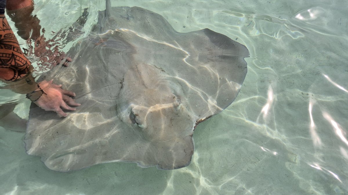 Ráno nás čakal výlet Teremoana Tours cez spoločnosť Chez Nono (10.000 XPF) booknute emailom na hinaleverd@gmail.com. Lodička nás povozila okolo celého ostrova s rôznymi šnochlovacími zastávkami, kde sme videli raje s bodkami - "spotted eagle ray“, potom veľká raja „Reef Mantra Ray“ a znova zastávka s klasickými rajami a žralokmi, ktoré sme už videli na výlete na Moorei. Potom sme zastavili na motu a tam nám naši sprievodcovia pripravili mega výborný obed s miestnymi jedlami - kokosový chleba, poison crue a grilovane mäso. Toto bola naša druhá a posledná príležisť, kedy sme mohli ochutnať miestne špeciality. Sprievodcovia nám ukázali ako upliesť z listov palmy tanierie alebo ako rozbit kokos. Mali sme čas sa aj okúpať a znova plávať s „klasickými“ rajami.