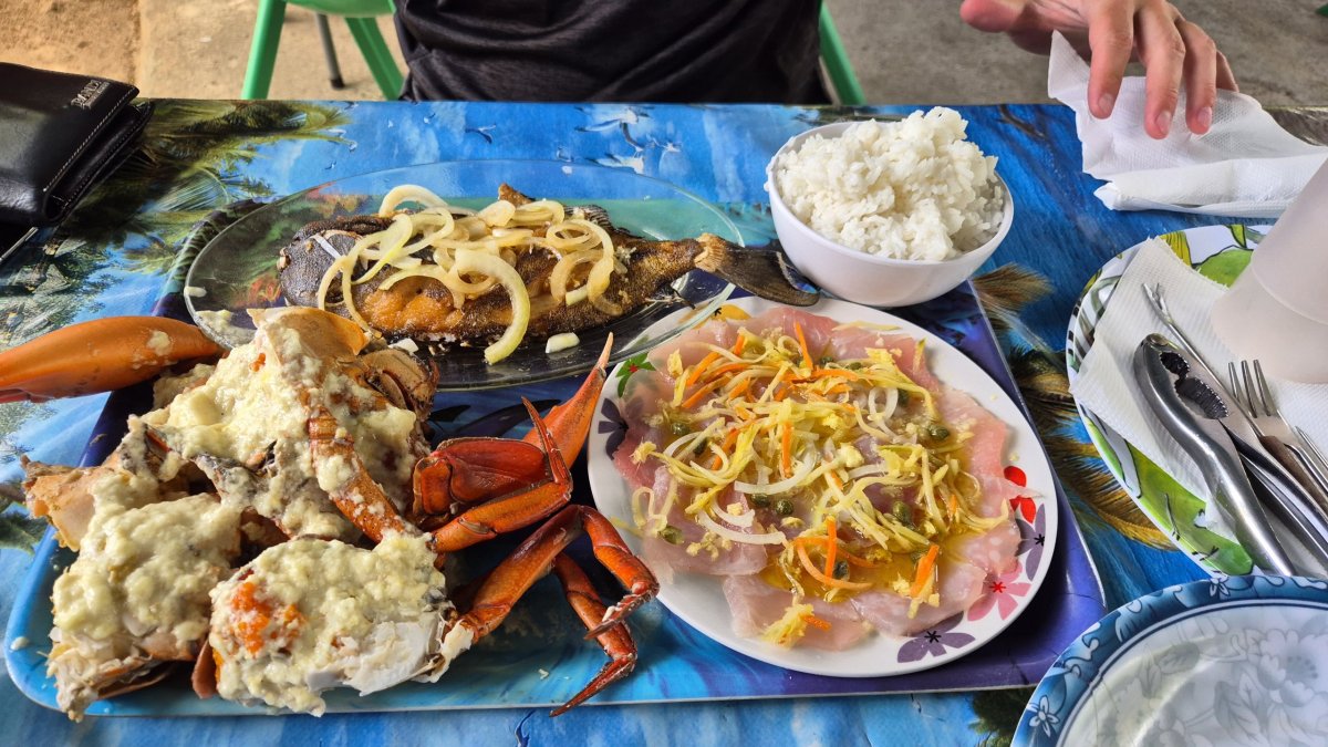 V okolí nášho ubytovania neboli na pešo reštaurácie a ani potraviny, tak sme sa museli na večeru vybrat „do mesta“. Úplne náhodou sme objavili reštauráciu Manuia Grill. Ceny prijateľné a porcie obrovské. Objednali sme si poison cru ako predjedlo a rybu „catch of the day“ ako hlavné jedlo. Ku všetkému sa servíruje obrovská porcia hranoliek. Predjedlo a aj hlavné jedlo sme si rozdelili a odchádzali sme fakt plní.