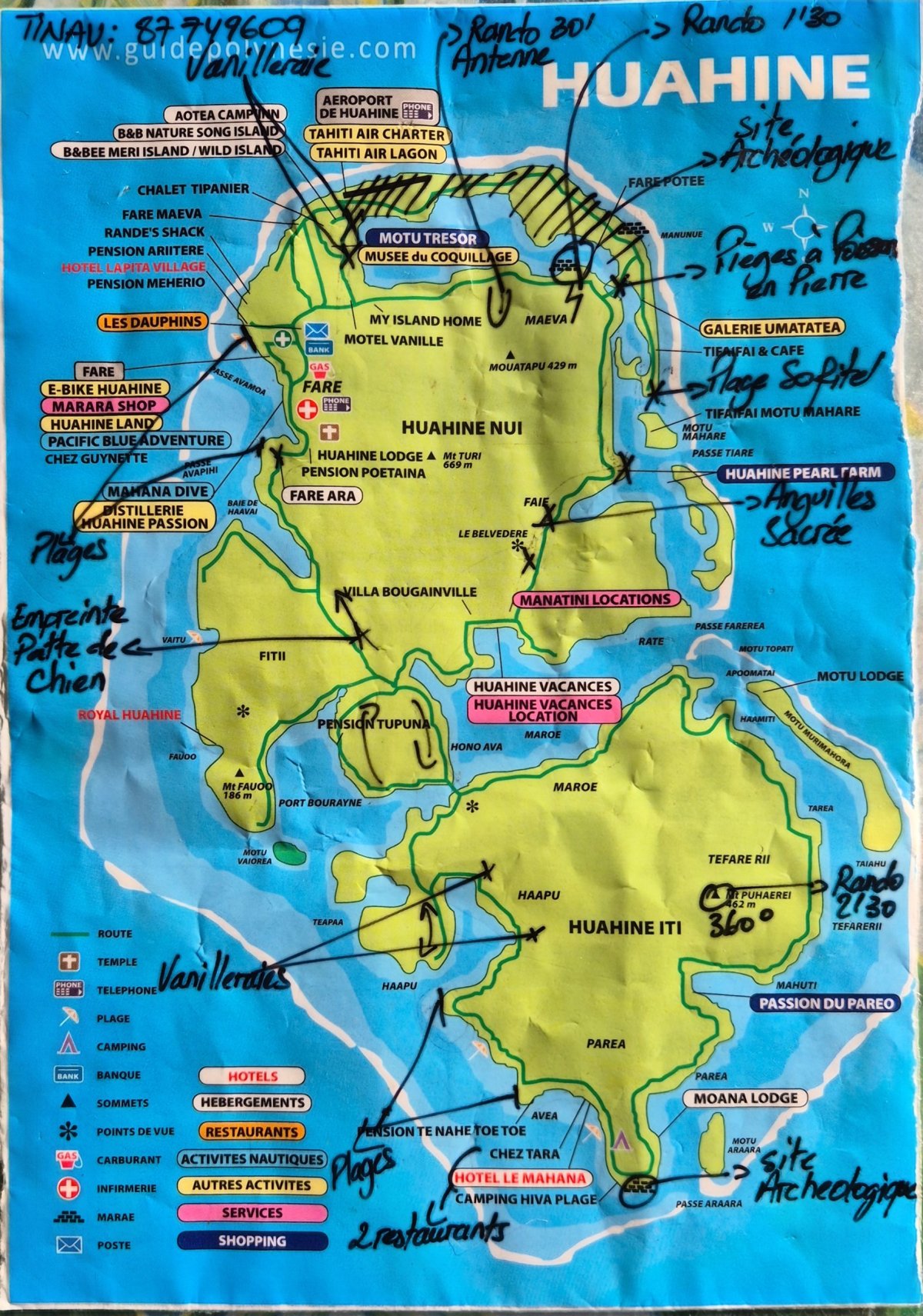 Ďalší deň sme si preto požičali auto a urobili vlastnú inland tour a objednali sea tour na posledný deň cez spoločnosť Huanine Nautiqe (10.000XPF, ale bohužiaľ sa, táto túra nikdy neuskutočnila, lebo kvôli zlej predpovedi počasia sme si skrátili pobytu na ostrove, viac o tom ďalej). Majiteľ ubytka nám dal mapu ostrova a ukázal zaujímavé miesta, kde sa máme zastaviť: