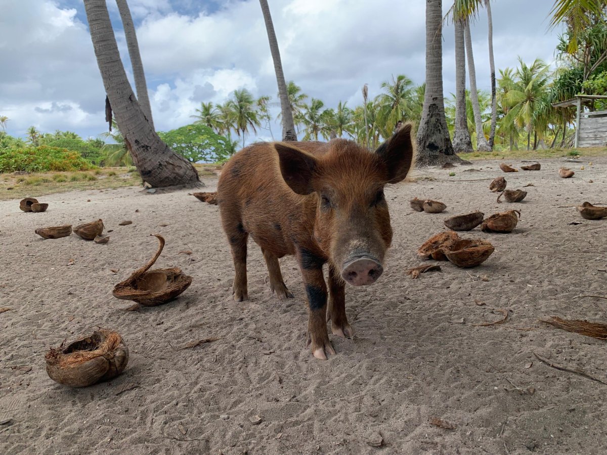 Po pristaní na fakt "dedinskom" letisku nás vyzdvihol majiteľ nášho ubytka. To, že se jedná o menej turistický ostrov sme poznali hneď na začiatku, lebo odvoz z letiska bol grátis. Keďže sme prišli ráno okolo 10, tak náš apartmán nebol ešte pripravený a preto nás majiteľ vyhodil v “meste”. Prešli sme sa po rannom trhovisku, kde sme konečne videli lokálne ovocie - mango, malé banány, platanos, long apples, papayas atď. Napriek všetkému, čo nám tento ostrov nakoniec (ne)ponúkol, mi pripadal najviac lokálny. Na trhu sme stretli pani, ktorá predávala poe co je taká „nádivky“ z rôzneho ovocia, mala banánový, ananásový a potom také lokálne ovocie uru (chlebovník), ktorého príchuť sme hneď vyskúšali a aj si ho obľúbili.