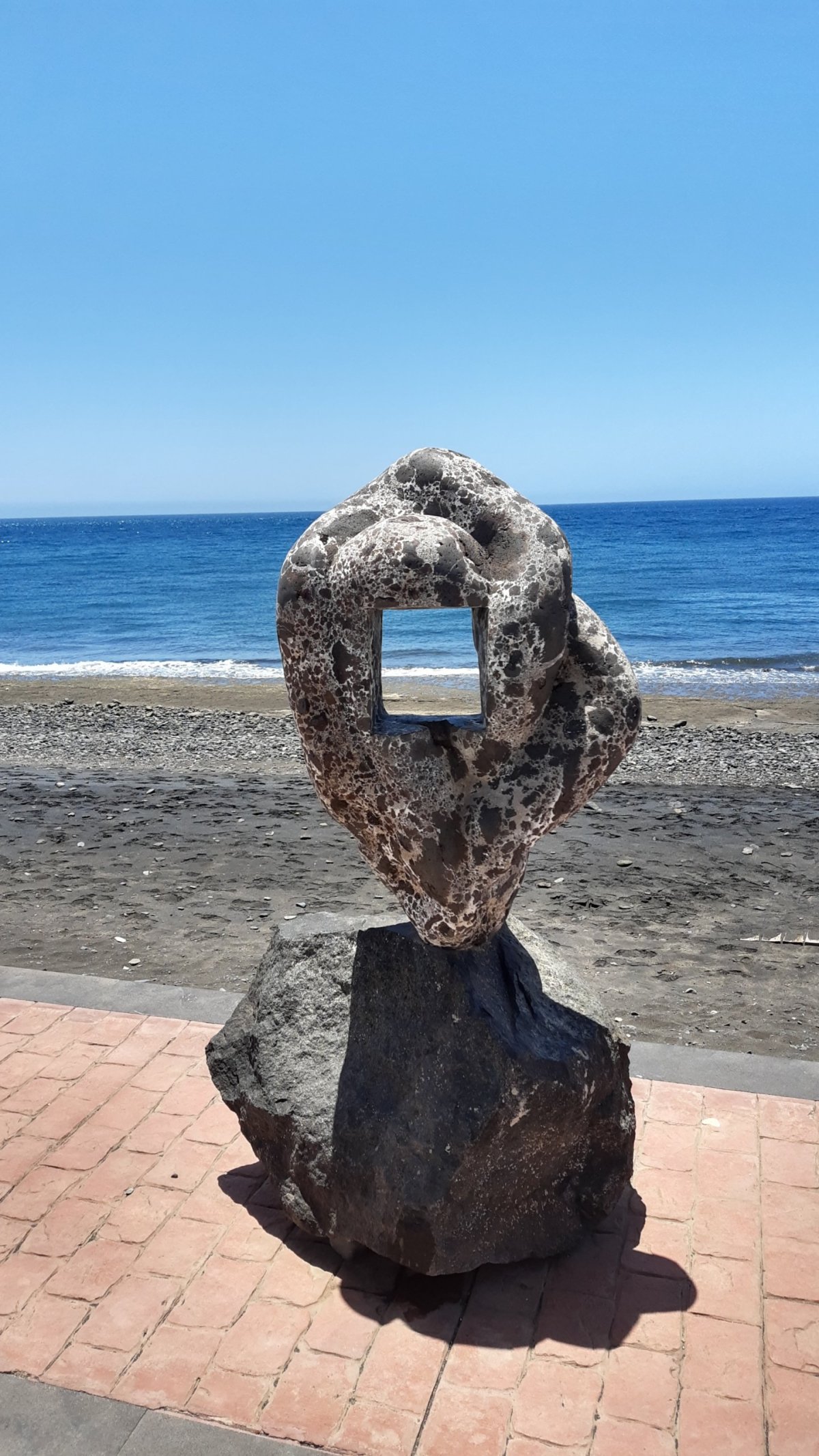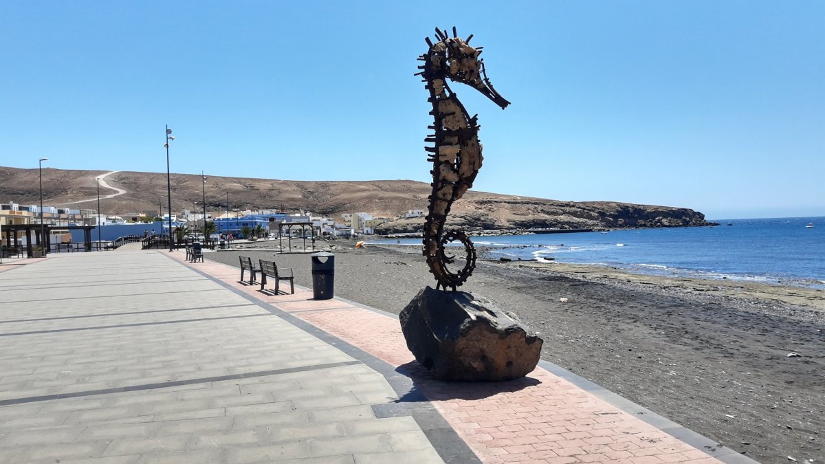 Další naší zastávkou je dlouhá pobřežní promenáda se sochami v Taralejo kolem dlouhé černé a téměř prázdné pláže. I na promenádě jsme téměř sami a prohlížíme si ty momentálně a jen dočasně opuštěné rezorty i ty ze španělského realitního boomu, za minulé krize již nedostavěné.