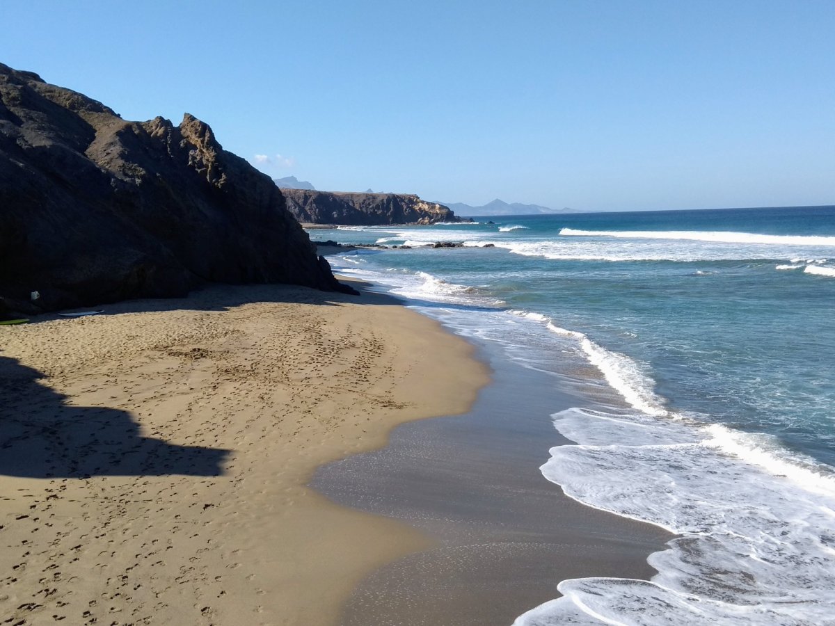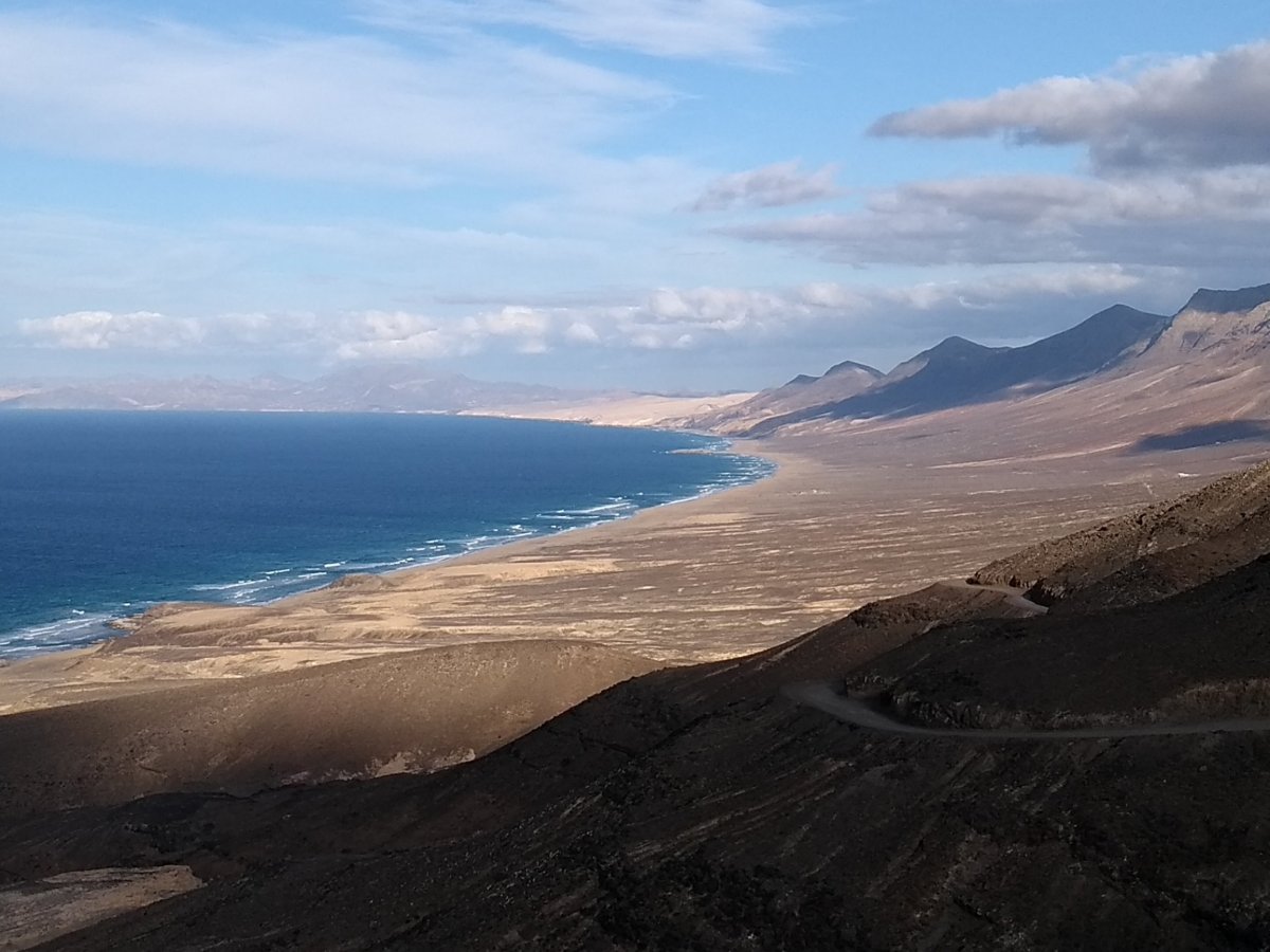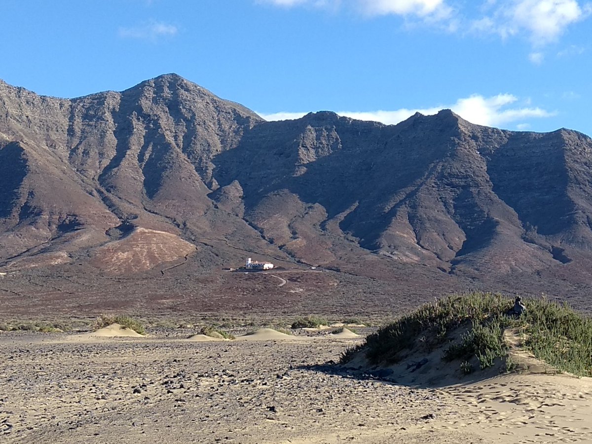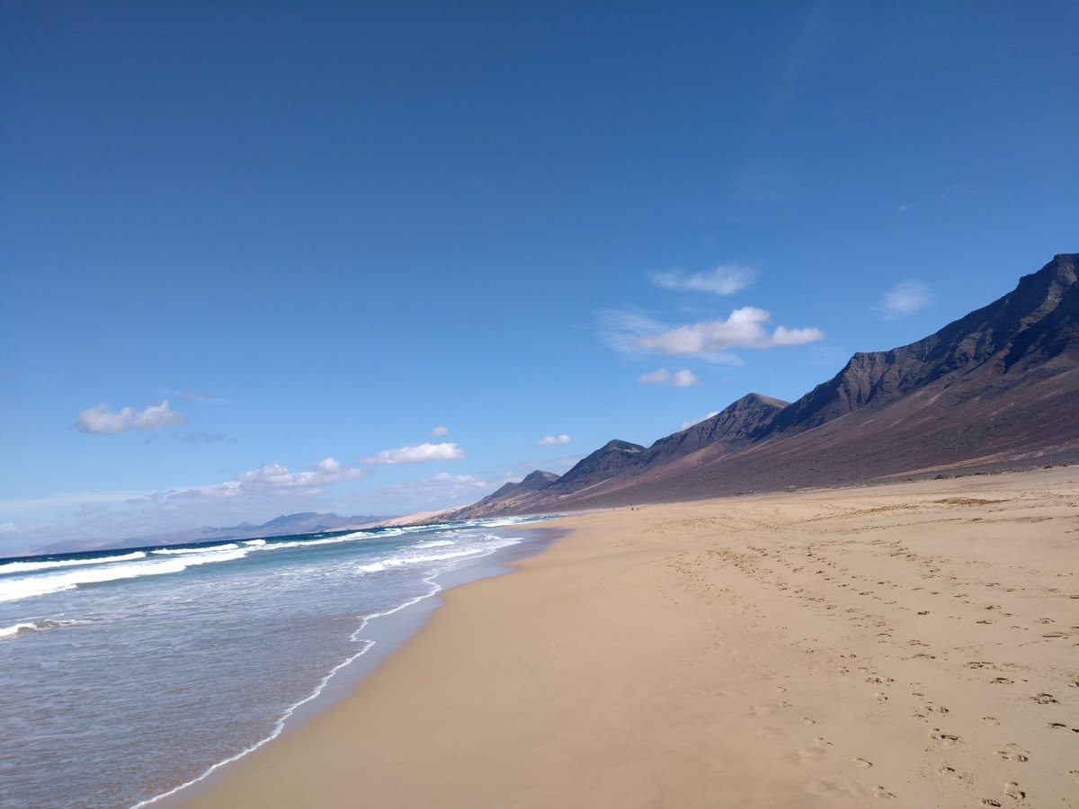 První den ráno po snídani chceme udělat drobný nákup a zjišťujeme, že ze 4 marketů poblíž hotelu není otevřen ani jediný. Sedáme tedy do auta a jedeme hlavní třídou přes Morro Jable a zjišťujeme, že z obchodů obecně je otevřena s bídou jedna třetina. Nakonec nakupujeme až na samotném začátku rezortu v obchodní zóně, kde je otevřený Spar. Pak konečně, vybaveni dostatečnou zásobou tekutin, vyrážíme za jedním z největších lákadel Fuerty – nádhernou písečnou pláží Barlovento, která leží za hřebenem hor, pod malou vesnicí Cofete. Jedná se o místo po všech stránkách zajímavé a unikátní.