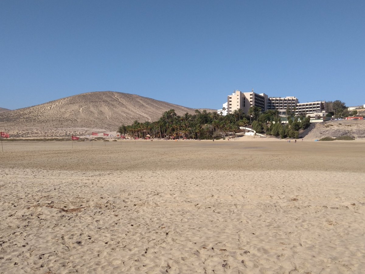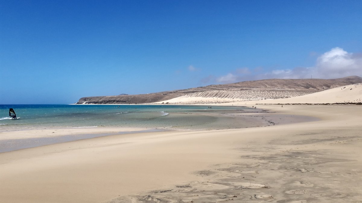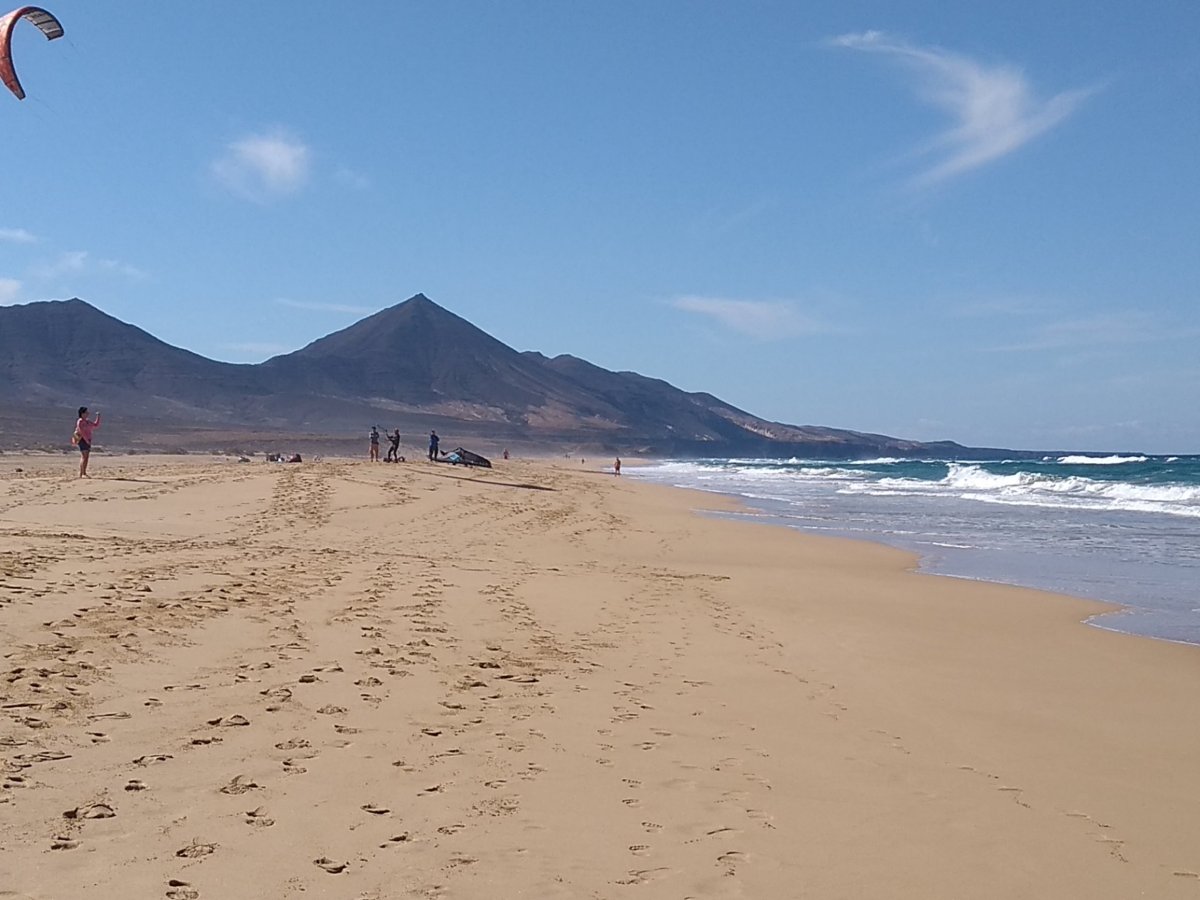 Třetí den se stěhujeme severněji na druhou část pobytu, takže si projíždíme pár míst na východním pobřeží. Naší první zastávkou je vyhlášená pláž Sotavento nedaleko Costa Calma. Jde o širokou a několik kilometrů dlouhou pláž, jejíž velká část se po přílivu změní v mělkou lagunu. Na severním konci pláže je rozsáhlý a osamělý hotelový rezort. Slunce a jemný písek sice vybízí ke koupání, ale je zde i jeden další pro Fuertu typický faktor - silný vítr. Ten zde dosahuje odhadem 20 m/s, takže v moři místo koupajících turistů řádí desítky jezdců s kitem nebo windsurfingem. My v tom silném větru uděláme jen krátkou procházku k moři a pak pokračujeme dál.