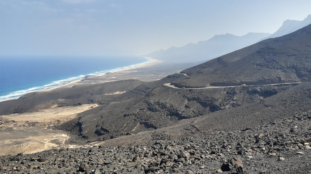 První den po snídani sedáme do našeho Miníka a vyrážíme na naše jednoznačné „must“ při každé naší návštěvě Fuerty – pláž Cofete. Po prašné roletovité cestě tentokrát jedeme vcelku opatrně, tohle vozítko přeci jen není na takovou cestu stavěné a drncáním i rachotem zpod motoru nám to dává celou cestu najevo. V horském průsmyku nad pláží je to poprvé, co nám zde vítr nerve dveře auta z rukou a my zde můžeme za solidního počasí strávit pár minut. Když přijíždíme na parkoviště u pláže, tak toto je solidně zaplněné, ale lidé jsou po široké a dlouhé pláži rozptýleni tak, že si bez problému nalézáme náš soukromý pás asi 50 metrů.