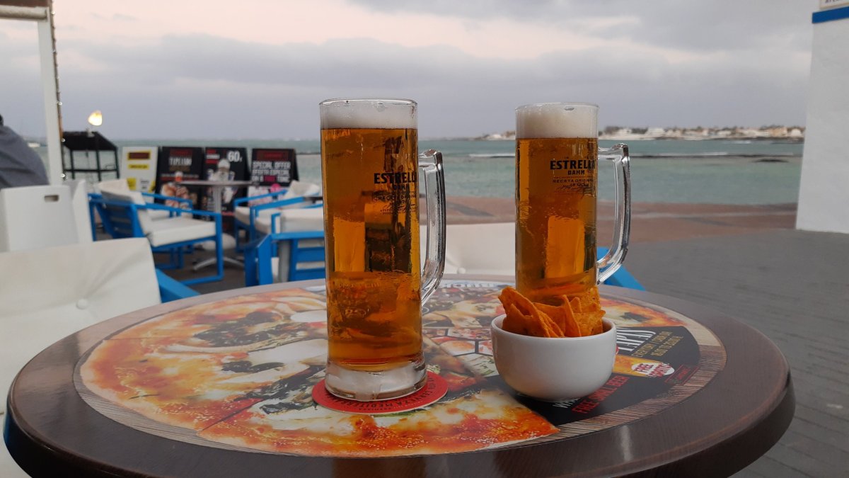 Pro návrat do Corraleja volíme zajížďku přes La Olivu, kde se zastavujeme u kostela, a vyhlídku Mirador de Vallebron s výhledem na sopku Tindaya. Pokračujeme údolím na východní pobřeží a pak nenajíždíme na dálnici, ale do Corraleja jedem pobřežní silnicí okolo dun. Na všech plážích dle očekávání silný vítr, vlny a červené vlajky. Pozdní odpoledne, než zapadne slunce, trávíme u bazénu a pak vyrážíme do víru maloměsta. Tentokrát je náš oblíbený bar téměř prázdný, takže si dáváme džbánek sangrie a pak pokračujeme do centra na hlavní pěší zonu s obchody a restauracemi. Protože jsme výlet doposud absolvovali s pouhými třiceti eury v peněžence, chci v nějakém bankomatu vybrat hotovost. Když to zkouším u banky Santander, hlásí bankomat za výběr poplatek 8 EUR. Takže tady fakt ne, další pokus kousek vedle u BBVA, zde jde už o akceptovatelných 1,80 EUR.