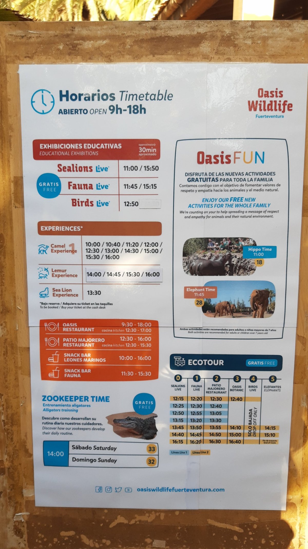 Třetí den po snídani balíme kufry a přesunujeme se na sever, do Corraleja. Celý den ale plánujeme strávit v místní ZOO/záchranné stanici Oasis Park, kam přijíždíme okolo jedenácté dopoledne. Podle počtu aut a autobusů na parkovišti je jasné, že nás žádný nátřesk dnes nečeká. Standardní vstupné je 35 EUR, ale pokud si vstupenky koupíte alespoň den dopředu přes web, tak dostanete 10% slevu, tzn. pak jde o 31,50. Během dne shlédneme vystoupení lvounů a dravců, stejně jako představení nejrůznějších plazů. ZOO je poměrně rozsáhlá, takže se tu dá v pohodě strávit celý den. Zajímavou je rozhodně zadní část zahrady se stovkami nejrůznějších kaktusů. Lákadlem je také krmení velbloudů a žiraf, kdy u pokladny můžete za 3 EUR koupit dva balíčky – jeden se senem pro velbloudy (asi to nejdražší seno na světě) a druhý s jablky a mrkví pro žirafy.