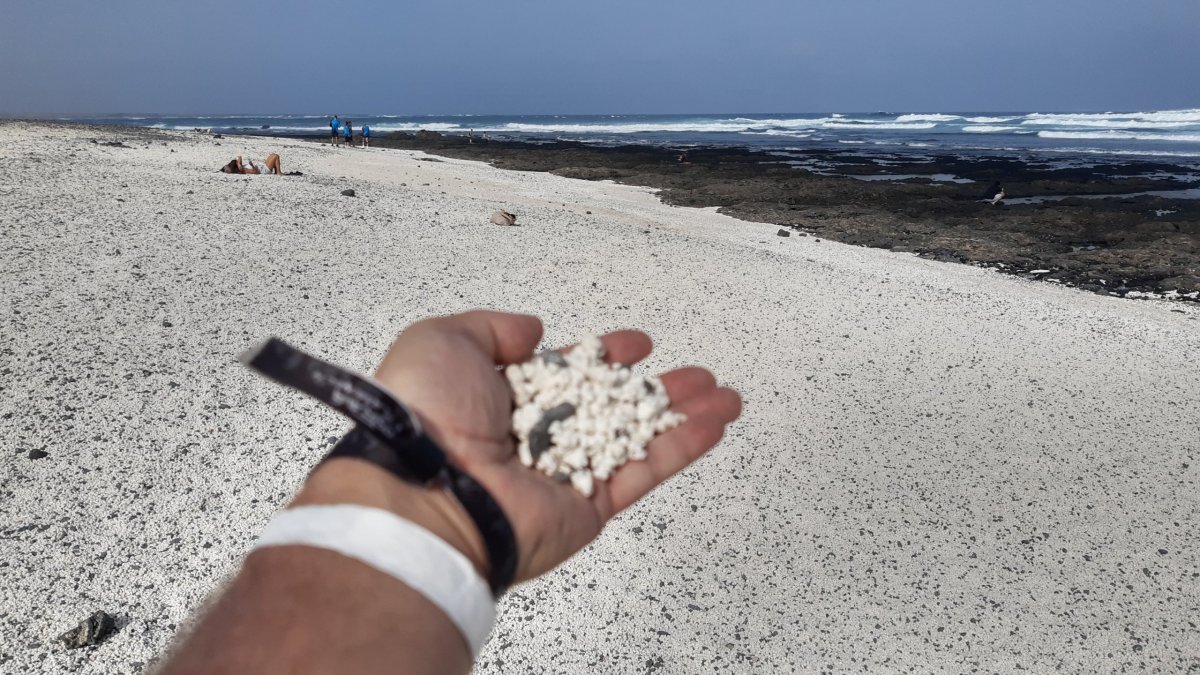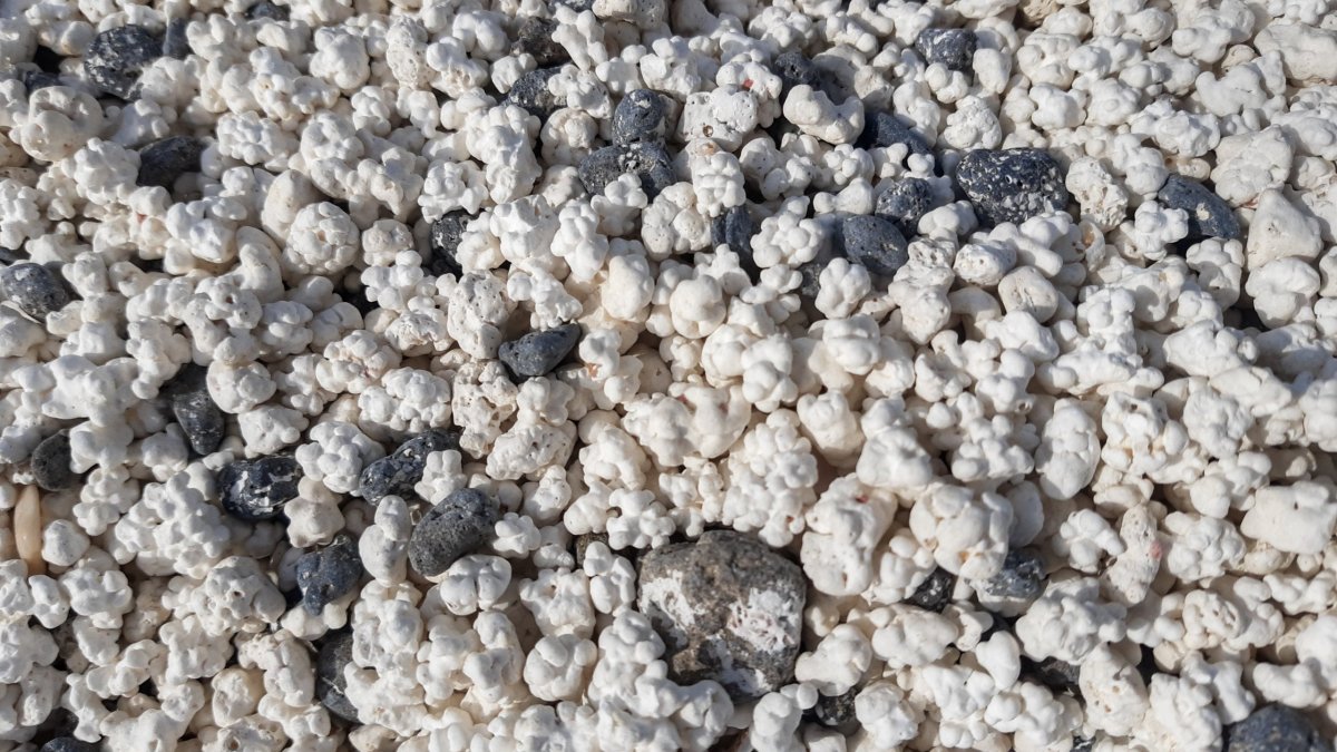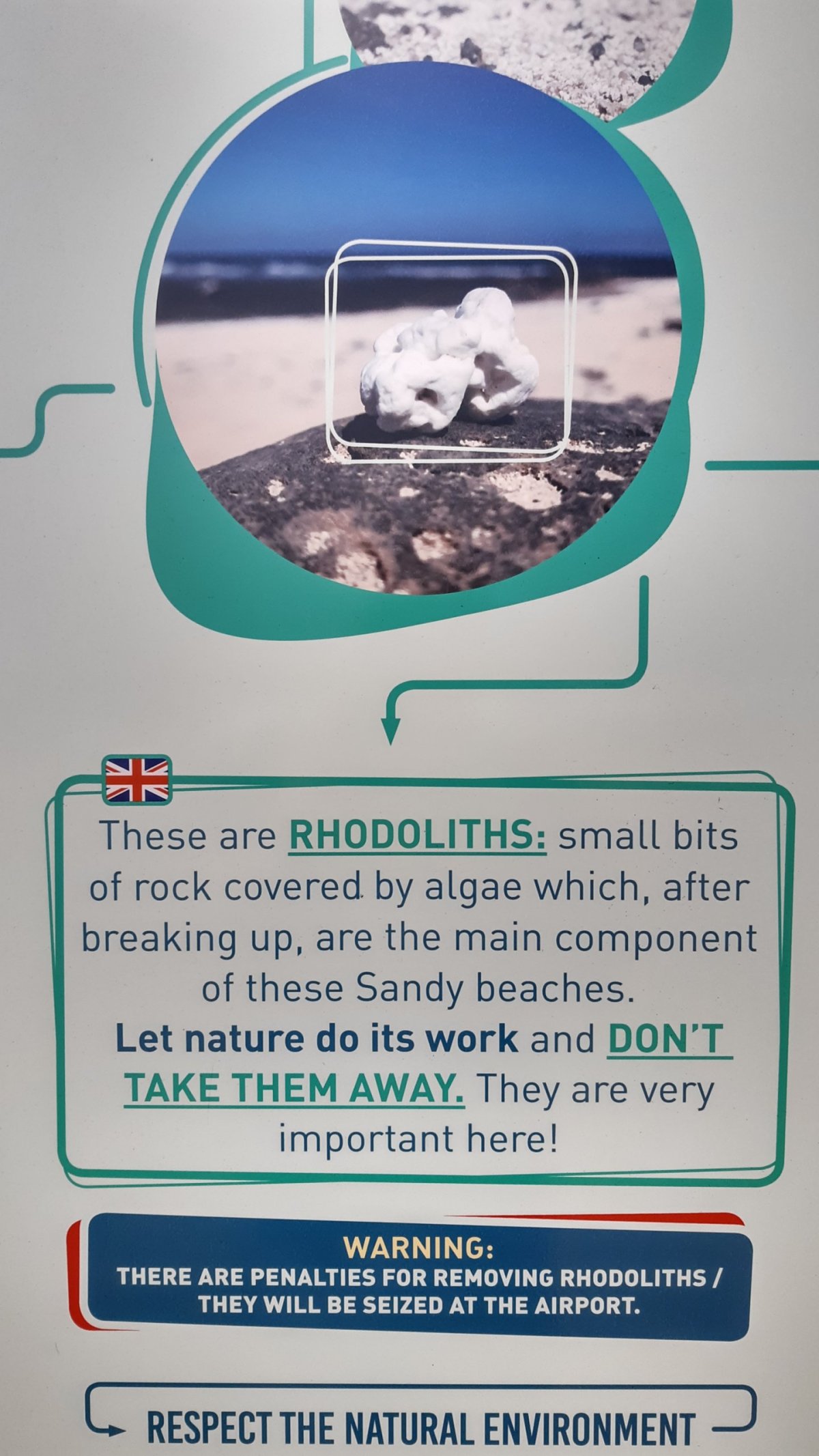 Ráno vyrážíme na snídani. Ta se podává v běžné restauraci v přízemí hotelu a na výběr je na lístku spousta baget, sendvičů či národních typů snídaní. Volíme bagetu a italskou snídani, což jsou tři malé a téměř nepoživatelné keksy s nugetou, takže se dělíme o bagetu, která je jednoznačně lepší a větší volbou, postačující pro oba. Po snídani vyrážíme Miníkem za místní raritou, která zatím unikala naší pozornosti – po prašné cestě jedeme na Popcorn Beach, která se nachází pár kilometrů západně od Corraleja. My i auto opět trpíme po nezpevněné cestě a po nějakých 10 minutách parkujeme kousek od této unikátní pláže, kterou tvoří bílé kamínky tvaru a velikosti kukuřičného popcornu. U pláže je několik tabulí, které upozorňují na to, že pod velkou pokutou je zakázáno tyto kamínky odnášet. Kousek od pláže je také jakýsi podivný soukromý objekt, dům či nějaká pseudohospoda?