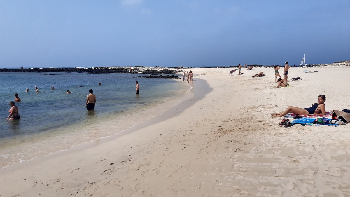 Ráno po snídani balíme a opouštíme hotel. Ještě si zajdeme do města koupit kebab na odpoledne, abychom se na cestu nevydali hladoví a máme tak konečně šanci poznat tvář města za světla. Pak míříme na jih, kdy se konečně zlepšuje viditelnost a my máme poprvé příležitost vidět jasně nedaleké Lanzarote i ostrůvek Lobos. Pokračujeme jako o den dříve na poklidnou pláž do Puerto Lajas, kde se tentokrát musíme schovávat před silným větrem za nízkou místní vegetací, naštěstí ani dnes zde nejsou vlny, takže koupání je v pohodě. Po páté se zvedáme a míříme na letiště, kde necháváme auto s klíčkem a parkovacím lístkem na podlaze.