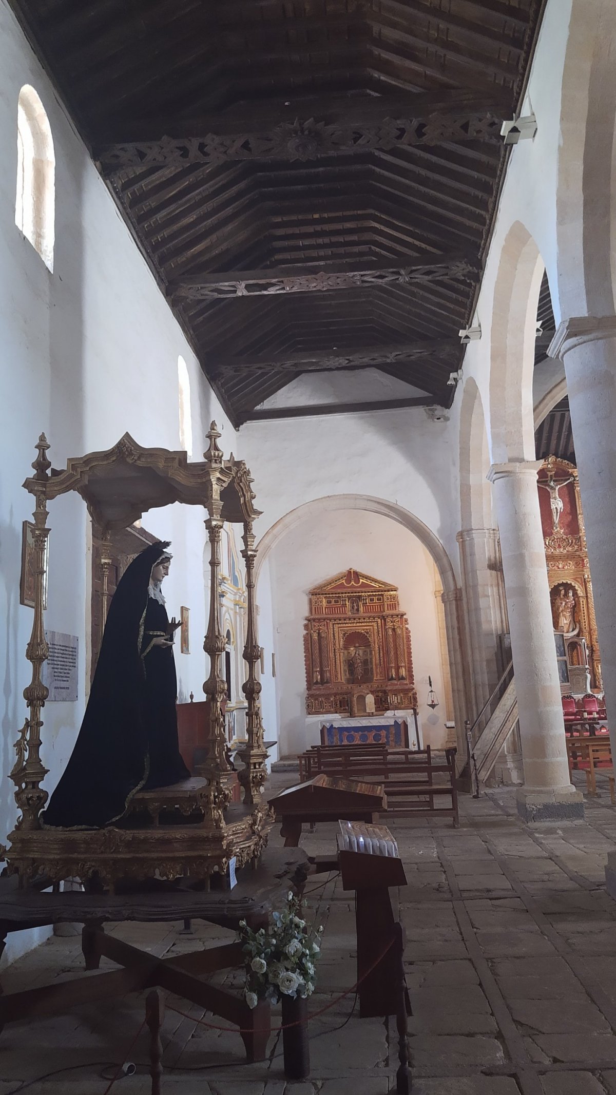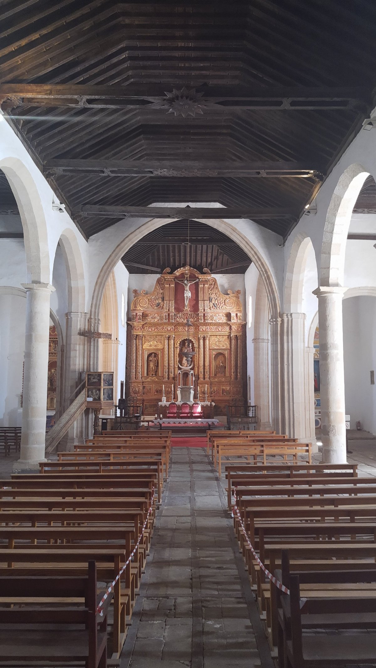 Stezkou ve stínu vyrážíme do maličkého centra městečka, které tvoří velký kostel a pár bloků domů, ve kterých jsou dnes restaurace a pár obchůdků se suvenýry. Je neskutečný pařák a okolo kostela je pouze pár turistů, hlavní polední nápor a autobusy jsou už pryč. My se jdeme zchladit do třílodního kostela, kde je sbírka sakrálního umění. Vstupné je 1,50 EUR. Vevnitř jsme skoro sami. Kostelu dominují dva zdobené oltáře a unikátem je sakristie s vyřezávanými dřevěnými stropy a sbírkou olejomaleb.