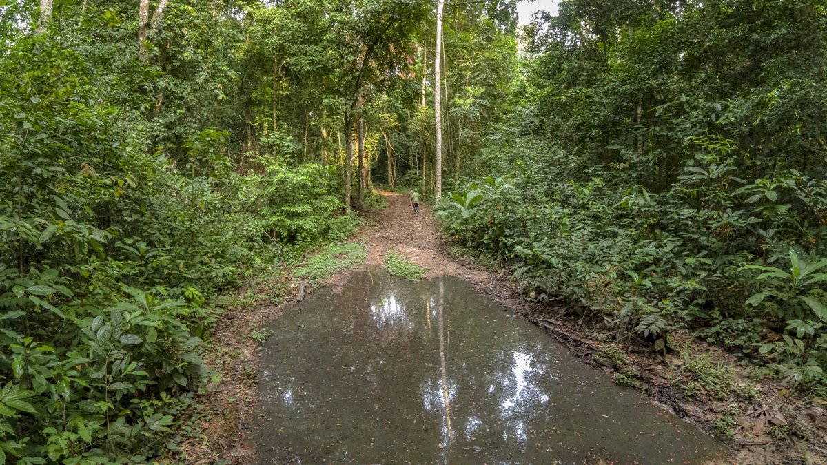 Výlet do okolí našeho ubytka. Nádherný prales, ale kromě stopy leoparda a převráceného bagru jsme žádné zvíře neviděli.