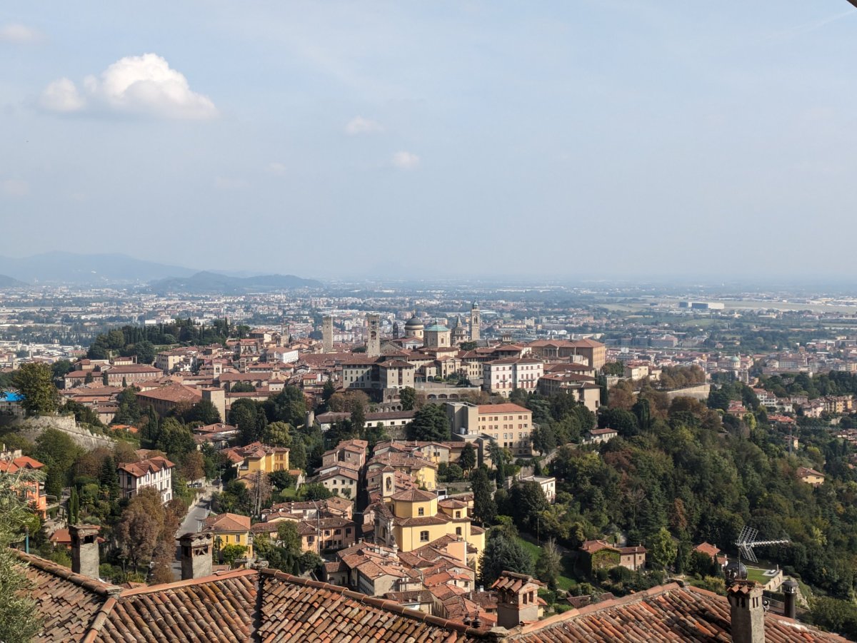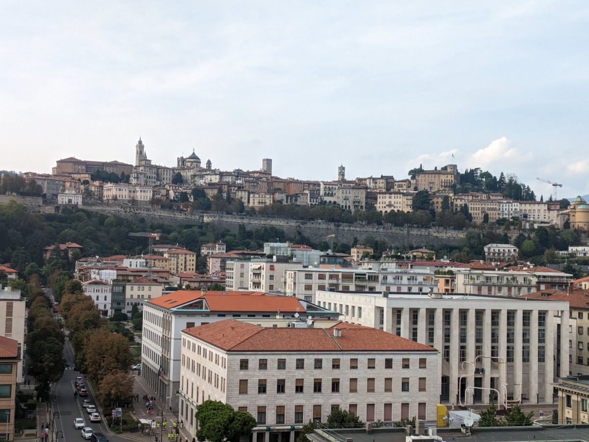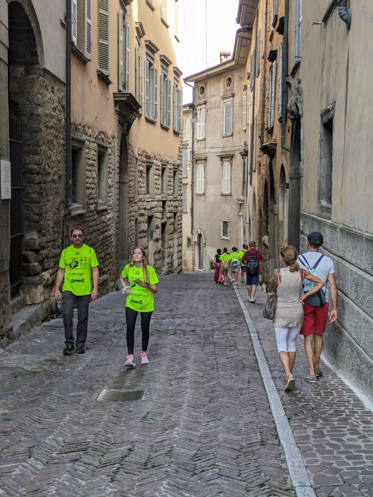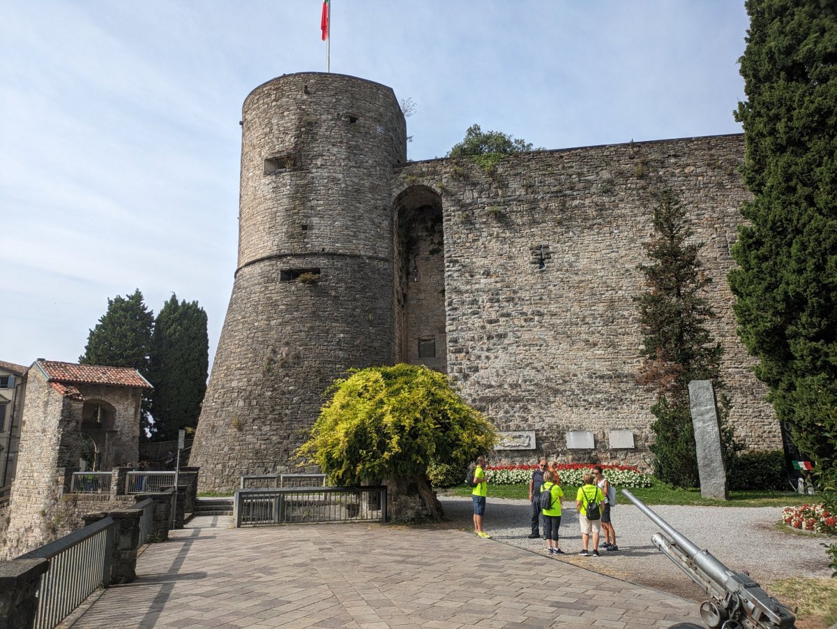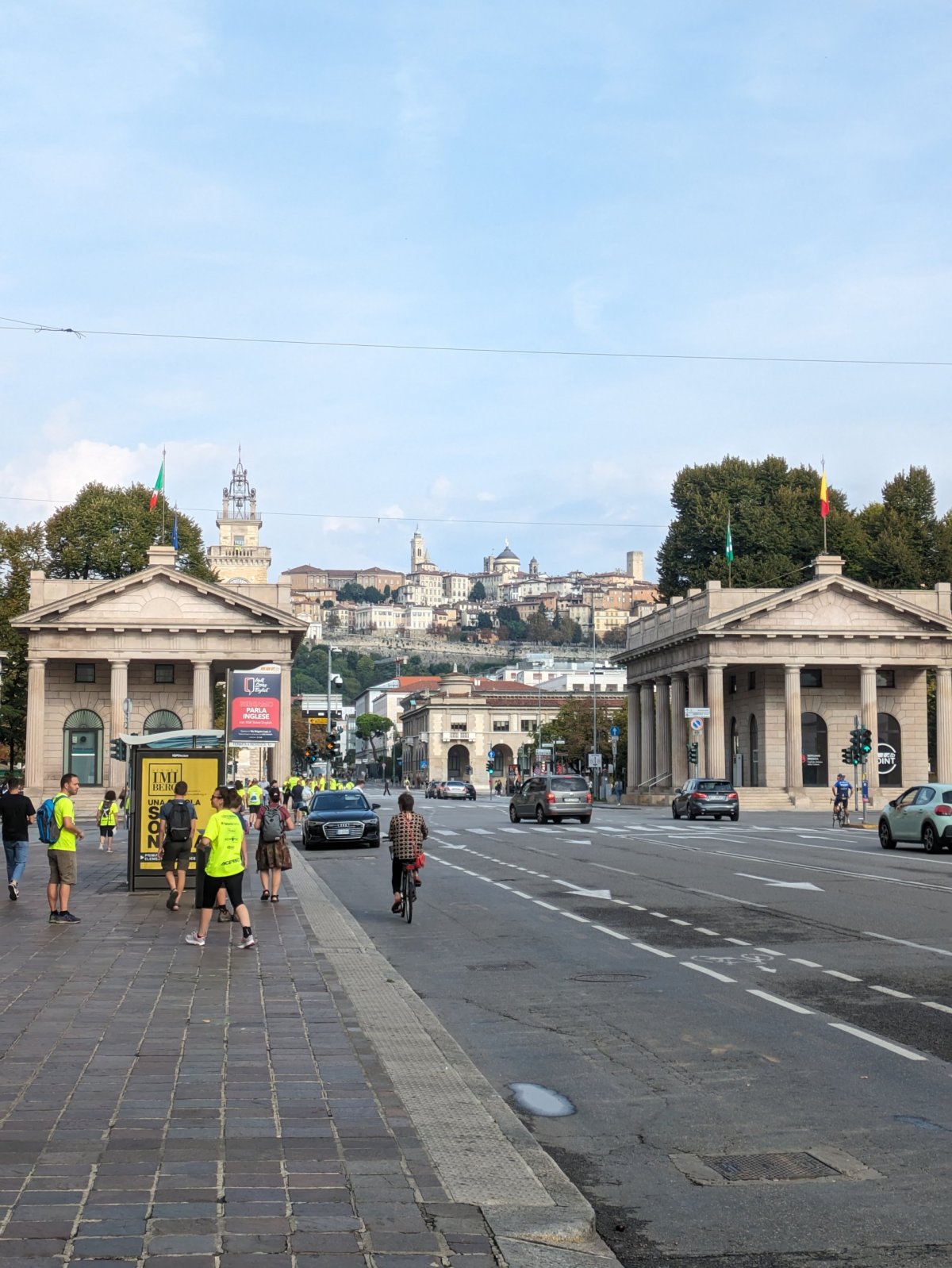 Bergamo. Zaparkovali jsme na placeném parkovišti u nádraží a vydali se směrem k historickému centru hlavní ulicí Viale Papa Giovanni XXIII. Divné bylo, že všude chodili lidé ve svítivých žlutých tričkách. Asi nějaký běžecký závod, říkali jsme si. Když jsme dorazili k věži Torre dei caduti, řada z těch lidí čekala na vstup. Asi mají čas před startem a tak jdou na vyhlídku. Nedalo mi to a cestou jsem se snažil ve vyhledávači najít, o jakou akci jde. Za chvíli jsem to našel - akce se jmenuje Millegradini 2023 (https://www.millegradini.it) a v roce 2023 se koná 16. a 17. září. Ten druhý den je právě dnes! V těchto dvou dnech se otevřou všechny významné památky a turistická místa v Bergamu. Pro registrované účastníky akce jsou vstupy zdarma, případně s významnou slevou! Jenže ouha, online registrace jsou už zavřené. Tak to jsme prošvihli.