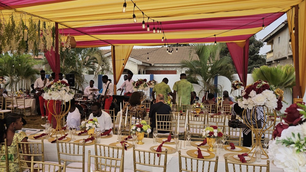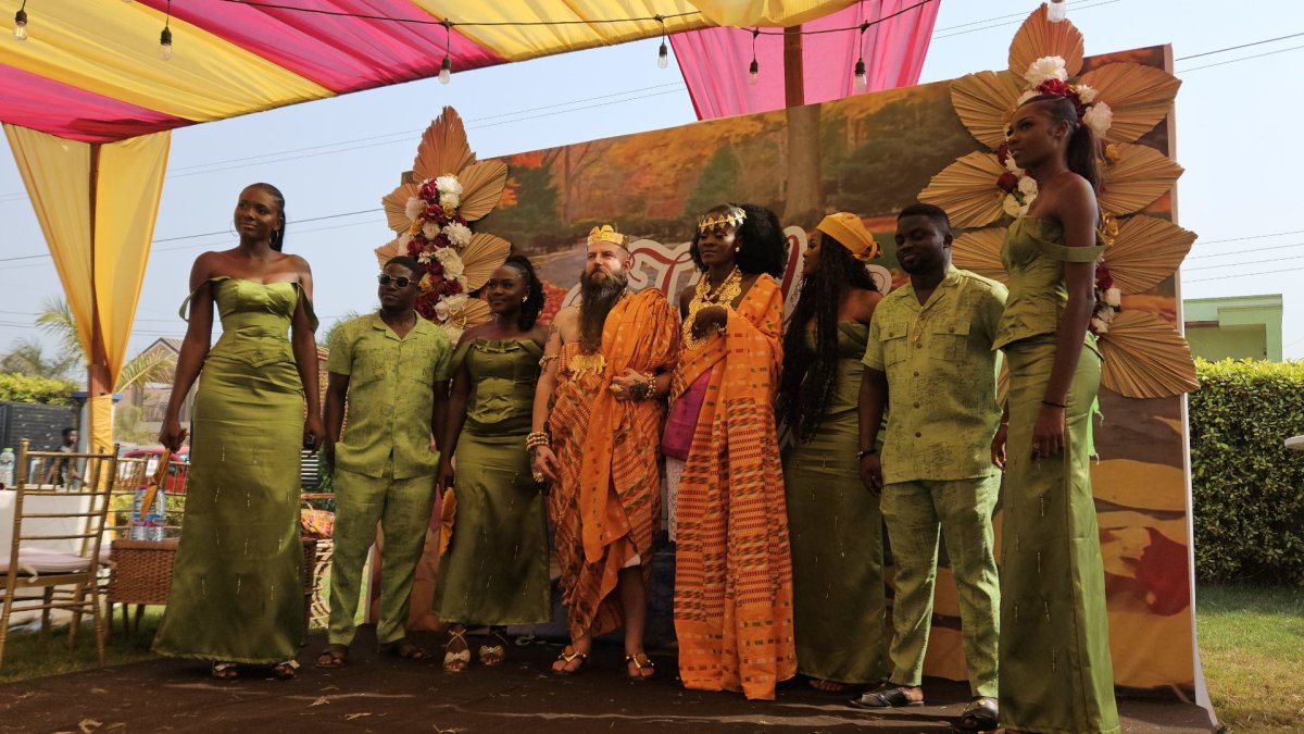 Za rozbřesku je na terase hotelu uprostřed hlavního města Ghany k vidění netradiční úkaz: čtyři Češi vystrojení na svatbu. S Míšou jsme si nechali u krejčího Jo původem z nedaleké Nigérie ušít šaty s místním typickým vzorem a za několik málo stokorun mám na sobě poprvé v životě něco na míru. Ostatní dva čeští přátelé tolik štěstí neměli, když jim dopředu objednané košile vůbec neseděly. O chvíli později se objeví ženich, po několika málo hodinách spánku docela svěží, ale stále v civilu, i když nevěsta začala s přípravami ještě před rozbřeskem. I on se už nejspíše smířil s tím, že plánovaný start obřadu s úderem osmé ranní, již o hodinu posunutý oproti původnímu plánu, je utopií. Jeho prakticky osobní řidič Bernard, který je zároveň jeden ze svědků, veřejně předpověděl start v jedenáct hodin, za což obdržel od ženicha minimálně nevraživý pohled. Teď to však začalo vypadat, že přece jen bude mít pravdu. V poklidu tak posnídáme, objednáme si taxi a při čekání na něj se Jirka stihne vyfotit s místním známým zpěvákem – ten to alespoň o sobě tvrdí, když nejprve zarputile odmítá focení. I přes notné zpoždění přijíždíme na místo konání svatby stále mezi prvními.