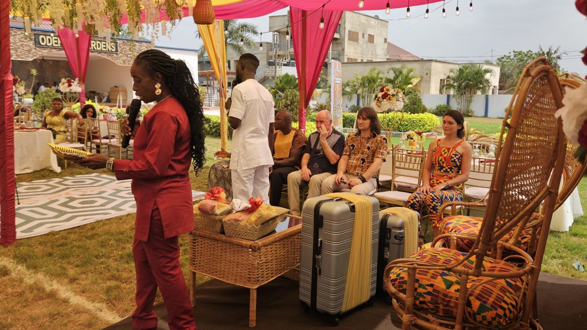 Uvaděči střídají angličtinu s místním jazykem twi a za každou druhou větou neopomenou dodat amen nebo aleluja. Hned v úvodu připomínají hostům, že se nepřišli jen zadarmo najíst, ale čeká se od nich podpora novomanželů v tento slavnostní den. Následuje několik modliteb a představení takzvané ceny nevěsty – vlastně takového věna naruby: oproti našim zvyklostem jsou to dary pro rodinu nevěsty od rodiny ženicha, kterou zde spolutvoříme my. A tak máme tu čest zúčastnit se špalíru, který na pódium přináší kufry, nůše a ošatky se vším možným od střevíců přes spodní prádlo až po lahve s alkoholem, limonádami a vodou. Téměř každou věc pak moderátoři zvedají do rukou a pronášejí k ní řeč a nakonec je dotázán otec nevěsty, zda se mu „cena“ jeho dcery zdá v pořádku. Nejprve se sice naoko ohradí, že ještě nedostal všechny přinesené dary, ale posléze samozřejmě souhlasí. Přestože jej před pár dny viděl poprvé v životě, nový zeť se mu zamlouvá.
