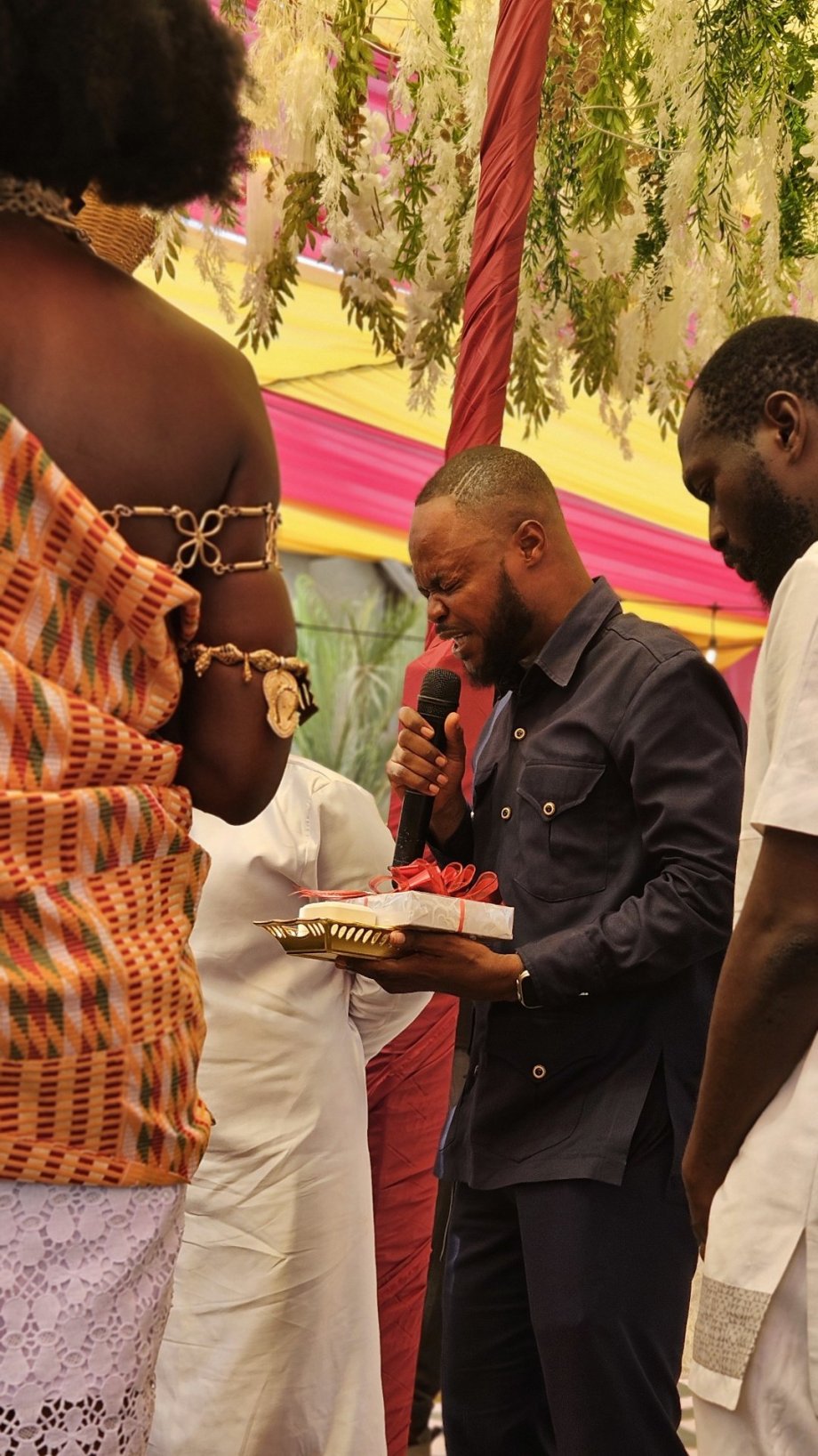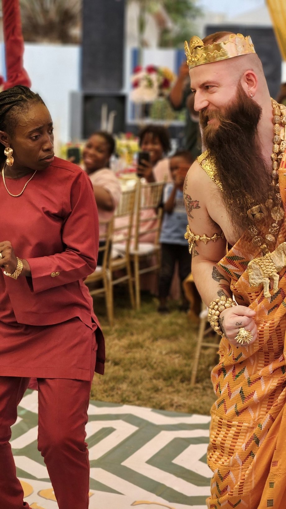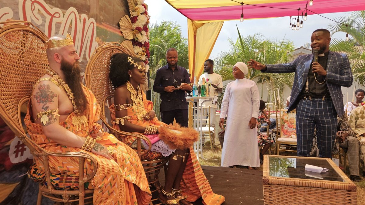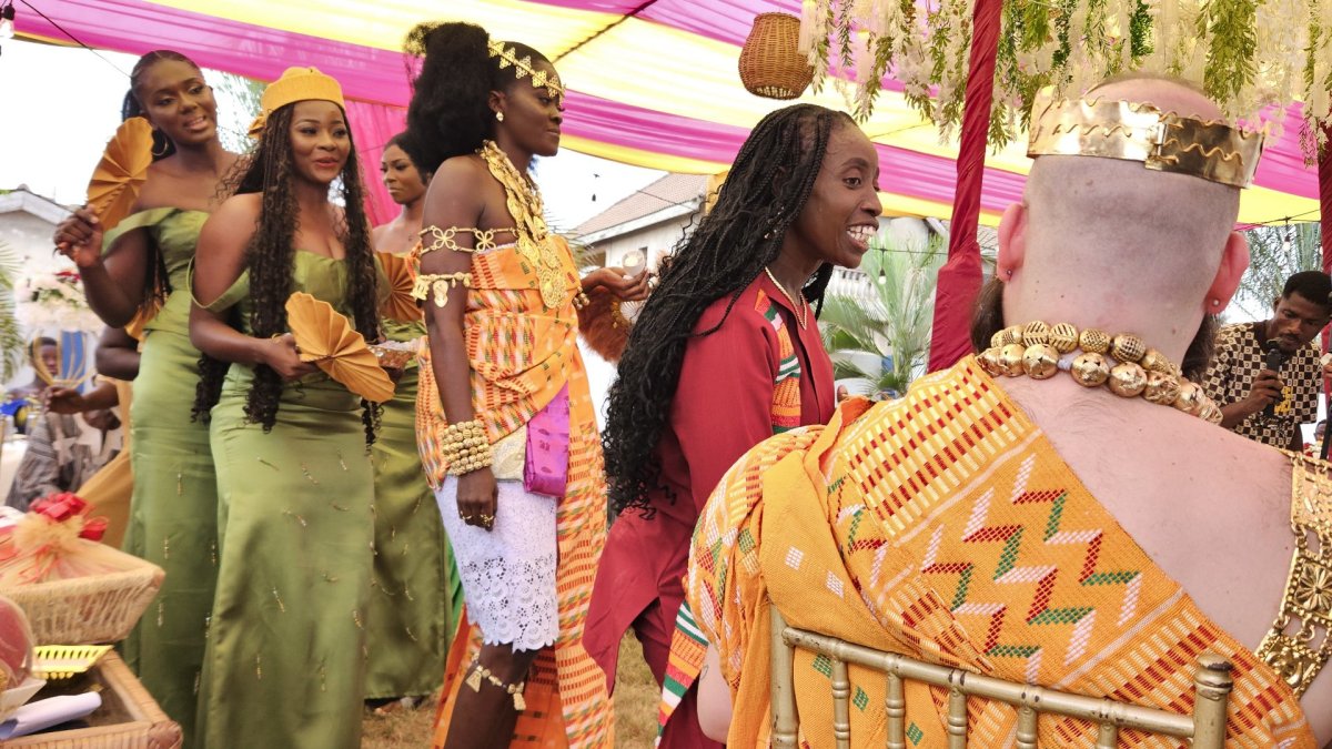 Na scéně se objevuje ženich v tradiční sváteční oranžové róbě z kente. Tato ručně tkaná látka s pestrými barvami a symboly se specifickým významem podle majitele má historii sahající až do dvanáctého století. S pozlacenou korunou, sandály, náramky a náhrdelníky by neudělal ostudu na žádné přehlídce afrických králů. Uvaděčka s přezdívkou MC Too Shy, která několikrát neopomene zmínit počet svých sledujících na sociálních sítích, některá ocenění a další úspěchy, vyzývá ženicha k tanci a ten k všeobecnému veselí začne opatrně kroutit boky v rytmu moderní africké hudby. Jen co mu je dovoleno si sednout, veškeré osazenstvo už směřuje zraky ke vchodu: přichází nevěsta.