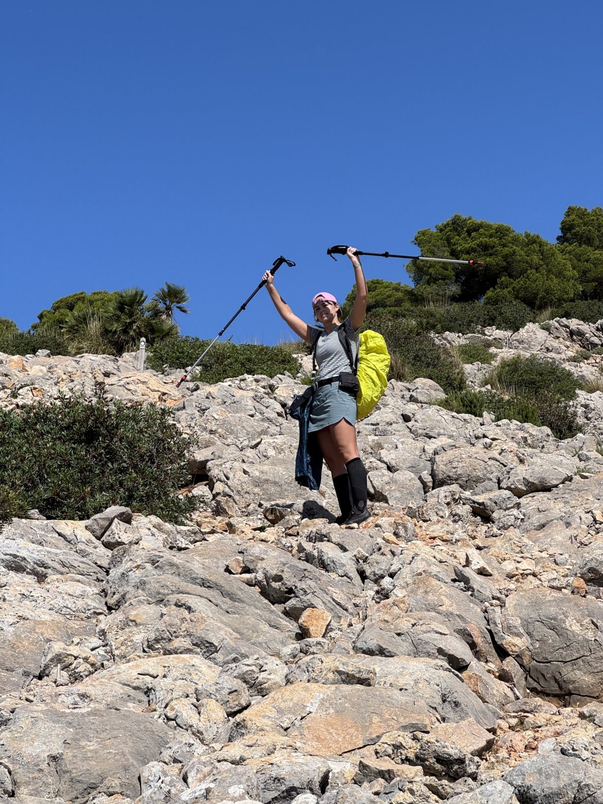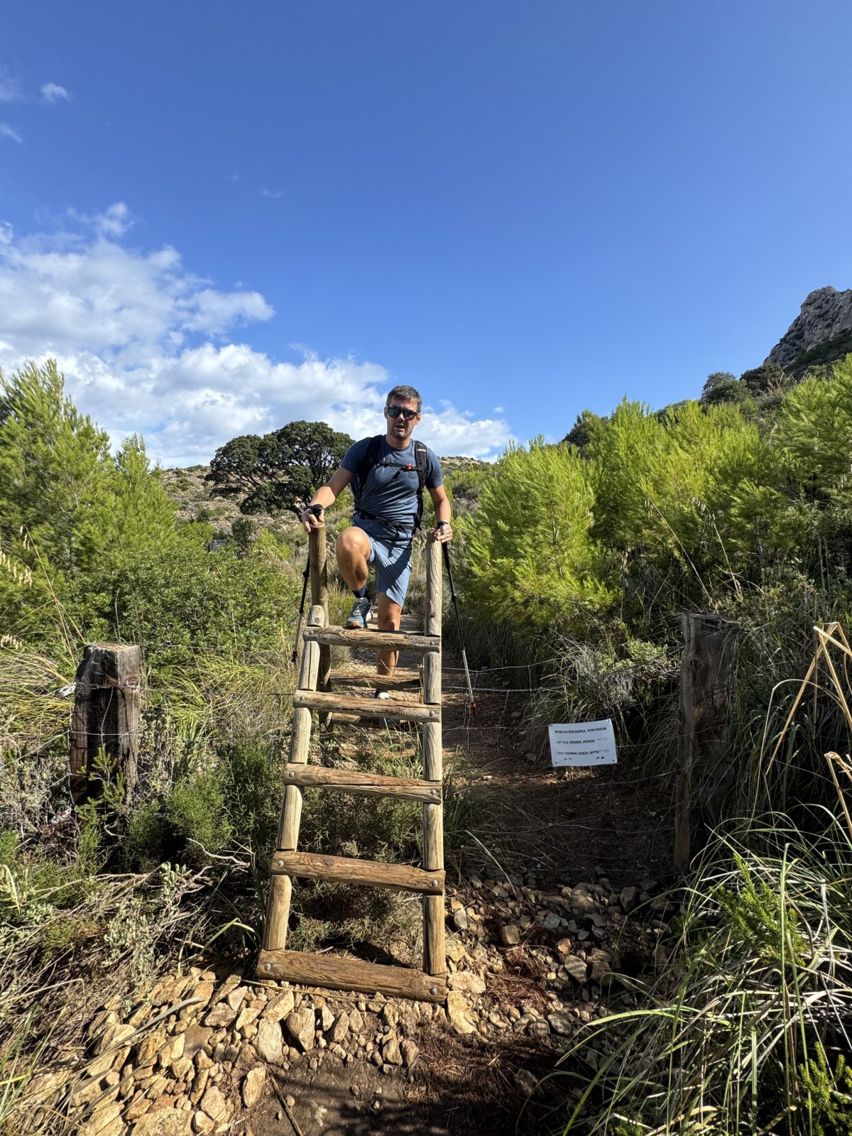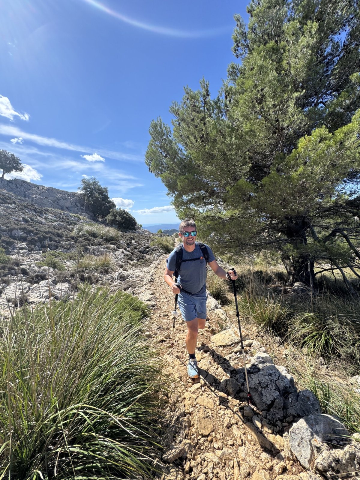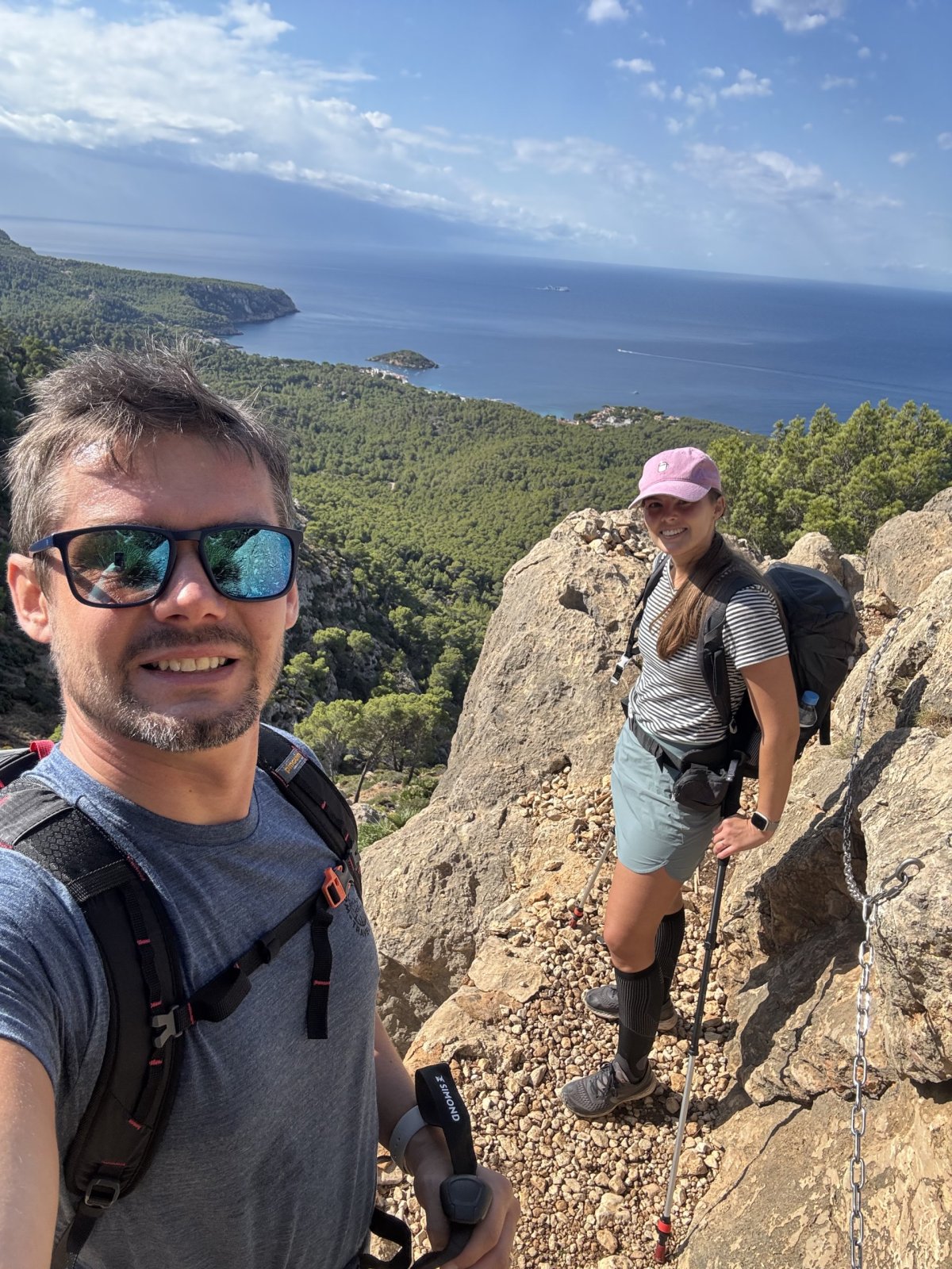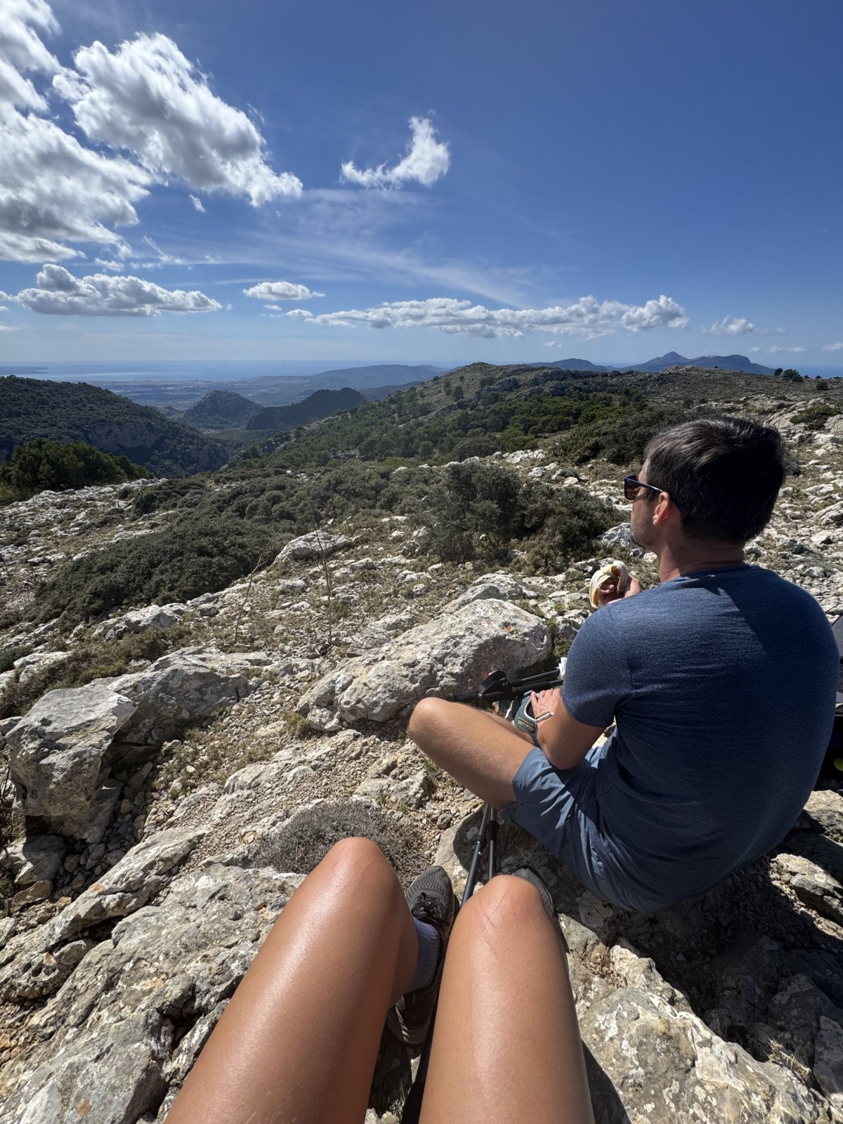 Procházíme celkem sami a najednou začíná silné stoupání. Je to asi zatím nejstrmější, co jsme do teď zažili. Ale ty výhledy. Vrchol je 936m a vidíte na obě strany, tedy na město Palma a zároveň i na Deiá a Sollér. Chvilku se jde po hřebenu, kde si dáváme sváču ze snídaně, banán a muffin s nutellou :) opatrně sestupujeme dolů, cesta opět strmá.
