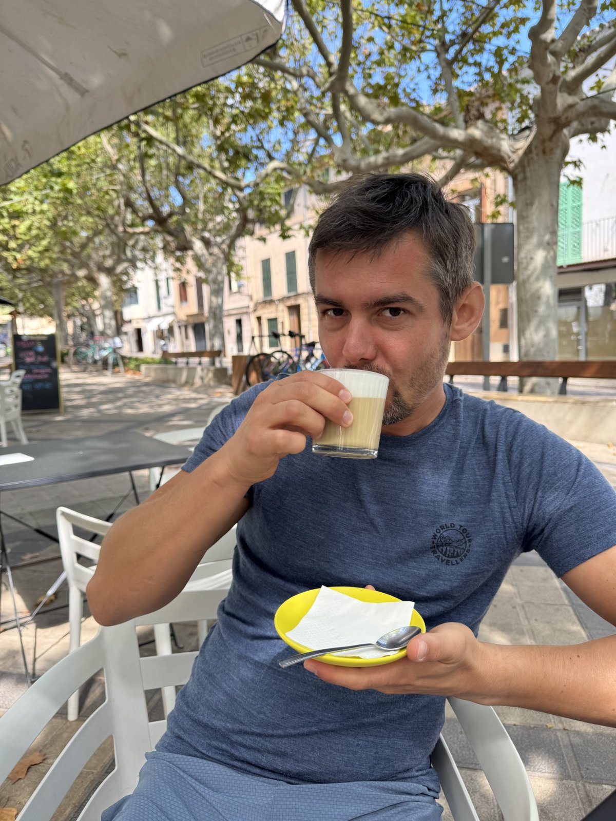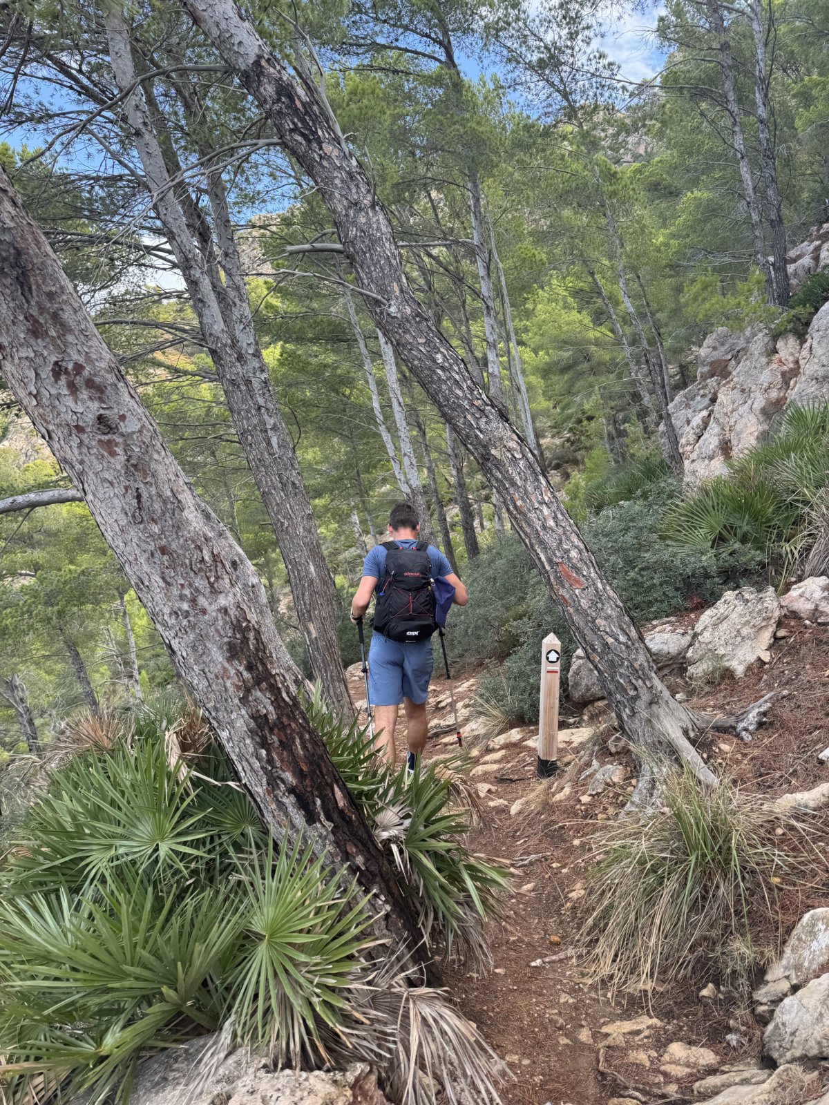 Dnešní cesta je trochu jiná, vede více méně celá lesem, což je skvělé, měkké a jehličí na zemi je najednou náš kamarád. Je pod mrakem a procházíme terasovými poli s olivovníky. Občas lesní cestu vystřídají hodně staré kamenné cesty seskládané z oblázků. Potkáváme 2 české holky z přírodovědecké fakulty, co jdou na divoko a společně scházíme do městečka Esporles. Je tu pěkná hlavní třída, na které je několik kaváren. Fajn zastávka, kde si člověk může na chvíli orazit. I když na objednávku v kavárně čekáme věčnost. Závěrečný úsek je přechod přes jeden větší kopec, ale velká část je po staré asfaltové cestě se stejným sklonem a část zase lesem s kamenitými rozvalinami.