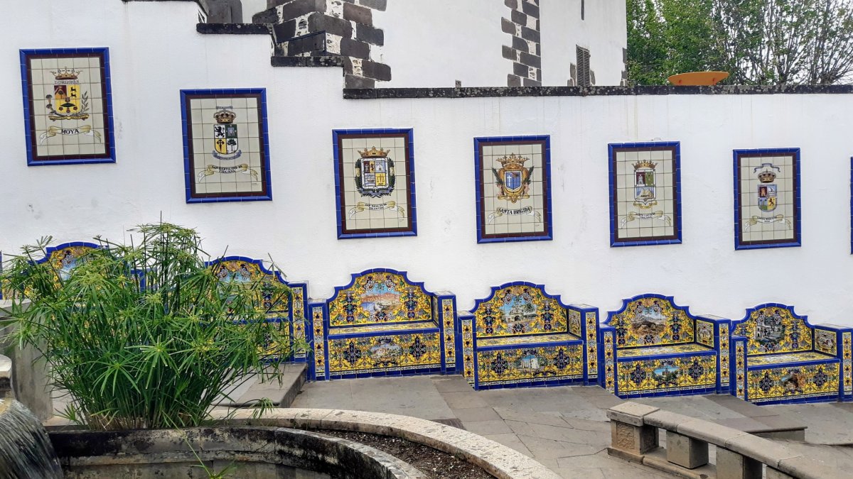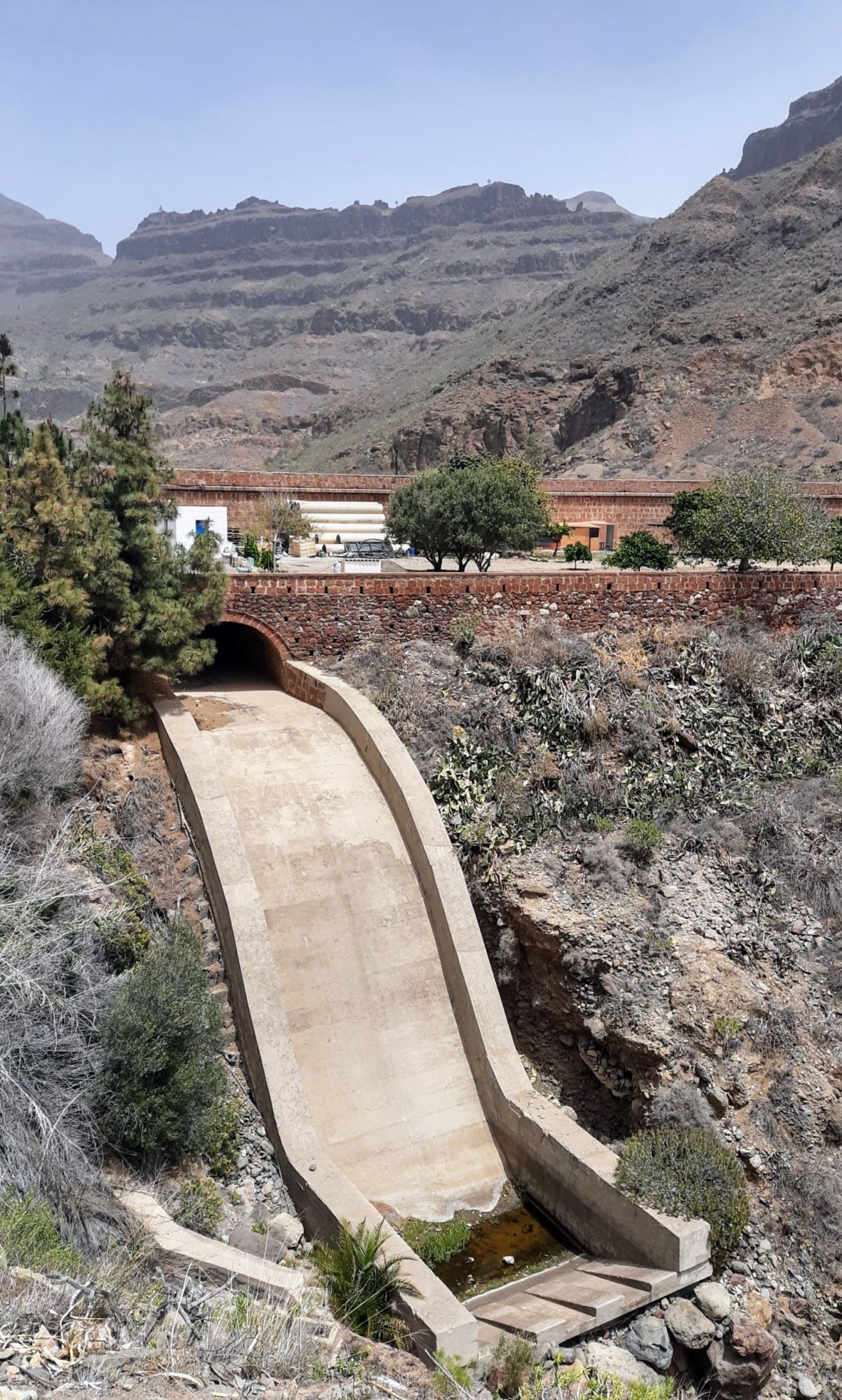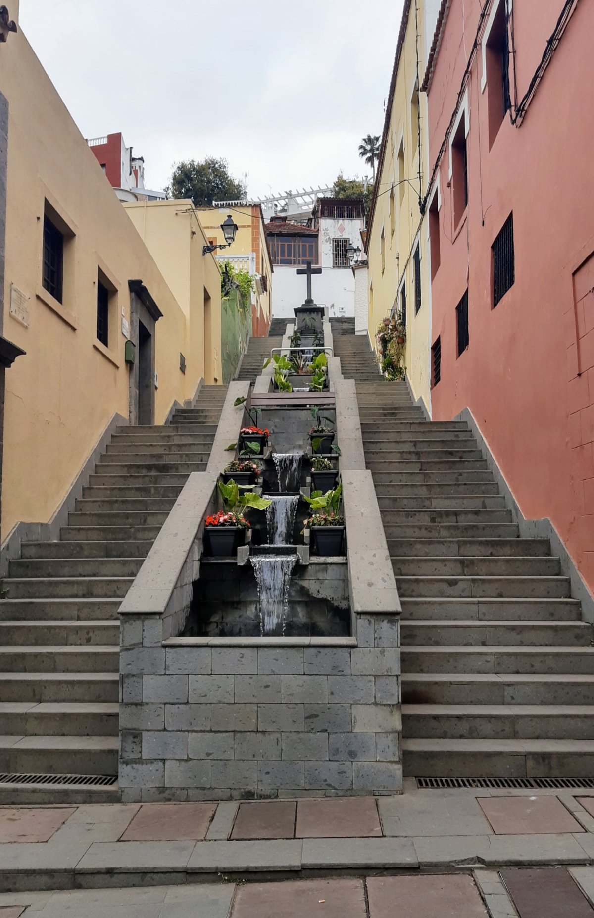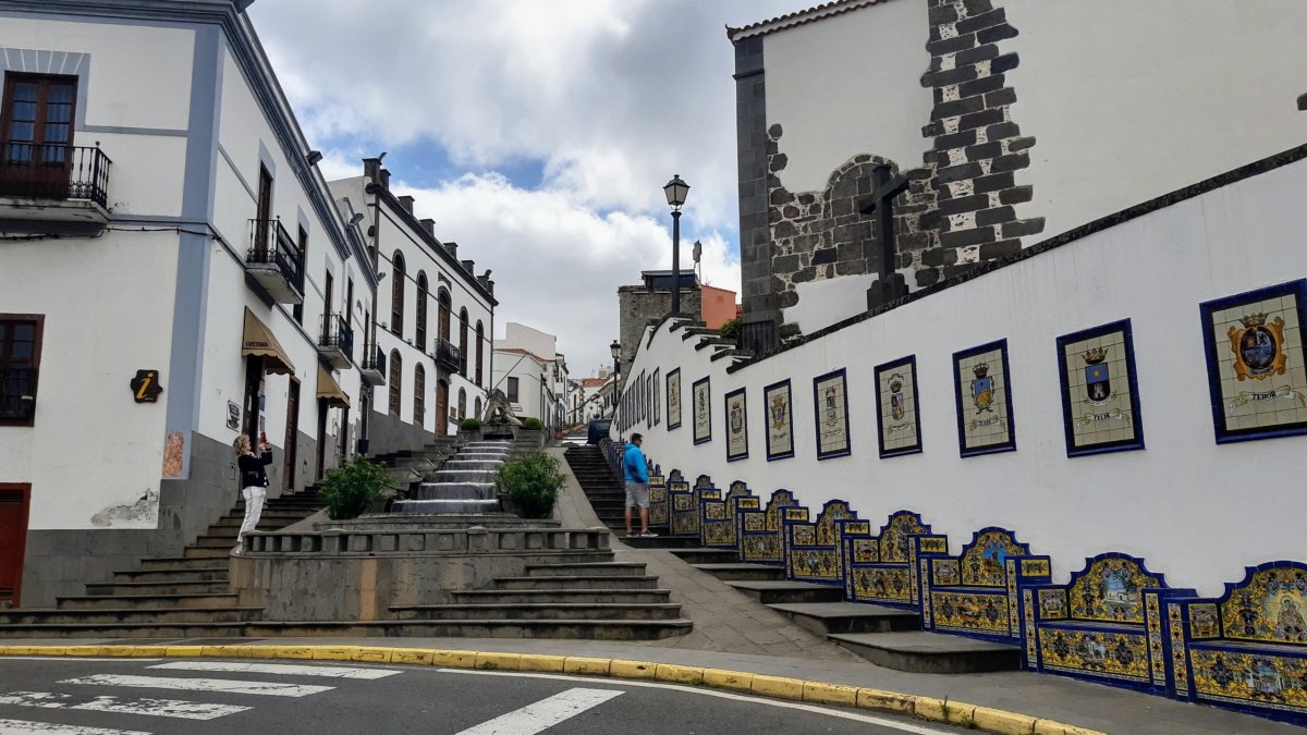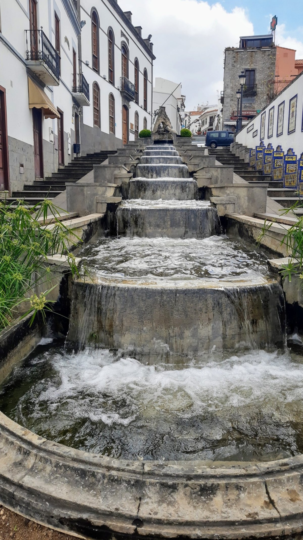 Další naší zastávkou je vesnička El Pagador hned vedle dálnice, což je úzký skalnatý poloostrov, na němž je postavena vesnička dvou řad bílých domů s páteřní úzkou uličkou jen pro pěší. Z vyhlídky s restaurací sledujeme divoké vlny, které tento den mají místy dosahovat prý až 7 metrů. Pokračujeme zpět do kopců do městečka Firgas. Zde je zajímavostí vodní kanál z hor, který vede napříč městem a pokračuje až do Arucasu. Historie kanálu sahá až do 15. století a v minulosti byl využíván i jako sklepní prádelna pro místní měšťanské domy. V centru tohoto malebného městečka s kostelem a spoustou dalších historických budov je kanál vyveden na povrch do vodní kaskády na centrální promenádě, kolem které jsou umístěny barevné kachlíkové lavičky. Nad vodní kaskádou pokračuje promenáda betonovými modely jednolivých Kanárských ostrovů, kdy u každého je příslušný znak/erb a kachličková mozaika s typickým krajinným výhledem pro ten který ostrov.