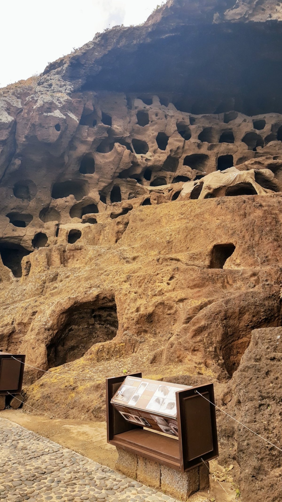 Když se ale napojíme na GC605, tak na této o třídu vyšší a pohodlnější cestě míjíme dvě přehrady a divoká scénerie je jak z obrazů od Buriana, už jen aby vyběhly ty druhohorní potvory s dotáhly atmosféru k dokonalosti. My dále přes nám již známý horský střed ostrova míříme na sever. Počasí, na jihu teplé a příjemné, se skokově mění. Teplota klesá na 10 stupňů, déšť a silný vítr. My tak projíždíme sopečnou krajinou, která je překvapivě nadmíru zelená a barevná, místy si připadáme jak u nás v lesích, jen místo smrků jsou zde borovice. Po zhruba 3-hodinové cestě (!) přes střed ostrova a absovování asi tak tří ekvivalentů závodu 1000 zatáček Gustava Havla konečně dojíždíme na severní pobřeží, kde je naším prvním cílem archeologická lokalita Cenobio de Valerón. Jde soubor malých jeskyněk vykutaných do úbočí kopce, které měly mít dle dřívějších názorů naboženský charakter. Dle současných výzkumů se jednalo o sýpky původních obyvatel, kdy podobné lze nalézt i na jiných místech na GC.