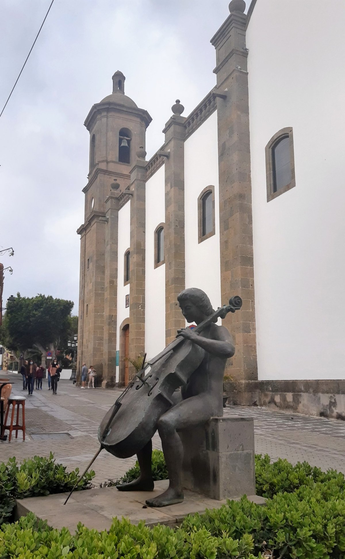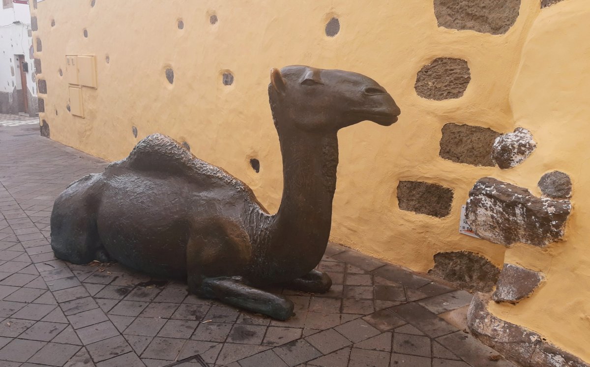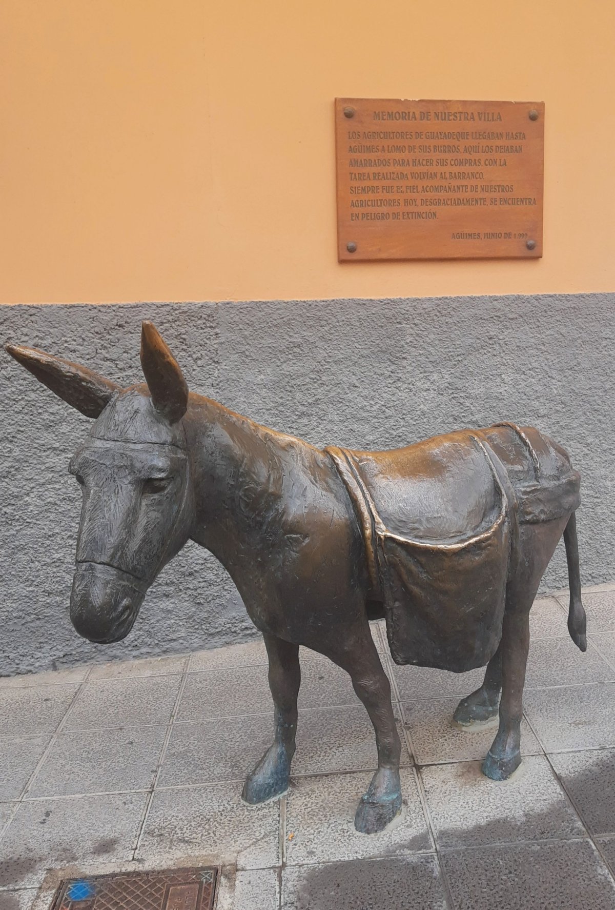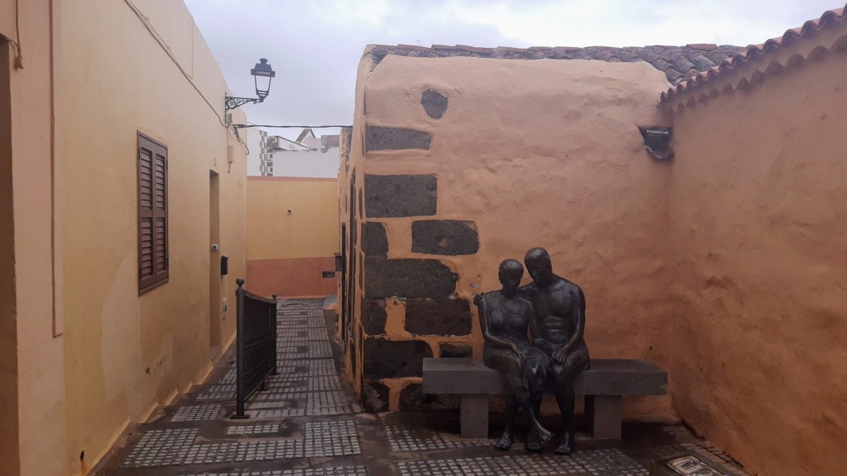 My chceme ještě v podvečer navštívit jeden z tipů paní Daniely, nejužší místní barrancu – del Barafonso, kterou křižuje cesta GC-550 pár kilometrů nad Aguimes. Bohužel, zrovna prší, takže nemáme odvahu jít v sandálech dolů, takže si aspoň jdeme projít ospalé podvečerní město s historickým jádrem, kterému dominuje kostel. A jak je zde i jinde zvykem, se spoustou zajímavých bronzových soch v životní velikosti. Zde nalézáme třeba velblouda, oslíka či párek milenců.