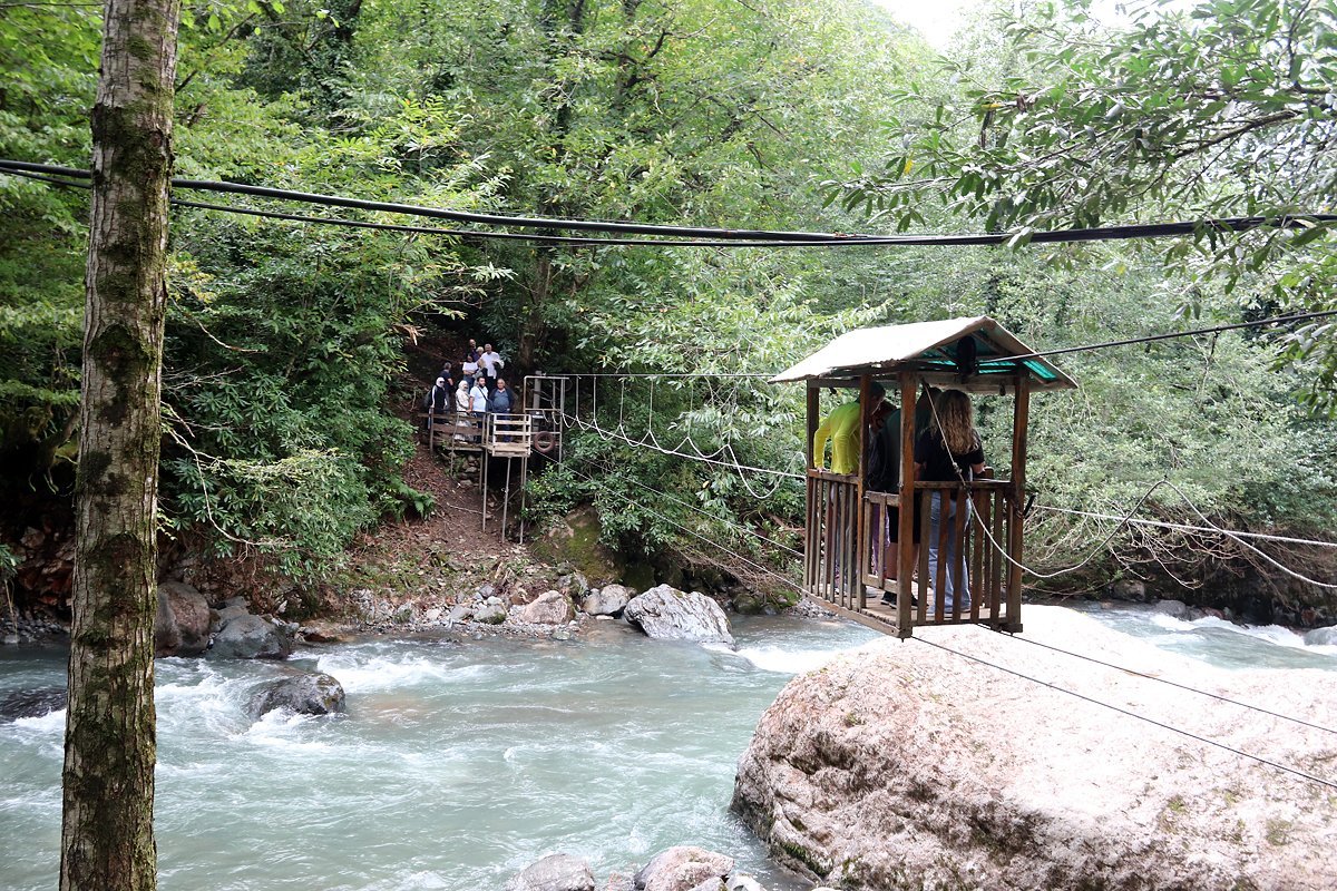 Po úzké strastiplné vozovce lemující řeku Chvakvistskali se dostáváme na parkoviště bugin Can-Am, které znám především z televizních přenosů a záznamů rallye Dakar. Odtud se speciální kabinovou "lanovkou" s vlastnoručním pohonem suchou nohou přeneseme přes výše zmíněný vodní tok. Dále nás provází žluté značení Klubu českých turistů. Nejzajímavější místo naší dobrodružné pralesní výpravy je malé horské jezírko. Národní park toho nabízí mnohem více. Především vodopády, jež byly nad síly nejmenších členů rodinné skupiny.