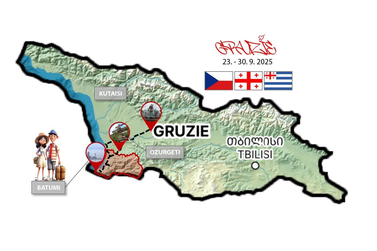 Na mezinárodním letišti v Kutaisi, kam přistáváme po čtyřhodinovém letu, nás vítá dav naháněčů duší. Jen, co se otevřeli automatické dveře, vstupujeme do hloučku nadšených taxikářů, jenž se nám snaží vnutit své služby. Počáteční výhodu znalosti prostředí na jejich straně se snažíme vyvážit českým "švejkovstvím". Když už jsme obrazně řečeno na lopatě, sedíce v dodávce s uříznutými bezpečnostními pásy, bereme rozum do hrsti a odjíždíme s novou eSIMkou objednaným "bezpečnějším" Boltem.