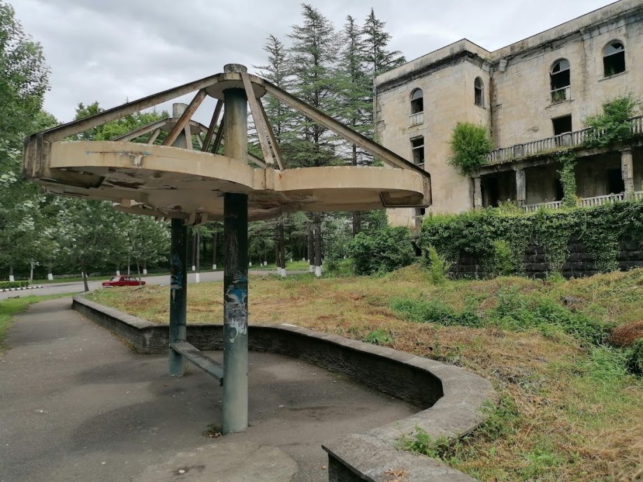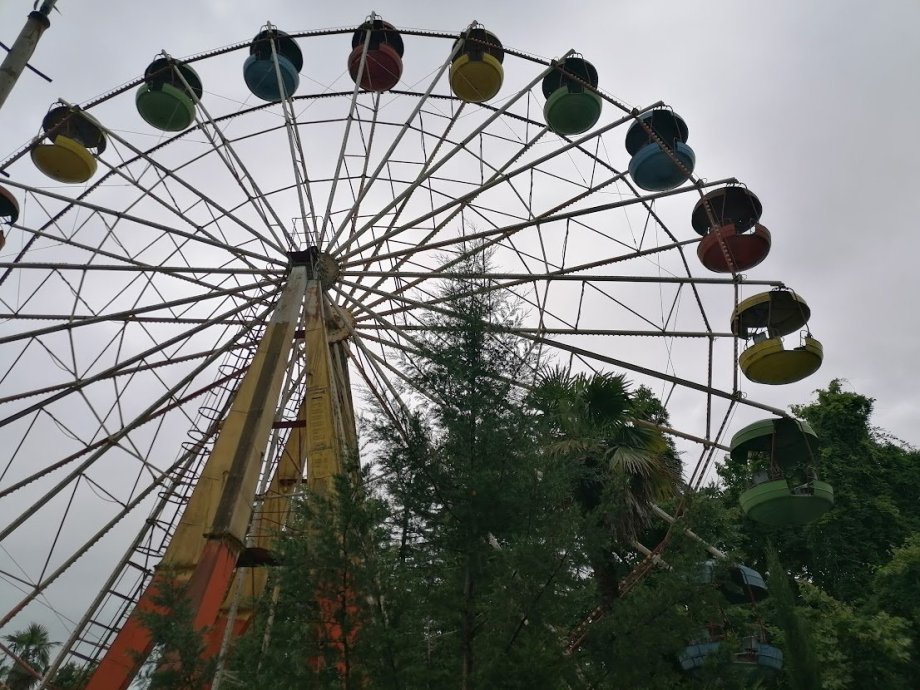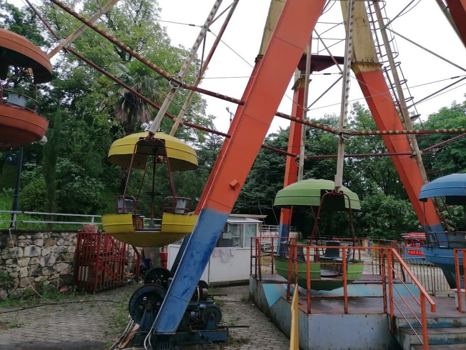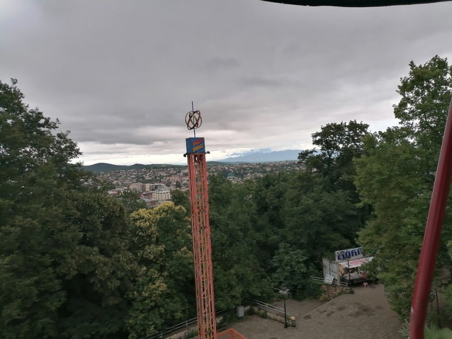 Po relaxaci jsme přes park zašli k místnímu operátorovi Magti, kde jsme za 160 Kč pořídili do J0Xova telefonu sim kartu. Lanovkou jsme se nechali vyvézt k zábavnímu parku Besik Gabashvili a opět jsme se projeli ruským kolem, hodně podobným tomu, které nikdy použito nebylo a nalézá se v Pripjati. V Kutaisi je hodně zrezlé, ale přežili jsme jízdu a pohled z něj na město, řeku Rioni a Kavkaz je moc pěkný. Pršet už přestalo, ale nebe zamračené bylo. V parku se nalézá i restaurace, ve které jsme si v roce 2018 docela pochutnali. Letos nám však štěstí nepřálo, bylo zrovna obsazeno a tak jsem si nemohla vychutnat Kozla pod slunečníkem a na židlích, označených logem českého pivovaru.