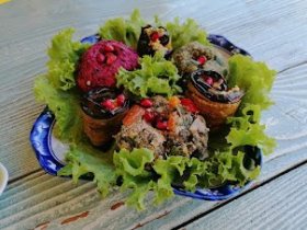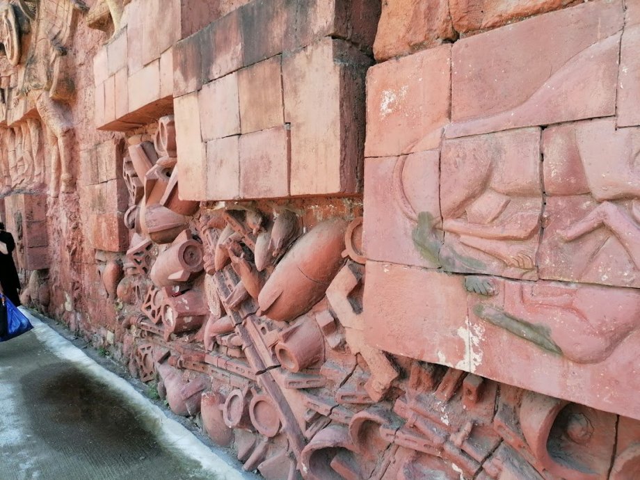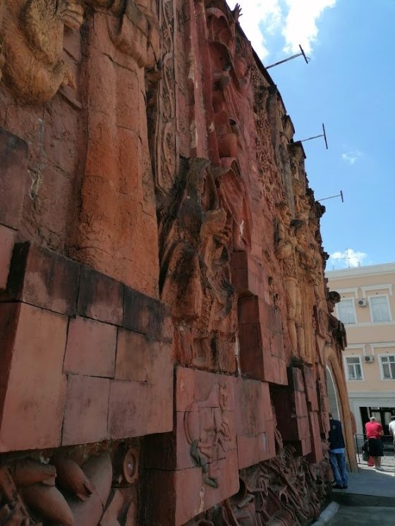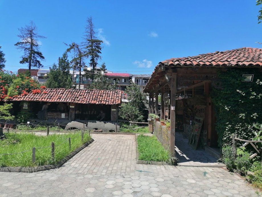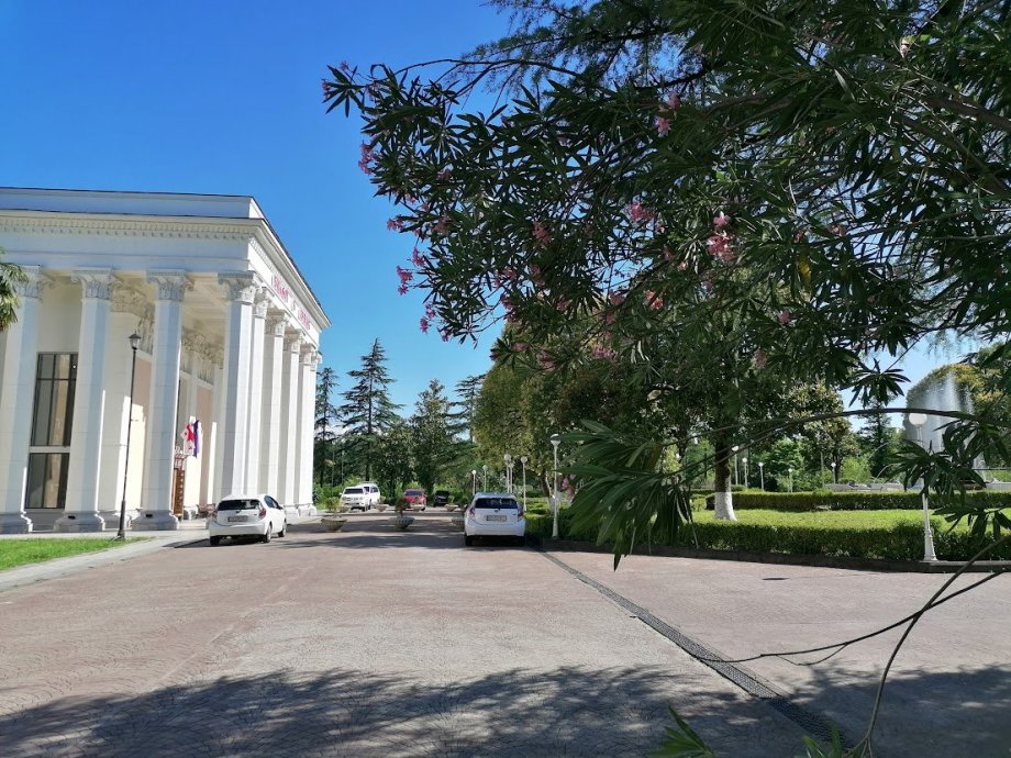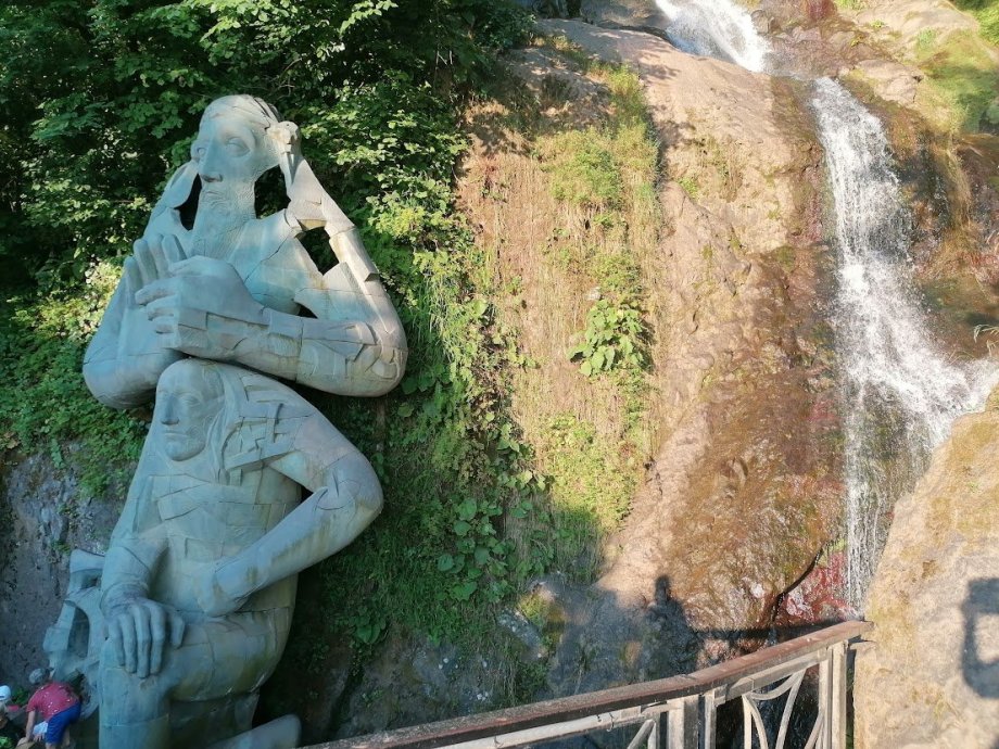 V neděli 2.7. jsme nejdříve posnídali v hotelu. V recenzích na booking byla snídaně hodnocena velmi dobře s upozorněním na to, že se jedná o typicky sovětskou lázeňskou krmi. Jednalo se tedy o řidší ovesnou kaši, špagety s tvarohem, na talířcích pak med, kysanou smetanu, slaný sýr Sulguni, jahodový džem, olivy a pečivo. Pro nás neobvyklé, ale když jsem kaši notně osladila medem, tak i trochu chutné. Po snídani jsme nechali naše věci na recepci hotelu a prošli jsme ještě místních pár sanatorií, muzeum (výklad pána v ruštině byl zajímavý, nicméně na mě až příliš obsažný, tedy jsem jej požádala o kratší variantu, což se však nelíbilo JOXovi). Pak jsme zašli do funkčních, krásně opravených lázní č. 6 s průčelím sněhově bílé plastiky, zachycující vražedného generalissima Josifa Vissarionoviče s rolníky, dělníky a pracující a studující inteligencí. V této budově jsme si dopřáli hydromasážní lázeň (258 Kč za osobu asi na 30 minut). Na pozdnější oběd, který postupně přešel do večeře, jsme zašli do restaurace Nektari, ve které měli jak dobré místní jídlo, tak i točené Natanghtari. Tak nám chutnalo, že jsme se k centrálnímu trhu dostali až v době, kdy už do Kutaisi žádná maršrutka nejela. Tak jsme vzali taxíka za 15 GEL a za chvíli jsme byli opět u kolchidské fontány. Vzhledem ke krásnému slunečnému počasí jsme ještě vyjeli lanovkou k zábavnímu parku. Pak jsme se ubytovali znovu v Guest House Kofi a zašli ještě do cukrárny Mio Gelato na výborné zmrzlinové poháry. V nabídce měli i voňavé horké wafle, na které však nezbyla kapacita, snad tedy příště v Kutaisi ochutnáme.
