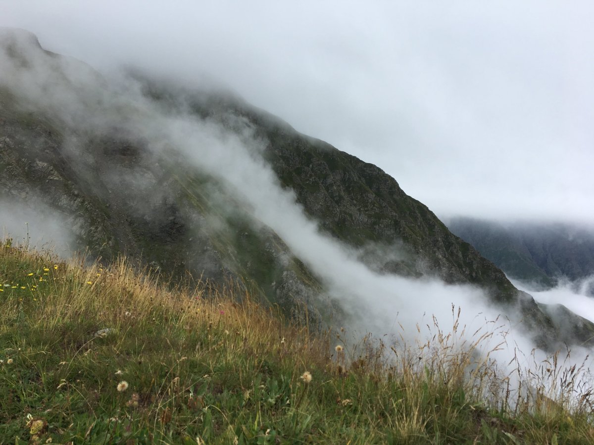 Druhý den jsme podle předpovědi očekávali sluníčko a modrou oblohu. Vrcholky hor se ale topily v mlze. Stoupali jsme bílou tmou, větrem a deštěm a já začala pochybovat, jestli jezero vůbec uvidíme. Protože se černé skalnaté jezero rozprostírá částečně v Rusku, vedla naše cesta přes stanici gruzínské pohraniční stráže(?). Mraky se trochu rozestoupily a my vytoužený cíl cesty skoro ve 3000 m.n.m. nakonec spatřili, jenom jeho velikost byla nakonec trochu zklamáním. Celí promáčení a zmrzlí jsme dorazili do druhého shelteru, ve kterém bohužel nečekal ani hlídač, ani oheň, jen pár kamarádů z prvního dne. Venku bylo, že by ani psal nevyhnal, a tak jsme se rozhodli strávit noc uvnitř.