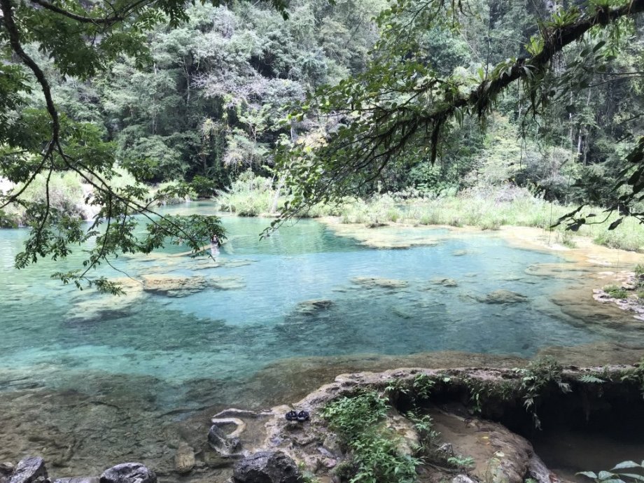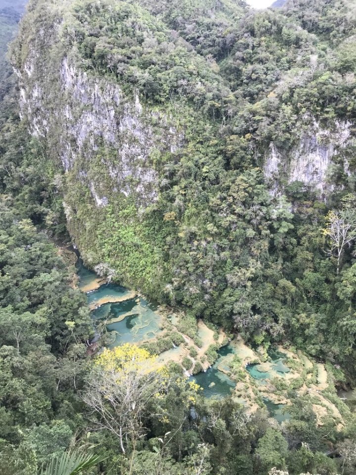Program začal asi hodinovou jízdou na korbě auta přes městečko Lanquin směrem do džungle, kde se Semuc Champey nachází. Výhledy jsou opravdu skvostné. Dopoledne patřilo první části exkurze, kterou byla asi hodinová prohlídka zaplavené krápníkové jeskyně Kan'Ba, ve které si na cestu (nebo spíše plavbu) svítíte poskytnutou svíčkou. Po obědě jsme se vydali na vyhlídku na samotný Semuc Champey a vlastně dost ocenili skutečnost, že se počasí pokazilo. Dle zkušeností jiných cestovatelů bývá výšlap v klasickém horkém, vlhkém počasí k nevydržení. Nám bylo vcelku příjemně. Po pohledu z vyhlídky dolů jsme se už nemohli dočkat koupání v nádherně vypadající vodě. Zajímavostí je, že nejznámější krasová jezírka jsou přírodním mostem, pod kterým protéká samotná řeka. Celou dobu před výstupem na vyhlídku se tak budete dívat na poměrně nelákavě vypadající zkalenou vodu hnědozelené barvy a budete pochybovat o existenci avizovaného ráje. Ale on se objeví :) Po prozkoumání průzračných jezírek jsme se vydali pomalu na cestu zpět. Zpětně hodnotím cenu 185 Q se vším všudy (tedy jen bez oběda) za aktivní den plný unikátních zážitků jako velmi příznivou, celý zážitek patřil k jedněm z nejlepších za celou dovolenou. Praktický tip: nezapoměňte na repelent a pro prolézání jeskyně na boty do vody.