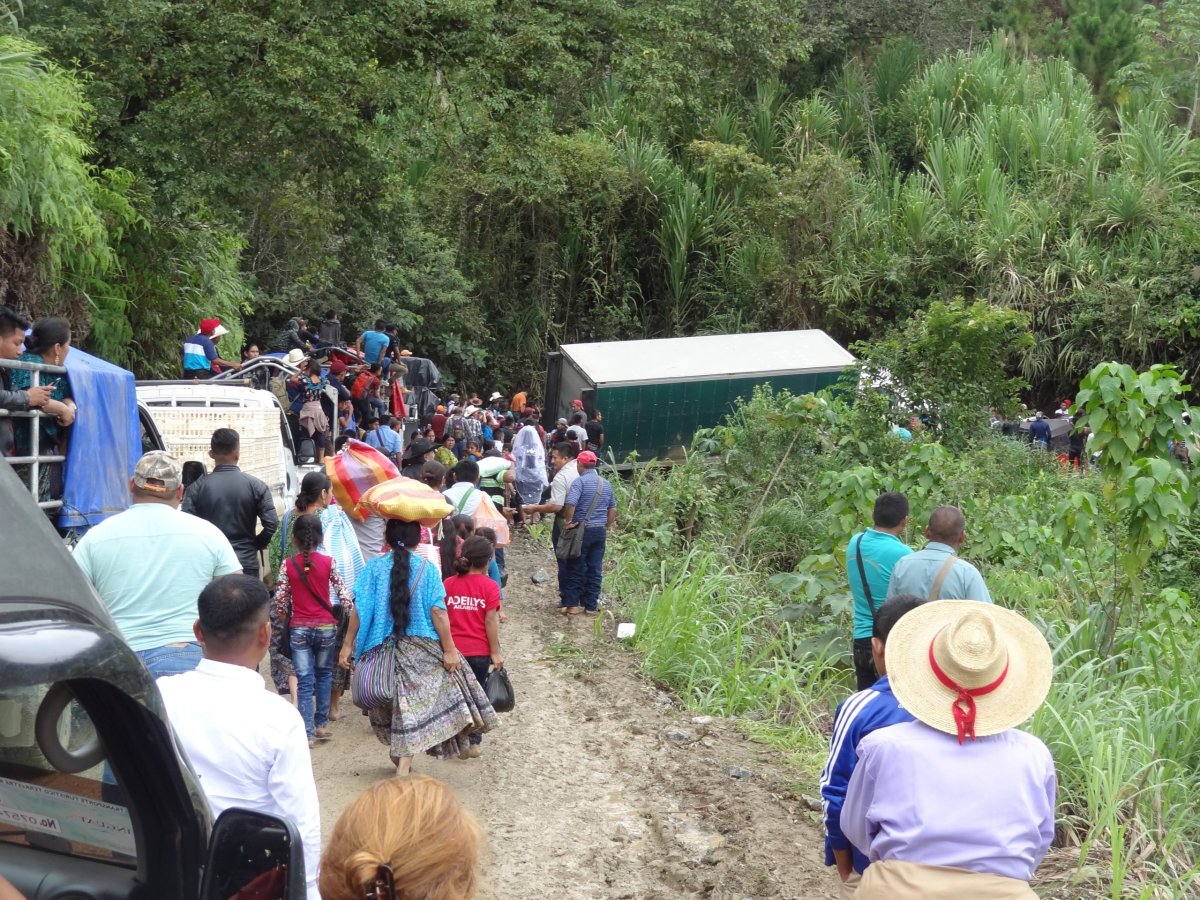 Byli jsme ujištěni, že jsme překonali nejhorší úsek cesty a dále všechno půjde hladce. Po další hodině jsmě nicméně dojeli ke koloně, na jejímž konci byl kamion, pod kterým se sesunula promáčená půda ve svahu, v jednom směru a druhý kamion, který se pokoušel blokádu na silnici neúspěšně objet, ve směru druhém. Po pár minutách nám sám řidič trochu zaoufale řekl, že na čas do Rio Dulce Town nepřijedeme. Začali jsme vymýšlet, co dál, ale po chvíli jsme zjistili, že polský pár z našeho minibusu míří do hotelu přímo přes řeku naproti našemu a jim byla nabídnuta lodní doprava v ceně 90 Q za osobu (oproti našim 500 Q za 2 osoby), což byla dokonce lepší cena než oficiální sazba pro cizince za jízdu ve veřejné loďce (dvojí ceny jsou v Guatemale úplnou normou). Sympatický Polák ihned vyjednal možnost spolujízdy a my jsme tak měli přesun vyřešený. Proti očekávání se situace na silnici vyřešila asi po 30 minutách, kamion blokující protisměr vyjel a my se tak vydali na cestu. Pan řidič byl extrémně snaživý a doháněl ztracený čas co to šlo. Díky jeho schopnostem jsme nakonec do rušného Rio Dulce Town dojeli dokonce už ve 14h a měli čas i na rychlé občerstvení.