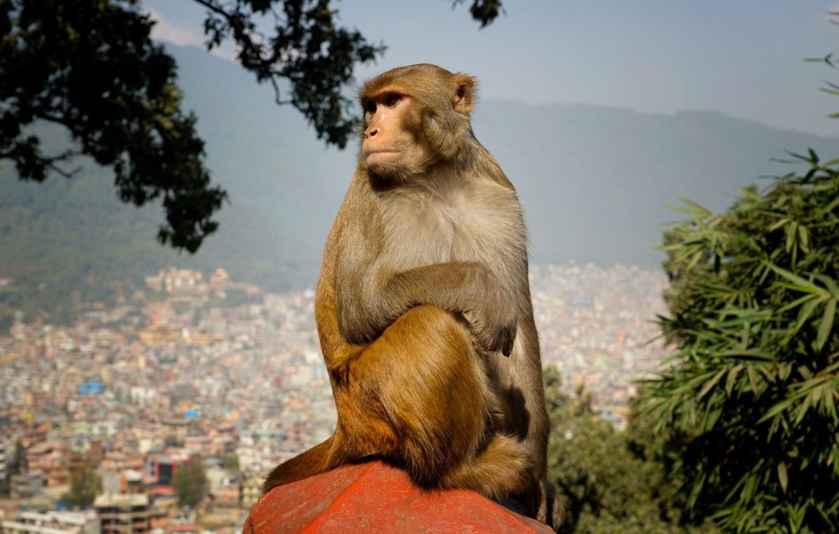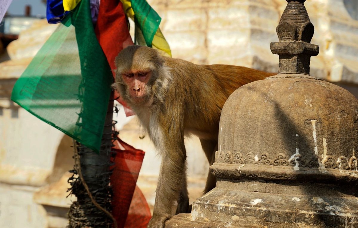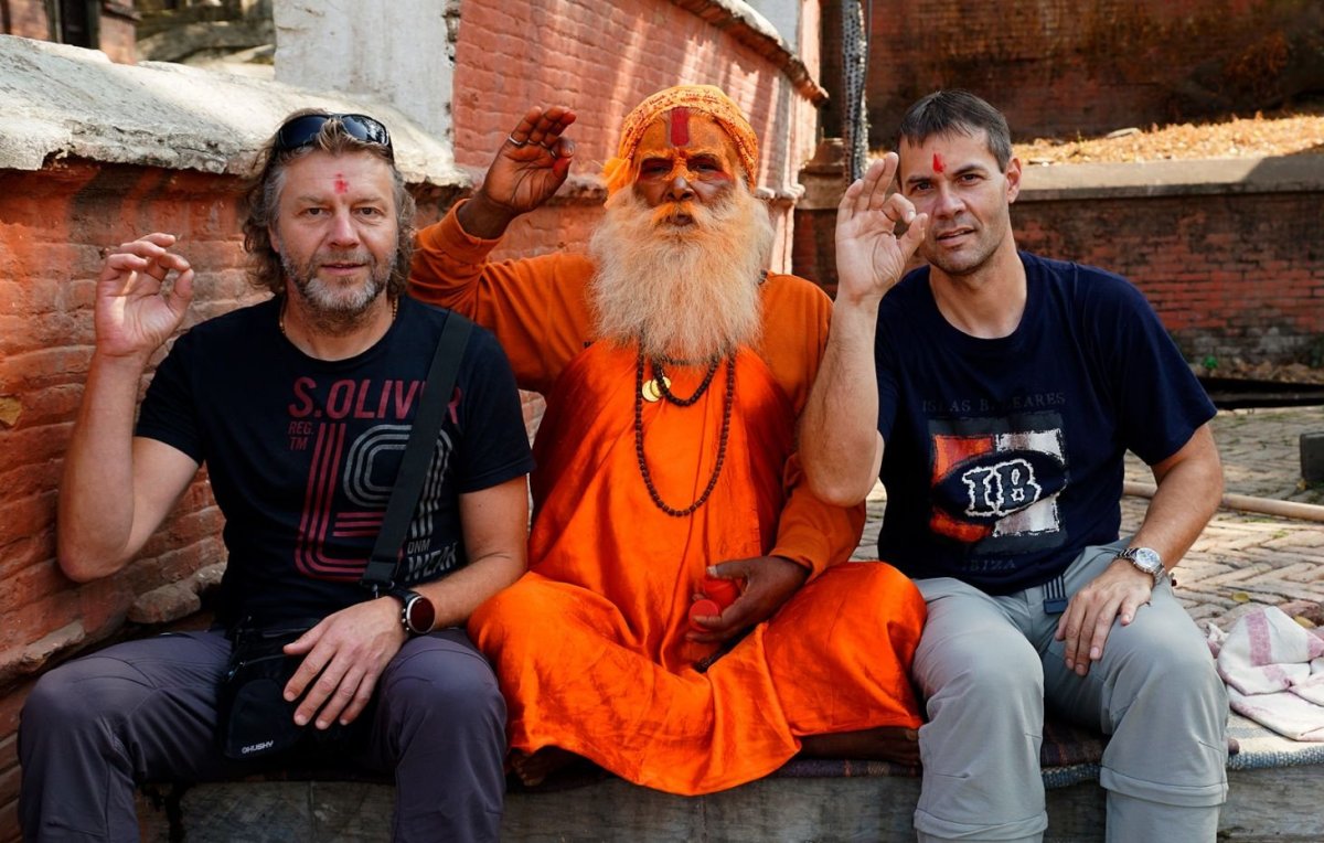 Já průvodci: „Myslíš, že si ho můžu vyfotit“? Průvodce:“ Počkej já se ho radši zeptám“. Pak něco drmolí se sádhusem/hercem a říká tichým hlasem (jsme přece na svaté půdě), „jo můžeš, i Ti požehná“. Jsem u vytržení, dálná mystika Asie se zhmotnila. Říkám průvodci.“ Asi bych mu měl něco dát, že jo“ a průvodce šeptá,“ je to svatý muž, ale z něčeho žít musí, něco mu určitě dej“. Vytahuju pětistovku, což je na naše stovka a za fotku mi to přijde ok. Průvodce na mě kouká a říká“ Hele počkej to je málo, dej mu aspoň tisíc“. Jo ok, nejsem držgrešle, ale lacinej sádhus to teda zrovna není. Vytahuju z peněženky slona, který je vyobrazený na jejich bankovce tisícovce, 200 stovky na naše za fotku. Sedám k sádhu manovi, ten něco drmolí, pak mi namaluje červenou svislou čárku na čelo. Doufám, že tím nic nenaznačuje, co jsem… Průvodce to fotí, volám na kámoše, pojď se taky vyfotit. Ten nejdřív nechce, ale mystická chvíle za tyhle prachy ho zmáhá stejně jako mě a tak jde k nám. Opět drmolení, foťák fotí, stěrače stírají… a Sádhus se najednou nakloní říká kámošovi…, fausnd. „Cože“? Fousnd, no prostě bylo druhý focení, takže zase za tisíc. Fousnd je thousand. A tak měl sádhus vyděláno cca 20 dolarů za dvě minuty práce a průvodce možná provizi. Je to svatý muž, ale pod tisíc za fotku nejde. Anebo taky ne, a to je na tom to nejlepší. Protože v Nepálu nikdy přesně nevíte, co je vlastně realita. Hodina prohlídky uběhla, jdeme pomalu zpět k východu. Průvodce se evidentně těší na svou odměnu, vytahujeme pětistovku a průvodce říká, že je to jako za tisíc. No dobře, dáváme mu zase slona, tedy tisíc rupií. No a frajer, jakože za každýho tisíc. Ty jo, má slušnou mzdu, dáváme mu každý tisíc a Jarda naznačuje, ať mu teda navalí zpátky to první pětikilo. Chvilka zaváhání a nepálská nátura se projeví… „Víš co, to pětikilo mi taky nech“. Vyběhl s námi parádně, tlemíme se tomu ještě v taxíku a uháníme na budhistický komplex Swayambhunath neboli Opičí chrám. Atmosféra je tu jiná, je tu klid, docela čisto a celkově to působí optimističtěji než u hinduistů. Všude vlaječky, turisti a opice. Opice je Makak Rhéza, co jsem našel na netu. Nicméně těm opicím je jedno co jsou, jsou to jen místní opice. Celému místnímu gangu opic šéfuje opičák největší. Je to manekýn a sedí výhružně nejvýš a všechno řídí, kousnout bych teda od něj nechtěl, zuby má suprový. Je sice listopad, ale tady je horko, jsme jen v triku. Jo a i v kalhotech, aby nebyly blbý kecy. Odpoledne máme rande s majitelem agentury, která nám zajišťuje povolení, dopravu, nosiče a průvodce. Večer ještě prolejzáme Thamel, neuvěřitelně zmatenou čtvrť v centru města s miliónem krámků všeho možného. Krámky, lidi, psi, motorky, rikši , blázinec. Na hotelu máme Wifi a na ulici máme Hifi.
