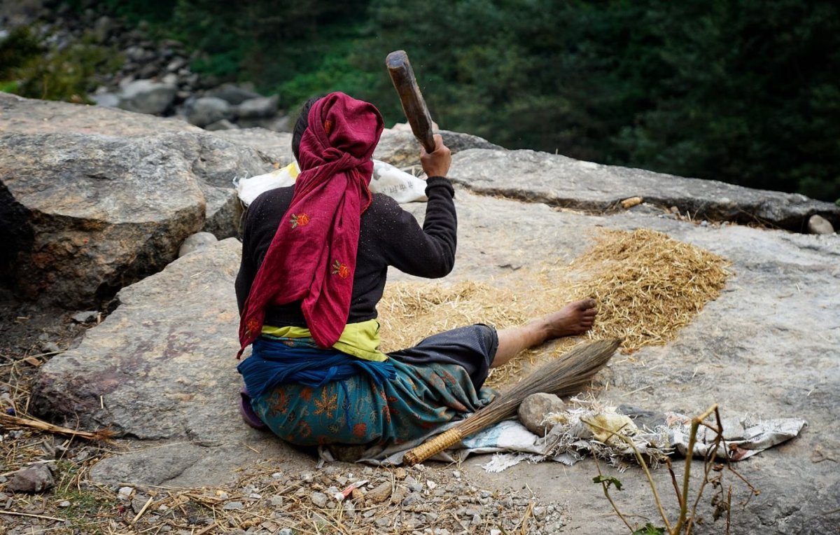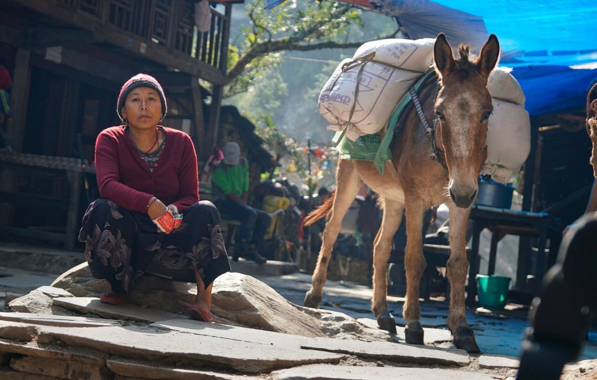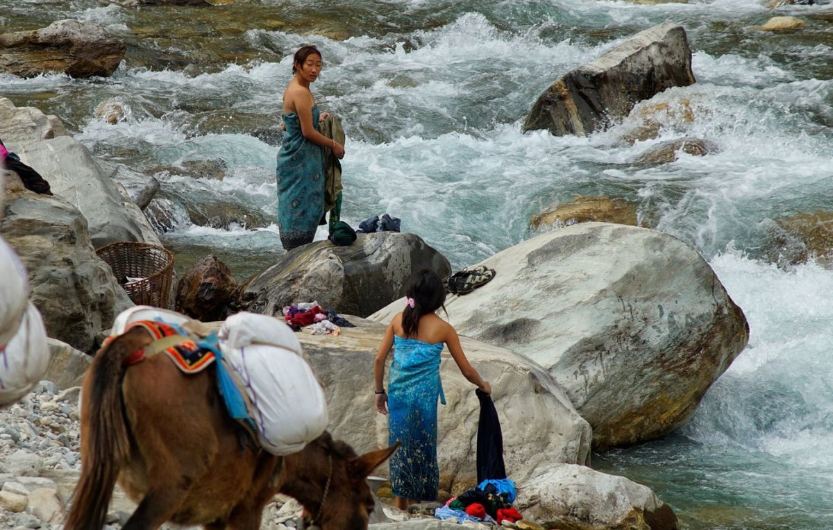Po ránu placky čapátí, big pot (velká konvice) černého čaje, zabalit a vyrážíme dál. Nejnebezpečnější zvíře v Nepálu není tygr, ale mula. Bez muly se neobejde nic, nosí náklad, ale na úzkých stezkách občas mula sestřelí někoho do údolí o pár set metrů níž tak nešťastně, že se o ty šutry zabije. Takže když jde nula a proti mula, tak platí, že nula se uhne mule vždycky na stranu ke skále. A že těch mul chodí. Potkáváme hodně žen, které mají v nose zlatý kroužek. Ptám se našeho průvodce Híry, jestli to něco znamená, nebo je to jen tak pro zkrášlení. „To znamená, že žena je vdaná“ odpovídá bez nejmenšího zaváhání Híra. Za 3 minuty potkáváme asi 4 letou holčičku opět s kroužkem v nosíku. „Híro a tohle taky něco znamená“? Híra se zamyslí a „Hm, tak to nevím“. Cesta stoupá nahoru a dolů, těch výškových metrů se nachodí opravdu hodně. Lidi se na cestě nějak rozprskli a žádný extra nával trekařů se nekoná. Ale zase občas někoho potkáme a pak samozřejmě večer v lodgích. Odpoledne dorážíme do Yuru Kholy, jsme už kolem 1 300 metrů vysoko a krajina se přece jen začíná mírně měnit. Ubývá banánů a přibývá bambusu. Přijímáme ubytování v prima chlívku v lodgích, ale už jsme relativně zvyklí. Rozhodně je nutné mít svůj spacák, slušnej spacák. K večeru začíná být chladněji. Ráz počasí je asi takový, že po ránu je jasno a jakmile vyleze slunce, začne se odpařovat z tropické džungle na jihu vlhkost, která jde údolím směrem vzhůru. Vznikne vzdušný opar a na focení je dobrá chvíle spíše po ránu. Po obědě se zatáhne a ochladí. Studený vzduch z hor se naopak tlačí údolím dolů a čím více se blíží večer, tím větší je kosa. Večer kolem šesté, sedmé se opět vyjasní. Noci jsou tak většinou studené a jasné. I během trekové sezóny může nastat pár dnů špatného počasí, kdy je viditelnost mizerná a dole prší a výše sněží. To je pak obchůzka na prd, že jo.