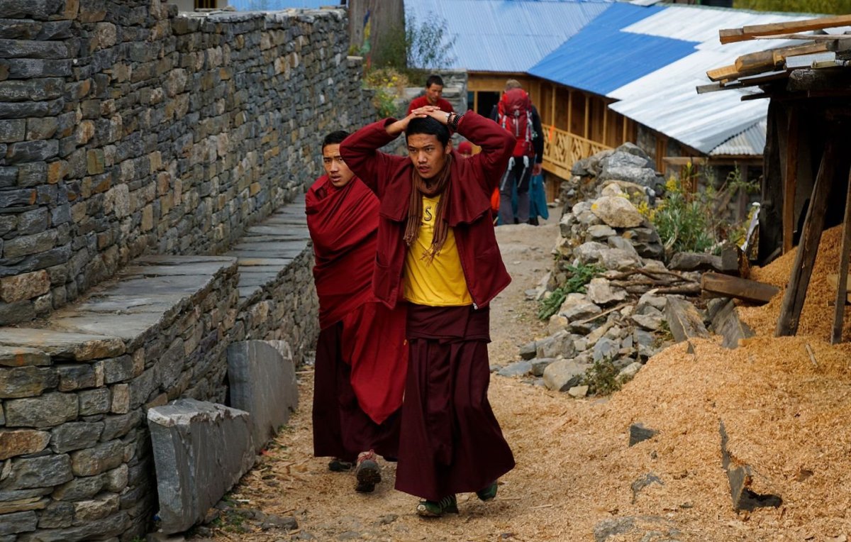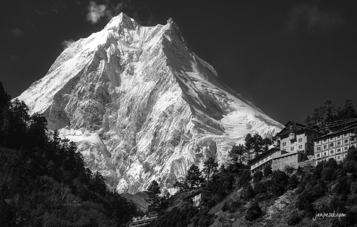 Je opět azurové ráno a průvodce slibuje, že dneska uvidíme Manaslu, osmou nevyšší horu světa. Pochodujeme nahoru a dolů, postupně nabíráme výšku už ke třem tisícům metrů. Po stoupáku lesem vycházíme na místo, kde nám padá přezka od báglu. Osmitisícová dvouvrcholová Manaslu, na jejíchž vrcholech jsou teploty kolem 30-40 stupňů pod nulou je tady. Fotíme, koukáme. Jenže to je teprve začátek. Po nedlouhé chvíli docházíme do vesničky Lho, kde je jednak něco jako obchod, a to i s toaletním hajzlpapírem, ale hlavně budhistický klášter a za ním nejparádnější pohled. Jsem ve výšce 3 130 metrů, koukám na klášter a o dalších 5 kilometrů výš se nad na klášterem tyčí v odpoledním slunci východní stěna Manaslu 8 163 m. Žádná fotka, žádný popis nedokáže vyjádřit pocit, když si říkáte, že ten kopec prostě není možný. Rozměry oproti Alpám jsou neskutečné, srovnatelné jsou snad Andy v Peru. Ale na rozdíl od And je tady k tomu historie buddhismu a lidské civilizace. Fotím, co to dá. Po obědě vyrážíme dál, díky postupné aklimatizaci nemáme problém s výškou. Později odpoledne dorážíme do Syalagaon. Vesnička ve výšce 3 500 m. Zima je hned, jakmile nesvítí slunce. I odpoledne. Další den se chystáme na východ slunce.