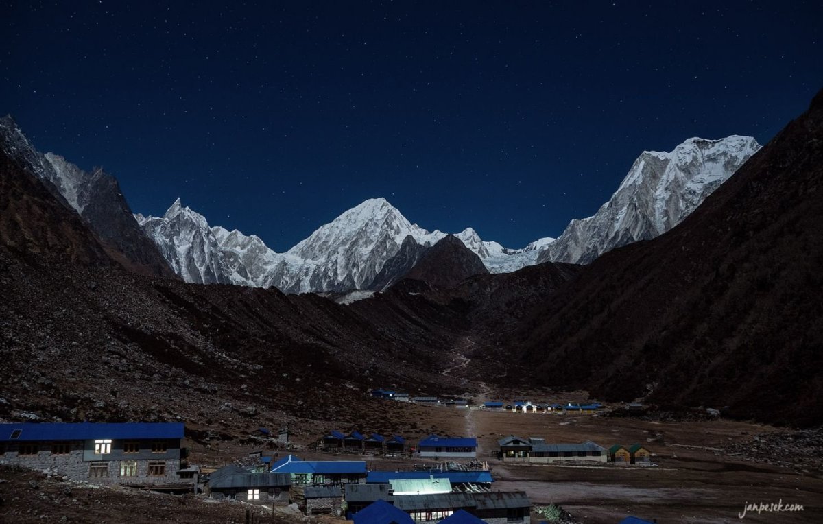 Je půl čtvrté ráno, zima jak na Sibiři, průvodce tvrdí, že běžně bývá 15–20 stupňů pod nulou. Nevím, jak moc je zima, ale mrzne dost. Nebe září miliónem jiných světů. Pokoušíme se obléct. V jídelně si dáváme zázvorový čaj. Ten pijeme již několik dnů, údajně je lepší kvůli případné výškové nemoci. Bereme čelovky, nosič Suthi má dneska dokonce tenisky místo pantoflí. Vyrážíme do tmy podél morény ledovce nahoru. Pomalu, pomalinku, ale stejně skoro všechny jiné party nakonec předcházíme. Na cestu nám svítí úzký kužel čelovky. Tenhle den má kolem osmi i devíti hodin, nic se neuchvátá. Postupně přichází svítání. Obrysy himalájských vrcholů se barví do fialové a obzor za námi získává nachový odstín. Světla je už dostatek, vypínáme čelovky a snažíme se vnímat všechno kolem. Příště se sem dostaneme až v dalším životě. Svítání v horách se neomrzí nikdy, jedno jestli na Šumavě, v Alpách nebo tady. Ve výšce vrcholu Mont Blancu, asi 4 800 metrů je regulérně něco jako mini čajovna. Podnikavý Nepálec tady na konci světa v téhle výšce prodává horký čaj. Postup se výrazně zpomalil, výška přes 5 000 metrů už je sakra znát. Občas se lehce zamotá hlava, dechu se nedostává. Ale jde to. Sedlo Larky pass není nějaký ostrý zlom, vůbec ne. Jakmile je člověk ve výšce kolem pěti tisíc metrů, začne cesta chvílemi klesat a stoupat, 50 metrů dolů, 50 metrů nahoru. Výhledy k nezaplacení. Kolem deváté dopoledne stojíme u čortenu, vlaječek a cedule, že jsme v nejvyšším místě treku, v sedle Larke pass 5 106 metrů. Někde se píše i 5 200 metrů, čert se v tom vyznej. Fouká brutální vichr, ruce omrzají, jen co člověk sundá rukavice, baterka ve foťáku taky pláče tou zimou. Azuro a prvně vidíme další část Himaláje směrem k Annapúrnám. Hory až do nekonečna za obzor. Děláme pár fotek jako důkaz, že i nula může být vysoko. Trek se překulil do druhé poloviny a mažeme dolů do tepla. Sestup je nepříjemný. Je poměrně strmý, je tu hodně kluzký štěrk, takže chytat tady zajíčky čili hodit tady tlamu by bylo blbý. Rozhodně je víc než dobré mít trekové hůlky, i kdyby to bylo jen kvůli téhle části. Jinak ani nutné v podstatě nejsou. Sestupujeme tedy příkře dolů do vesničky Bhimtang ležící ve výšce 3 800 metrů nad nějakým mořem, kam docházíme docela zbití odpoledne. Bhimtang je nádherně položená vesnička obklopená himalájskými štíty ze všech stran. K večeři dáváme pro změnu dal-bhat a pak do spacáku. V noci se vykopu ze spacáku. Jdu fotit hvězdy nad Himálajem. Je sice úplněk, to se hvězdy fotí blbě, ale jindy to už nepůjde. Sedím nakonec na nějakém šutru pár metrů nad vesničkou,a i v té zimě jen koukám. Okolní štíty a ledovce odráží kamsi do nekonečna měsíční svit a nad tím vším miliardy světýlek a jiných světů, co na tyhle kopce svítí už milióny let a budou i po nás. Jedna z těch nezapomenutelných chvil. No dost bylo romantiky, přepínám foťák na manuál a nějak to fotím.