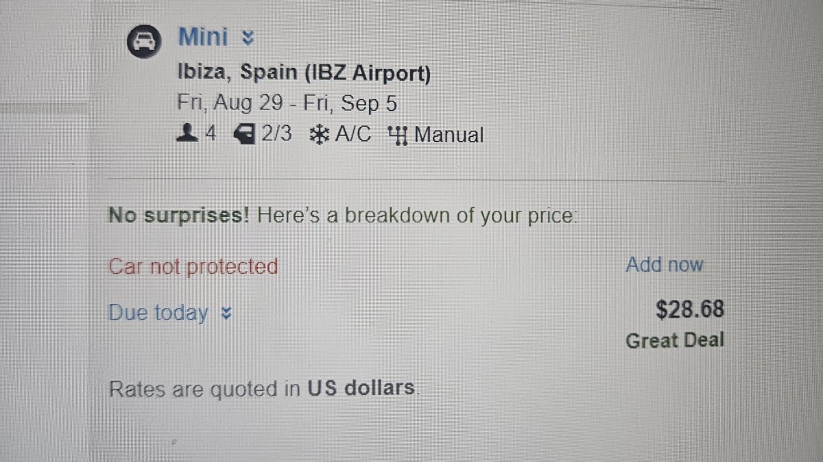 Samostatnou kapitolou této naší cesty bylo půjčení auta. V dubnu začínáme někde okolo 200 EUR na týden na Ibize, bez pojištění. S blížícím se termínem našeho pobytu cena klesala postupně klesala -140 EUR, 100 EUR, … až se ve finále dostávám přes Cheaptickets na neuvěřitelných 28 USD za výpůjčku malého autíčka na celý týden (!!!), bez pojistky.