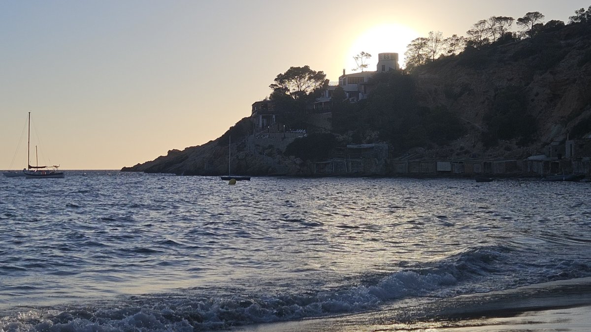 V pozdním odpoledni přejíždíme přes vesničku Sant Josep de Sa Talaia s obligátní krátkou zastávkou u kostela na pláž Cala d´Hort. Ta je zde evidentně populární, velké parkoviště v kopci cca. 400 metrů nad ní je skoro plné. Může za to parádní výhled na dva drsné skalnaté ostrůvky nedaleko od pobřeží. I dole na ní je celkem husto, ale severní část pláže je podstatně méně zalidněná. My zde vydržíme do doby, než slunce zapadne za nedaleký hřeben a mizíme. Na parkovišti nahoře už panuje solidní chaos, protože se tu sjíždí lidé, aby sledovali západ slunce do moře. I cestou na hlavní tah pak potkáváme kolony dalších zájemců, kteří už pak určitě nemají šanci nikde oficiálně zaparkovat. Večer ještě zajíždíme do Sant Antoni projít si opět hlučné a živé město, ale hoďka stačí, ten mumraj a hluk není pro nás.
