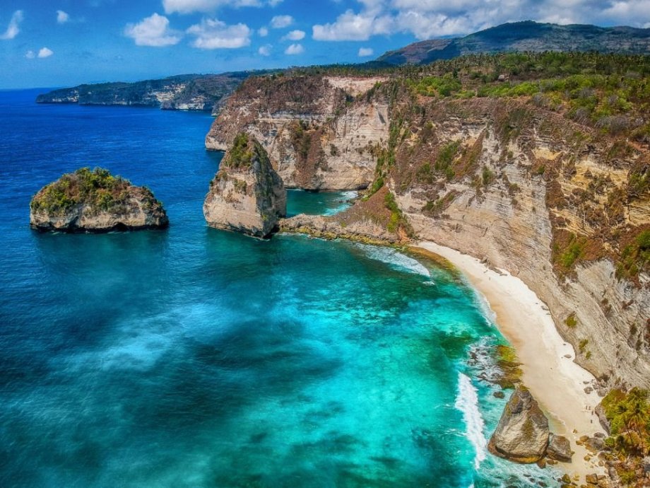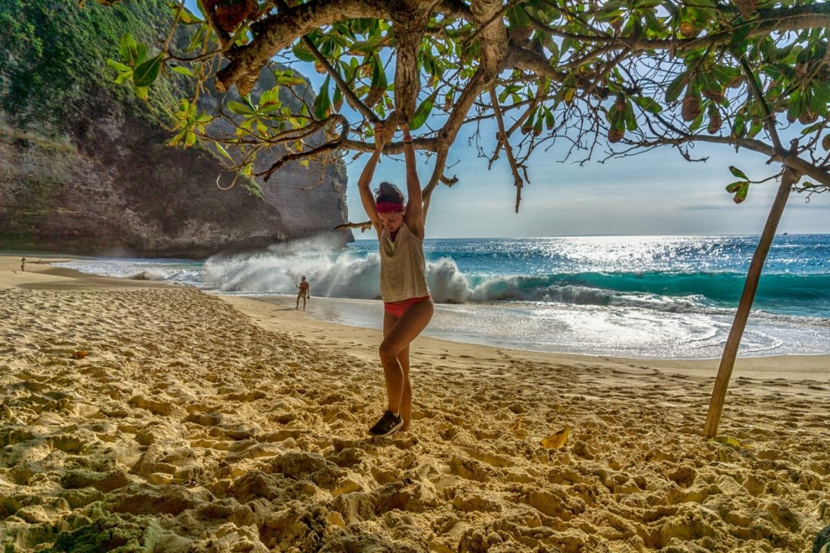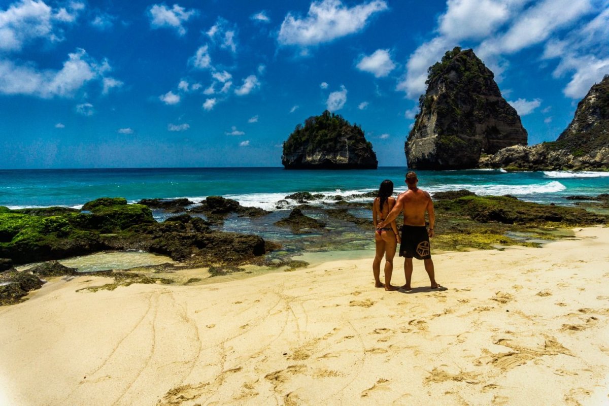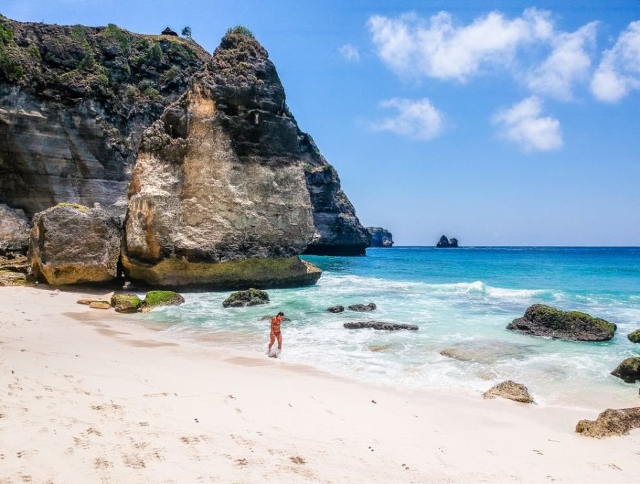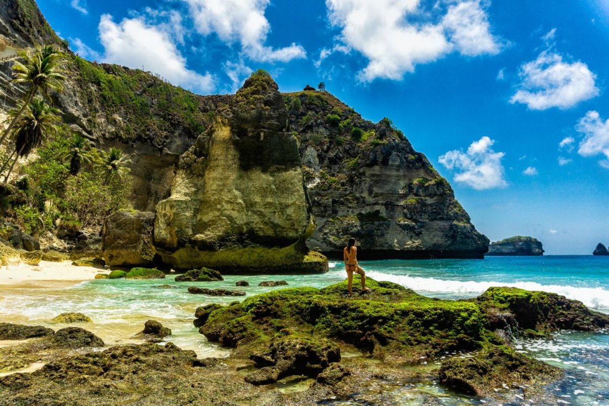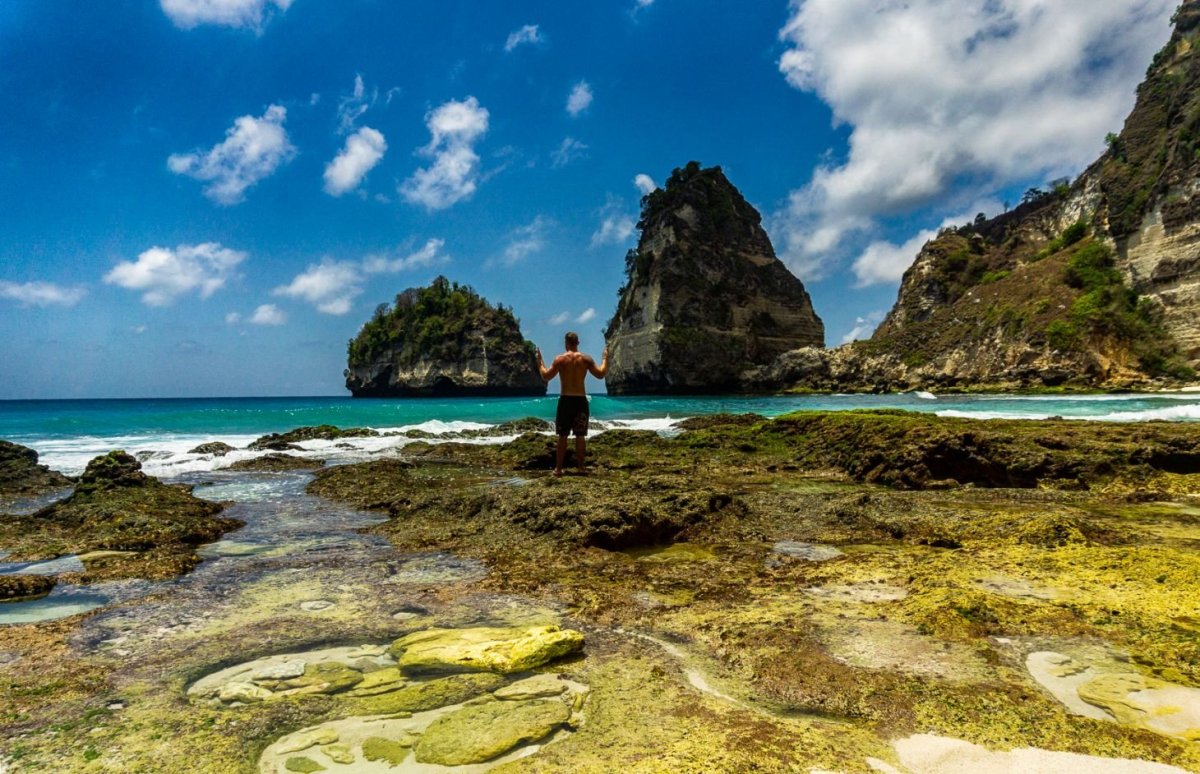 ➡️Atuh beach - Druhá nejhezčí pláž na Nusa Penidě. Přístup k ní je po vytesaných schodech o mnoho snažší než na Kelingking beach. Vlny tu jsou také celkem velké, ale můžete se aspoň schladit v přirozeně vytvořených bazéncích podél celého pobřeží. Navštívit můžete i pláž z levé strany, která je lépe přístupná a vhodnější pro koupání nebo vyhlídku Atuh Raja Lima z pravé strany, kde si můžete zarezervovat přes Airbnb i stylové ubytování v korunách stromů s výhledem na útesy u Atuh beach.