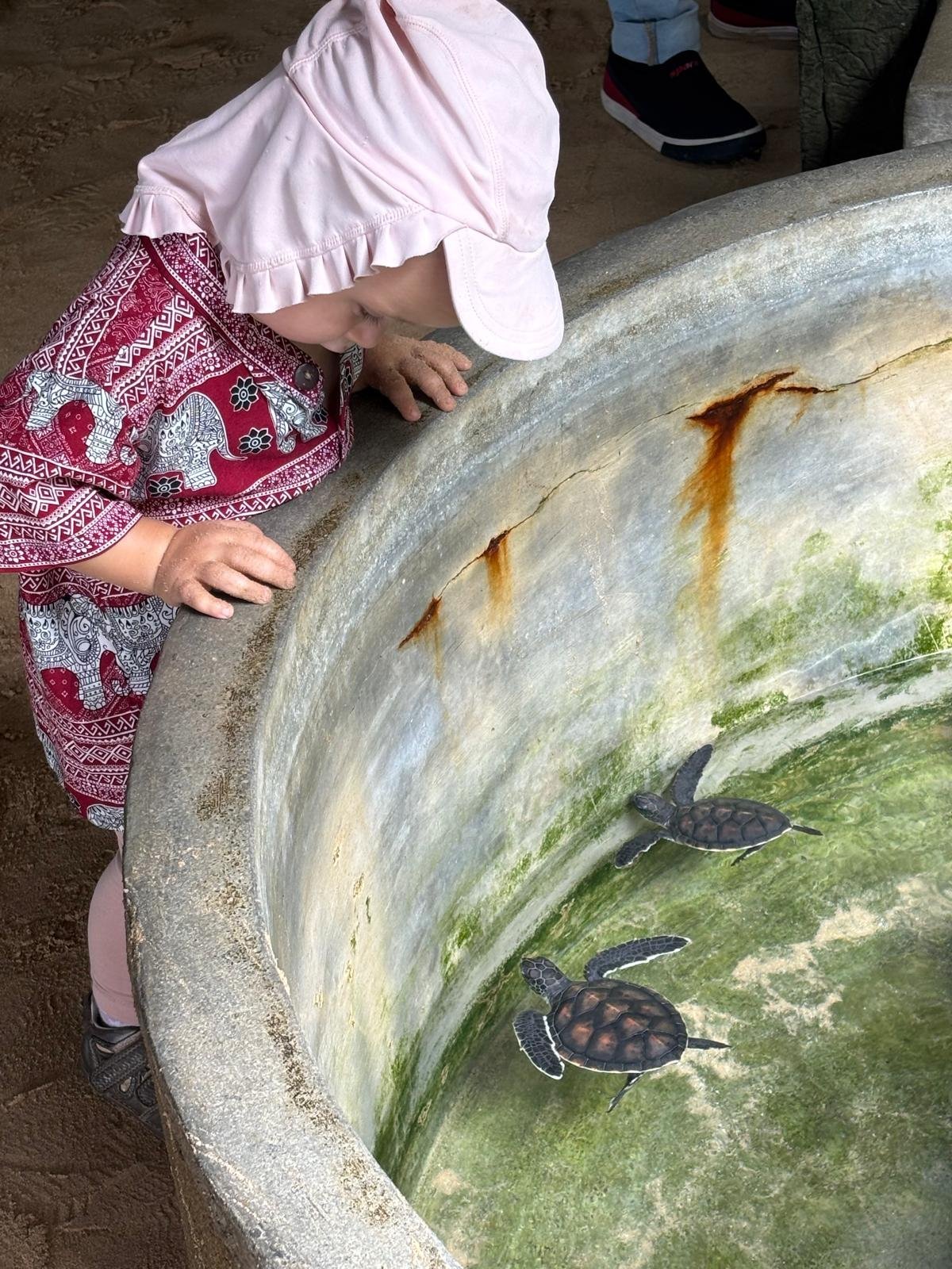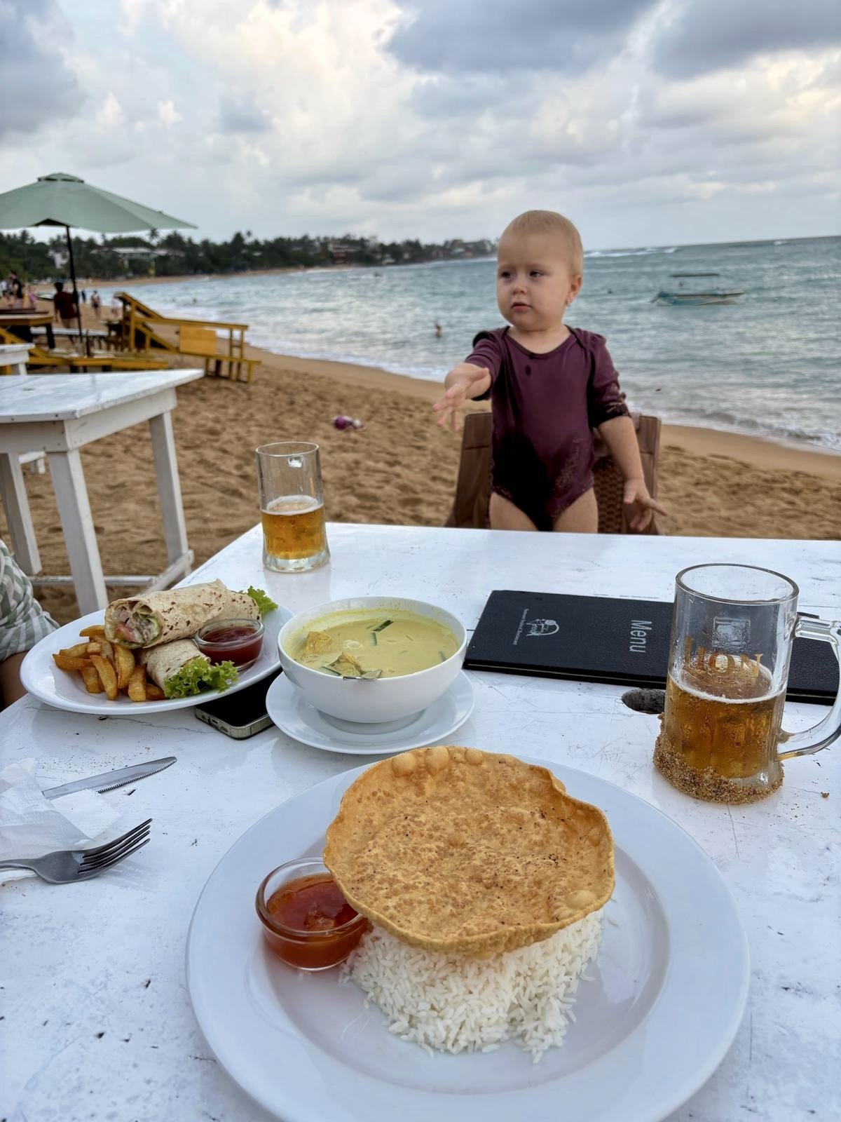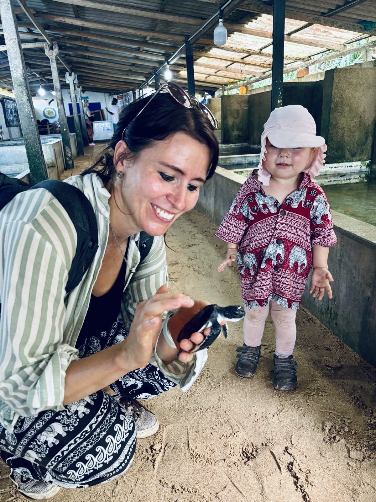 Na letišti, kde tři směnárny hned vedle sebe bojují o zákazníky překřikující se s nabídkami nejlepších kurzů jak na tržišti, měníme nějaké peníze. SIMka je tady k dostání za pár šupů, ale já jsem věrná Airalo. Horko, vlhko a tanečníci předvádějící své umění umocněné divokým bubnováním jsou tím pravým uvítáním po dlouhé cestě. Pomocí appky Pickme volám taxi a za chvíli se už řítíme mezi tuktuky, koňskými povozy a vším co se nějak hýbe v jakémkoli směru do města Negombo. Po půlhodince do sebe klopíme první drink v Blue Elephant Butique Hotel, kde se jen rychle vybalíme a procházkou jdeme na pláž. Obrovská písečná pláž s neuvěřitelně teplou vodou nás příjemně překvapí. Jen ty vlny. Em neodolala, a tak jí za snahy nás obou ji udržet nad hladinou, jiskří oči novým zážitkem. A jako jediné bílé nahulaté tělíčko mezi desítkami tmavými a oděnými budí patřičnou pozornost. Brzy je tma a my se hladoví a unavení vracíme na hotel na večeři. Zkouším tradiční kottu - kousky nasekané chlebové placky se zeleninou a kuřecím. Jídlo to může být dobré, jen v podání hotelové kuchyně je poněkud mdlé. Zapiju to čerstvým mangových freshikem a jdeme spát. Tu nejmenší ale dostihl slušný jet lag, který se zjevně kvalitním letadlovým spánkem vyústil ve střídavou potřebu házet si na terase s balonem a popírat maminčinu potřebu spánku. Kolem druhé hodiny ranní boj vyhrávám.