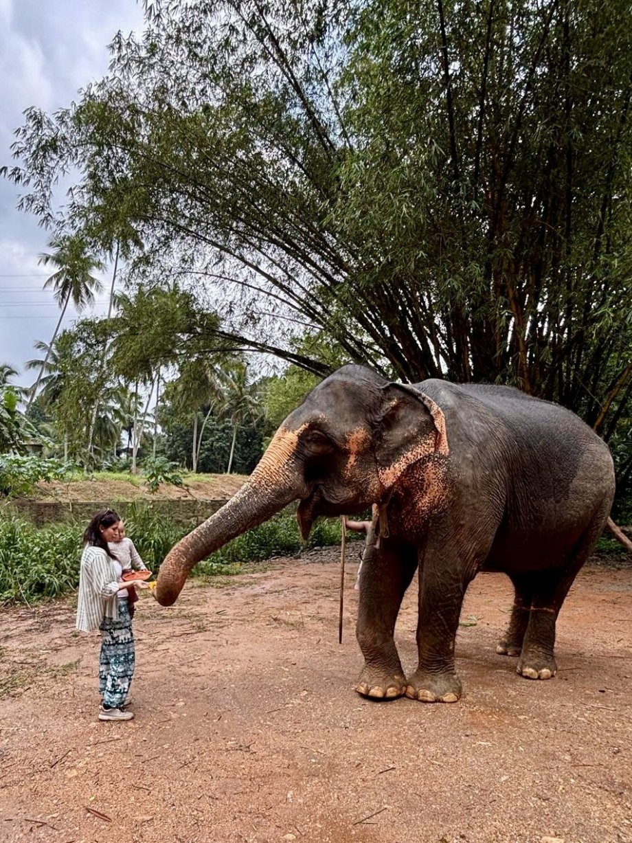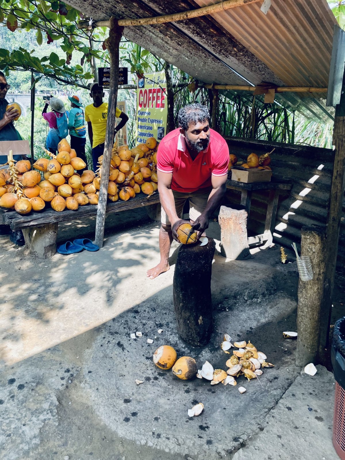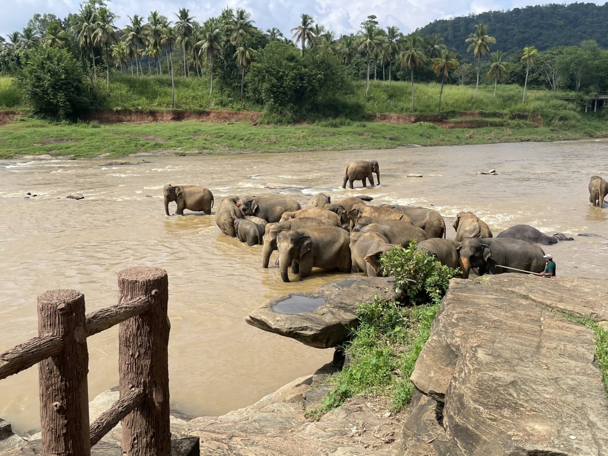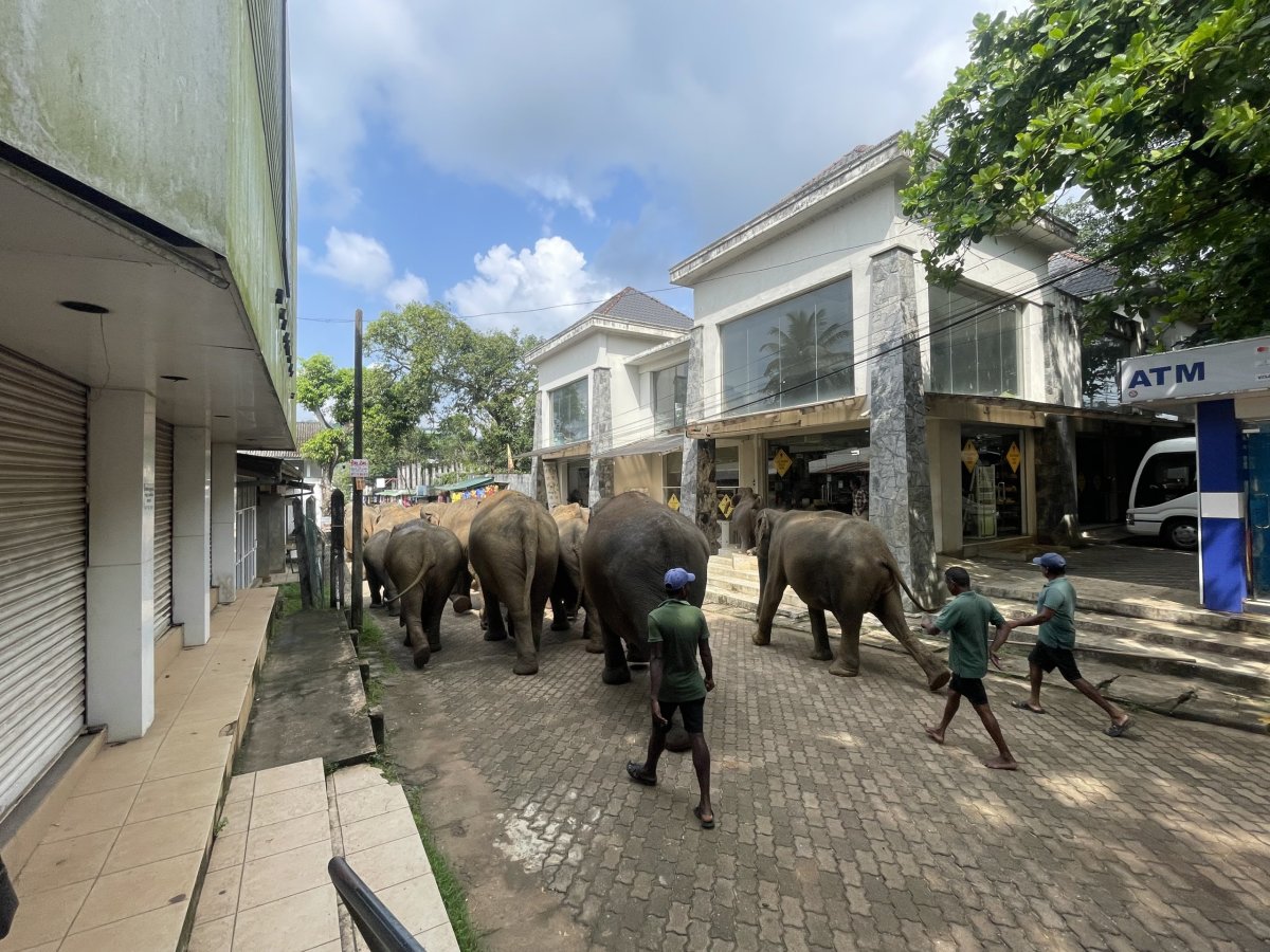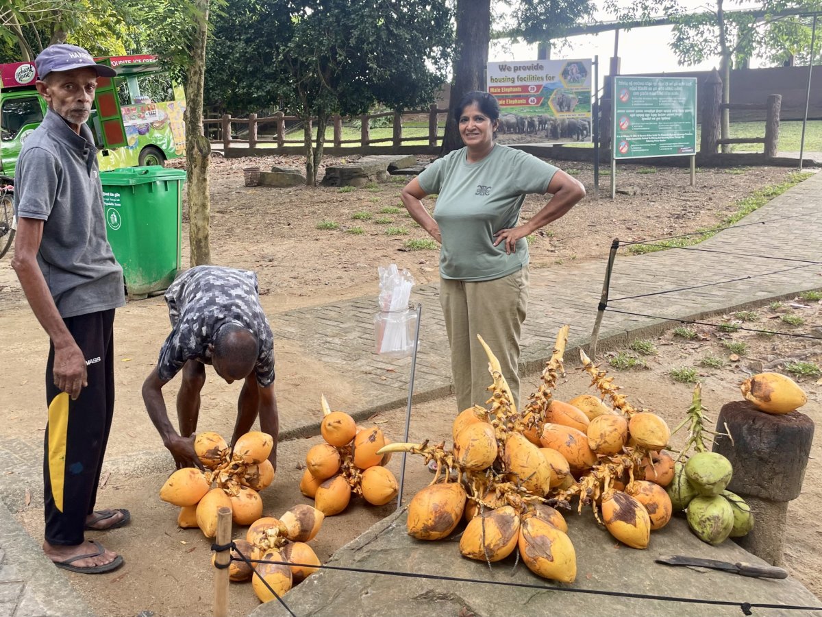 Po zkušenostech předešlého dne vstáváme s budíkem, protože v 9 nás má vyzvednout řidič Malith s průvodcem Nuwanem. Za své zpoždění asi 10 minut se vehementně omlouvají. A to jsou na cestě od čtyř ráno, kdy cesta pro nás trvala přes tři hodiny. Nátura je tady prostě jiná. Společně míříme do vesnice Pinnawala. Cestou nám Nuwan kupuje kokosový ořech a tradiční kokosové oplatky se zázvorovou limonádou jako pozornost podniku. Po asi dvou a půl hodinách, kdy nám dvakrát zkříží cestu leguán, zastavujeme trochu neplánovaně v Elephant Park Village. To je jediné místo, kde se kromě krmení člověk může na slonovi i svézt nebo ho umýt v řece. A tomu jsem se chtěla vyhnout, protože sloni při výcviku trpí a já jsem tento business nechtěla podporovat. Že se nejedná o sloní sirotčinec, do kterého jsme měli namířeno, jsme pochopili až po zaplacení vstupného. To se platí podle délky pobytu - my vzali 30 minut za nějakých 700 Kč s tím, že kdyžtak doplatíme. No v areálu jsme byli déle a nikdo po nás nic nechtěl. Protože pršelo a řeka byla příliš divoká, umýt slona možné nebylo, ale projet se na jeho hřbetu ano. A toho skupina Korejců s chutí využila. Ve mně návštěva tohoto místa vyvolala spíš smíšené až negativní pocity než pocit pomoci. Když jsem se o tom bavila s Malithem, uklidňoval mě, že jak my máme koně, tak součást jejich kultury je prostě tohle majestátní zvíře.