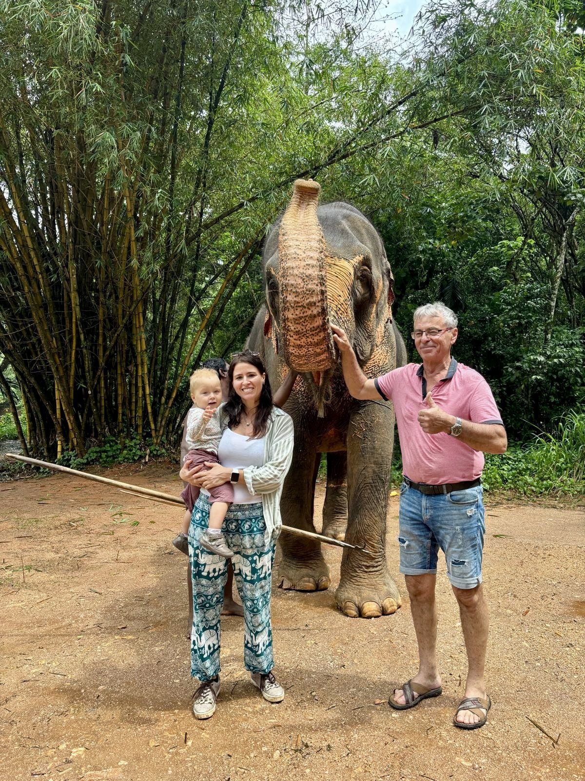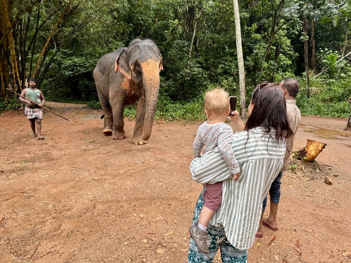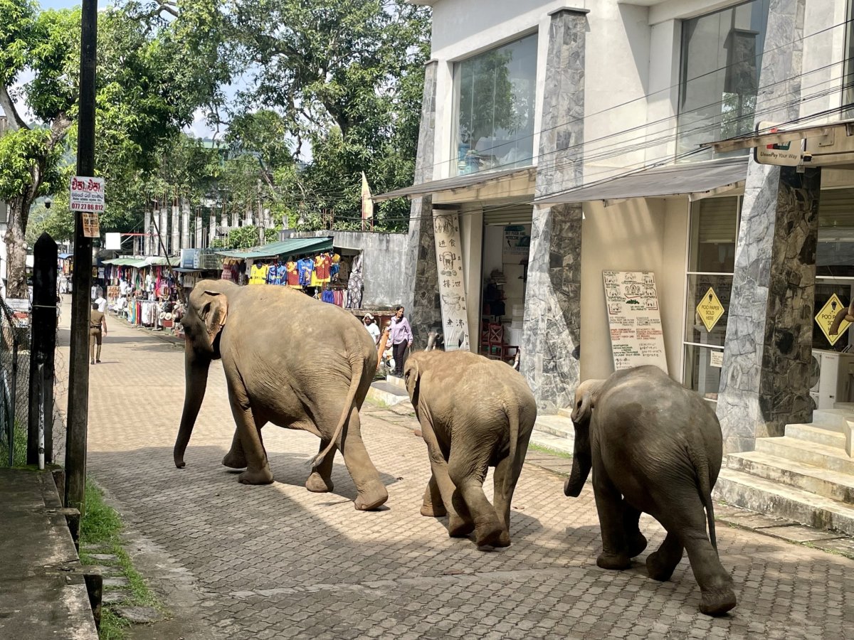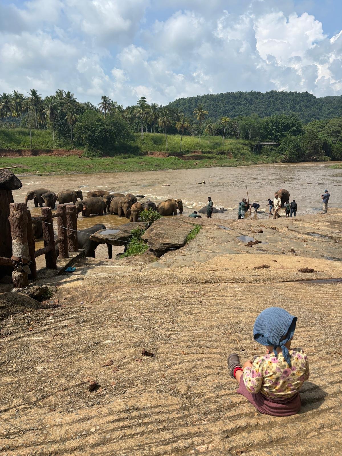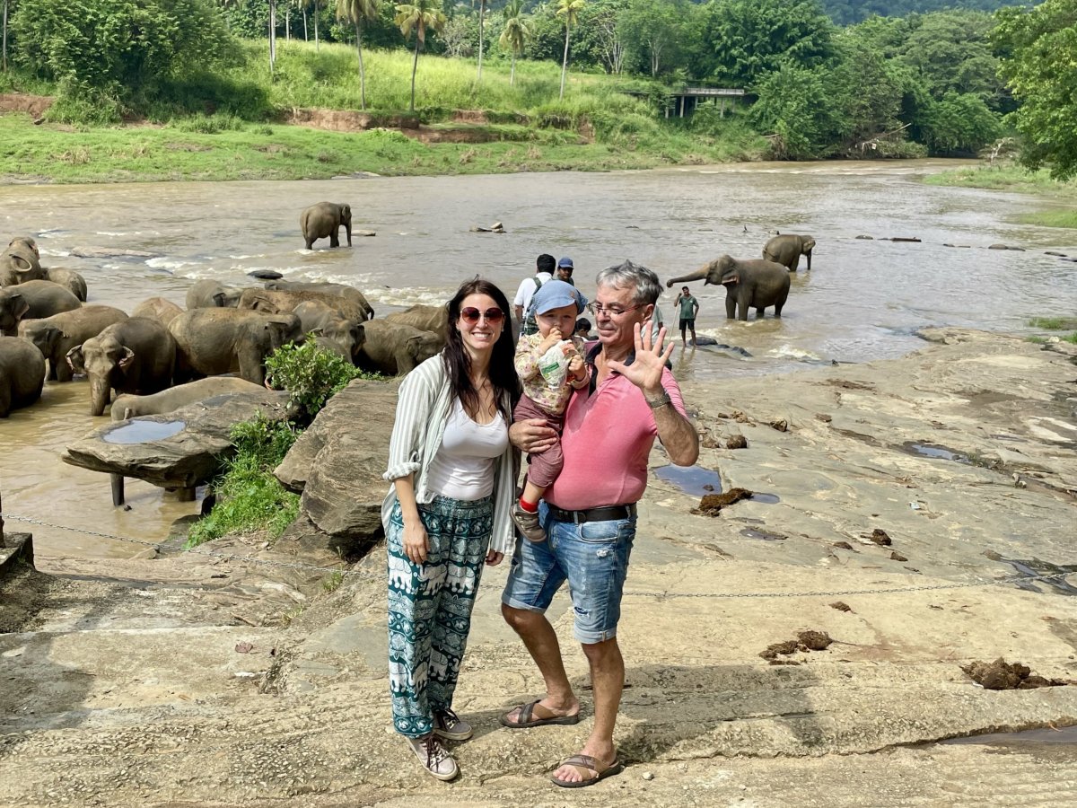 Ráno po snídani nás Malith čeká před hotelem už sám. Původně měl Nuwan jako průvodce jet celou dobu s námi, ale kvůli pohodlí (měli jsme svoji autosedačku a mačkat se ve třech vzadu bylo nekomfortní) jsme se dohodli, že zůstane doma se svou tříletou dcerkou. Společně jdeme do sloního sirotčince, kde kupujeme lístky (asi 350 Kč/osoba) a pozorujeme jak si zvířata v klidu užívají výběh. Vypadají spokojeněji než ti včera, a já mám z návštěvy lepší pocit. Před desátou se přesunujeme směrem k řece, protože se celé stádo vydává na svou ranní koupel. Pozorovat průvod těchto tvorů vesnicí je neuvěřitelné. Jsme jim tak blízko, že nám jeden začne šátrat chobotem v batohu. Já se leknu, strhávám Em z dosahu tak prudce, až si roztrhnu své usmlouvané kalhoty pěkně mezi nohama. Když mě na to milá paní z butiku taktně upozorní, udělám jí tržbu a kupuju nové za třetinu ceny těch původních. A k tomu přidáme i košili pro Laďu.