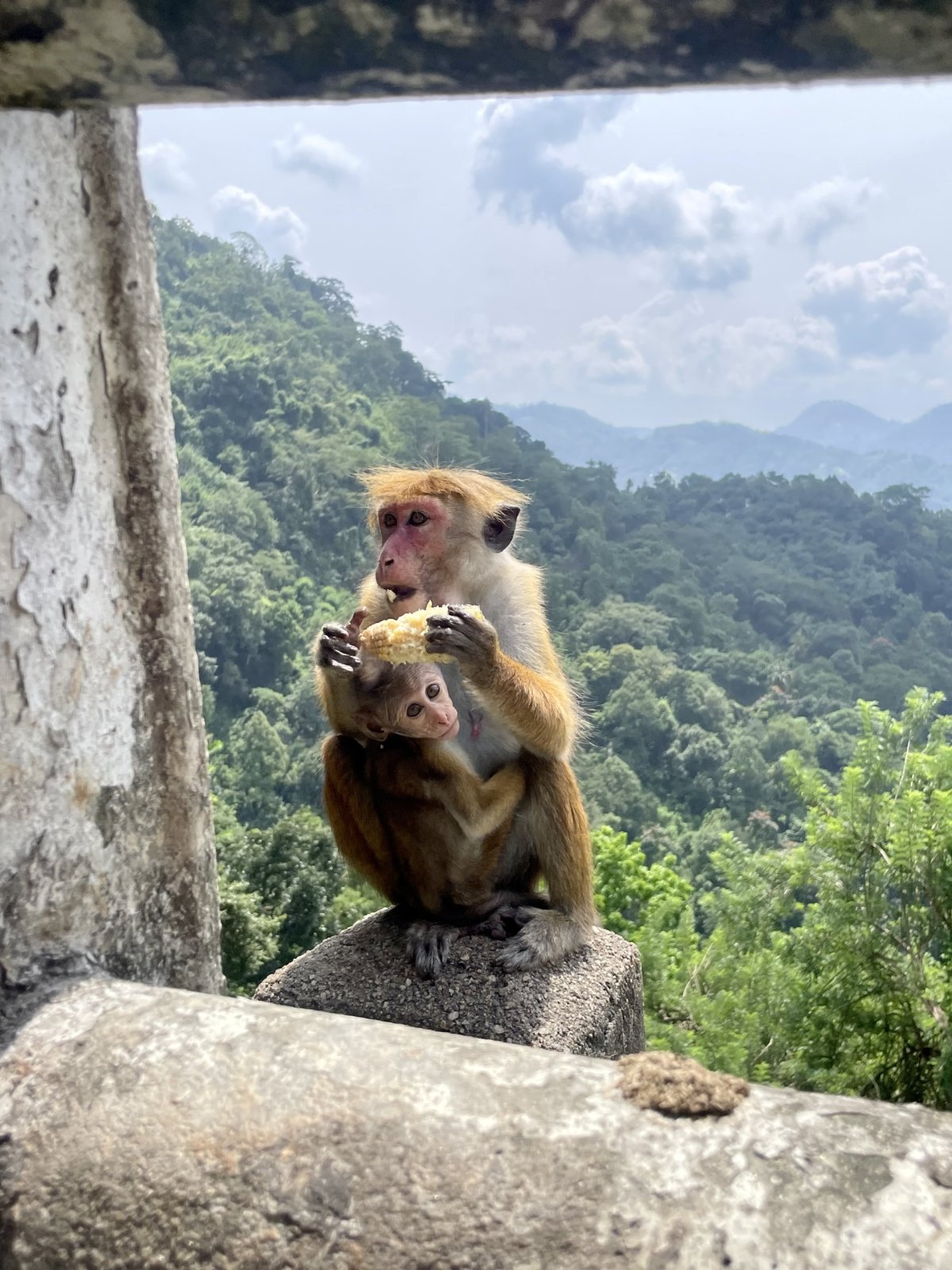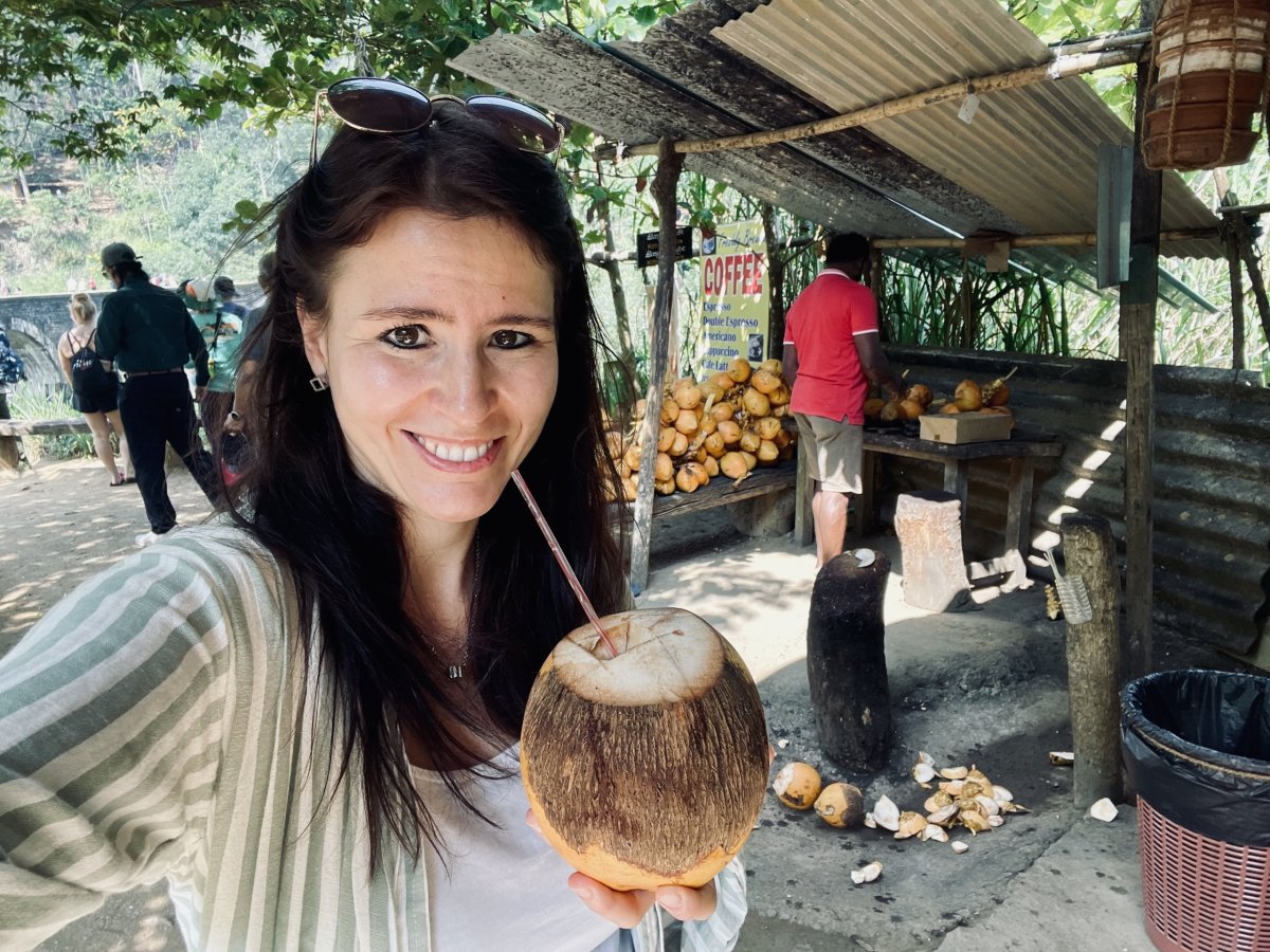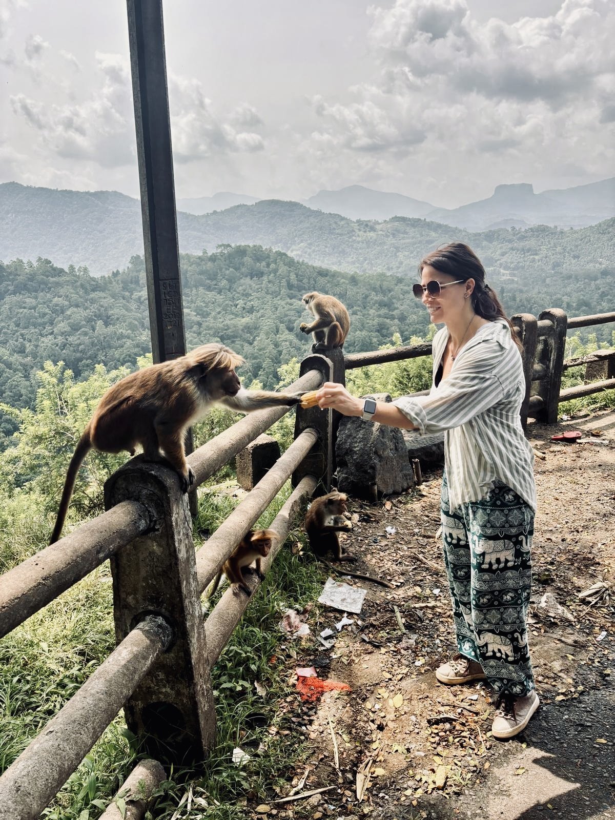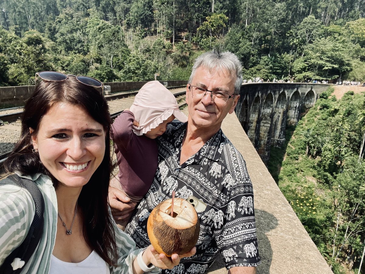 Ráno nás čeká největší atrakce v okolí - Nine Arch Bridge. Od rozcestí, kde nás Malith vyhodí, je to tak půl hoďky pěšky nebo pár minut tuktukem. My volíme procházku, tak aspoň nepřijdeme o poskakující opice mezi stromy, na kterých v trsech rostou soursopy. Nebo dragoun fruity - vypadají totiž úplně stejně. Vlak ikonicky přejíždějící přes most ale nestíháme asi o 30 sekund, vidíme už jen vzdalující se jeho ocas. Občerstvíme se čerstvým kokosem a jdeme zase zpátky. V tom horku a s naší opičkou na zádech je ale ta zpáteční cesta do kopce nějaká delší. Jestli mě předtím mrzelo, že jsme odpískali výstup na Little Adam’s Peak, tak teď už fakt ne.